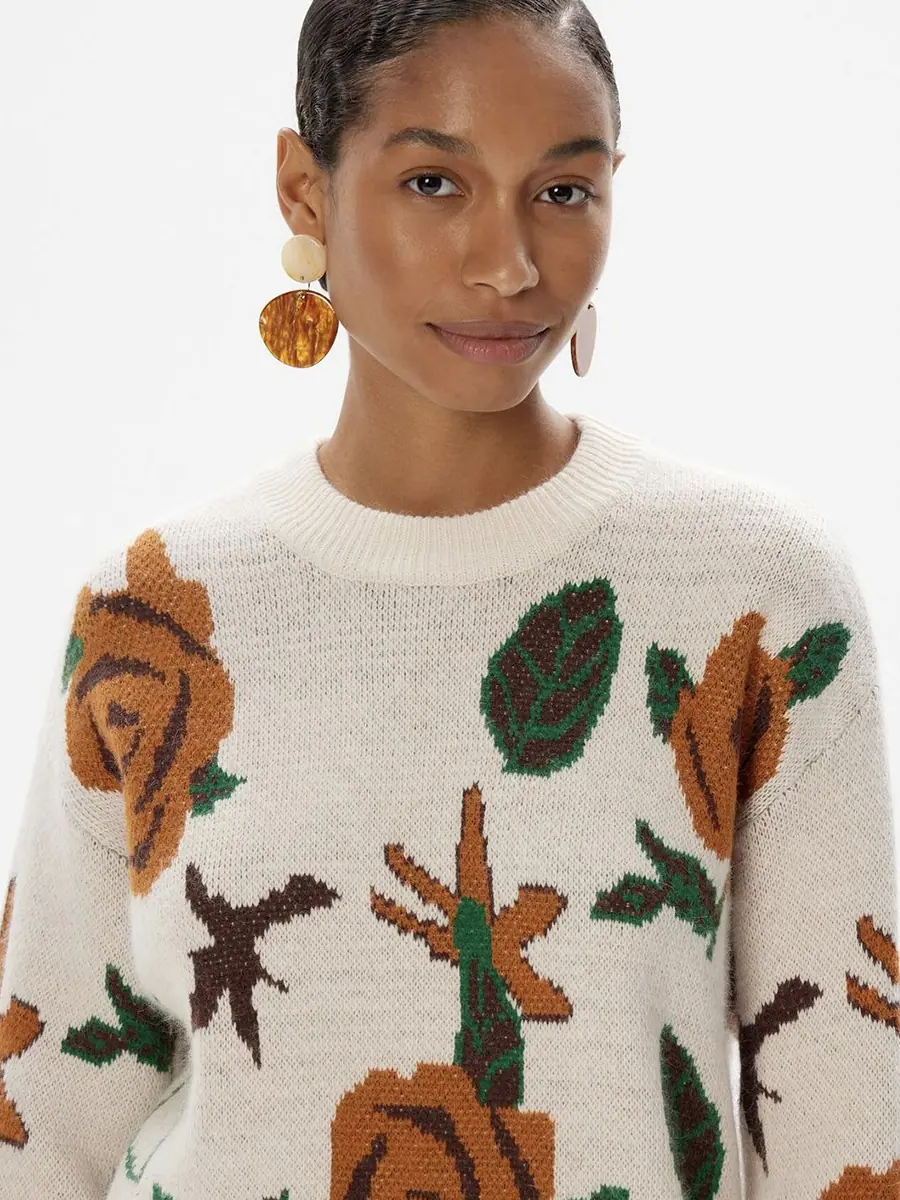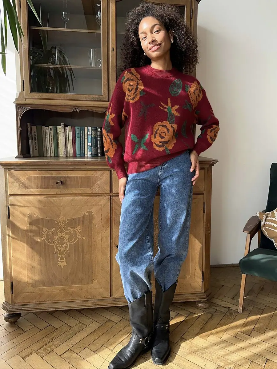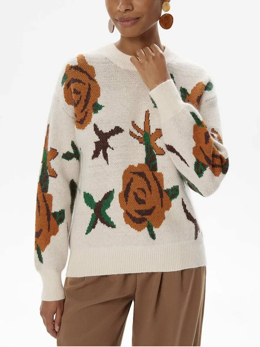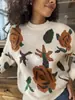2025 Europeo y Americano Nuevo Tejido de Punto de Cuello Redondo para Mujer Jersey Estilo Lazy Flor Tejido Invierno Suelto Tejido de Punto Francés