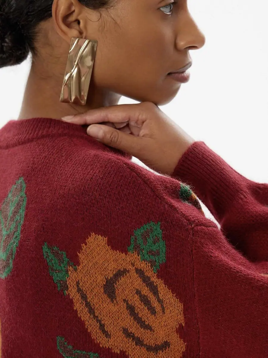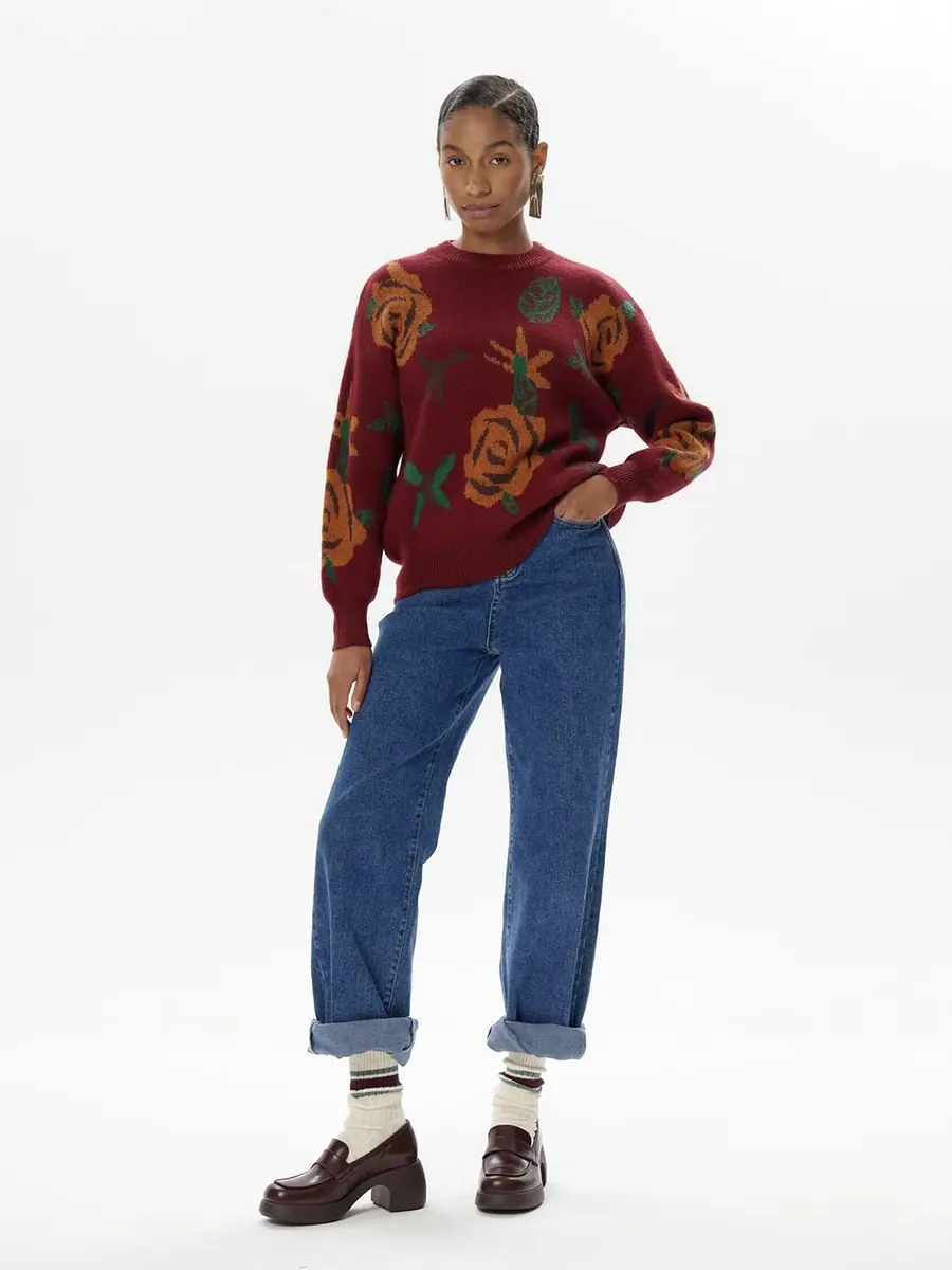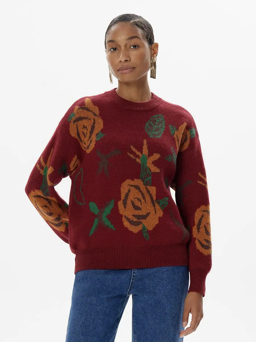 2025 Europeo y Americano Nuevo Tejido de Punto de Cuello Redondo para Mujer Jersey Estilo Lazy Flor Tejido Invierno Suelto Tejido de Punto Francés