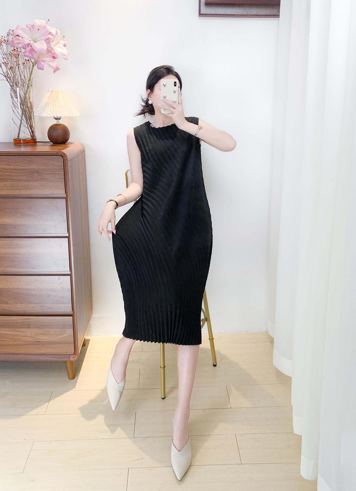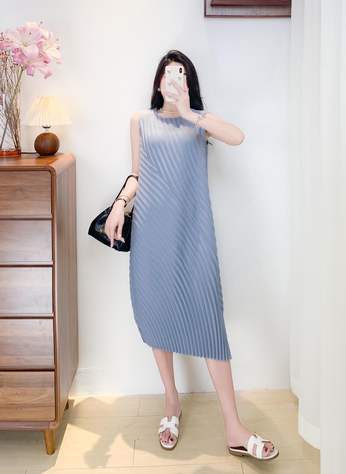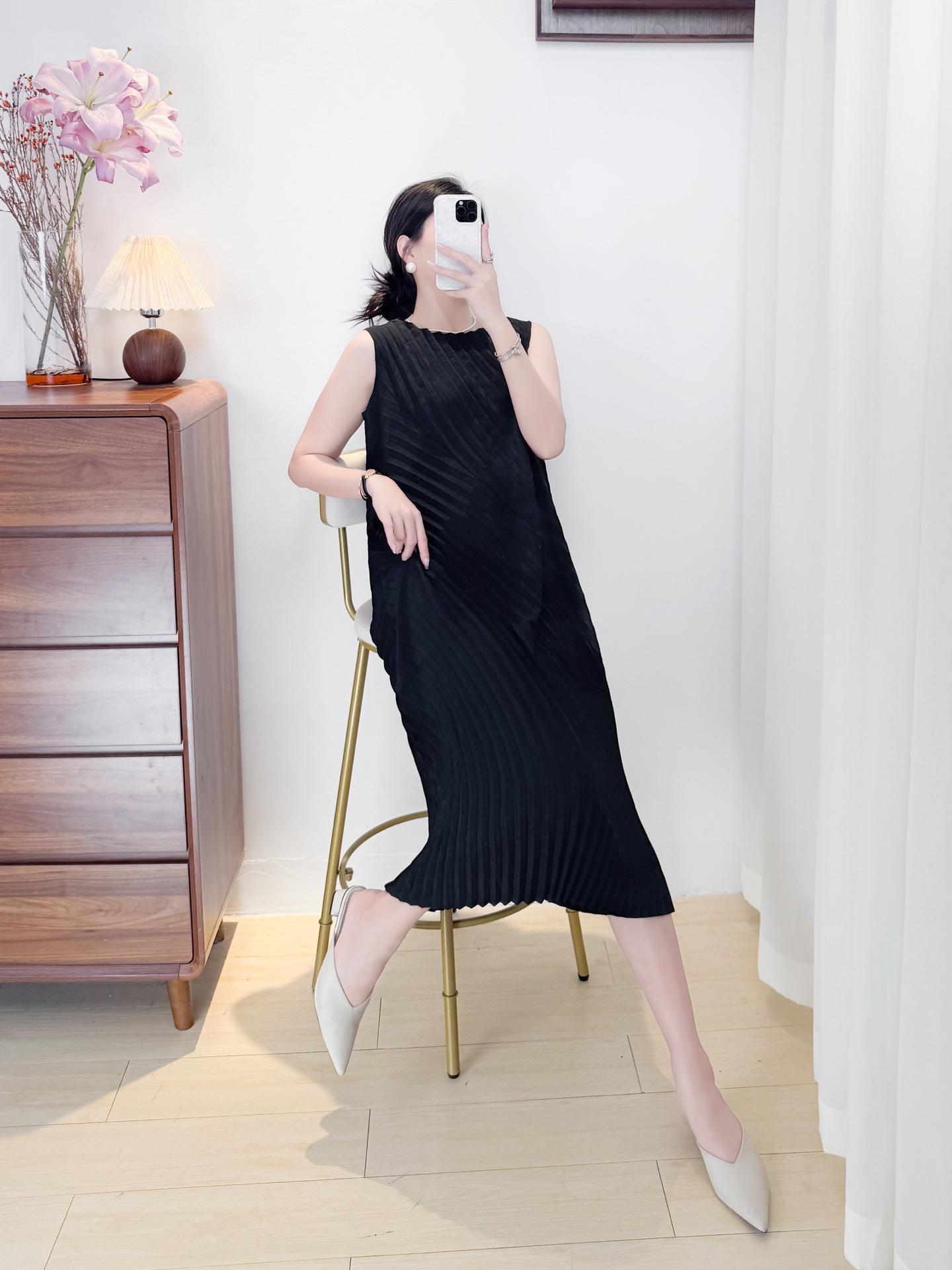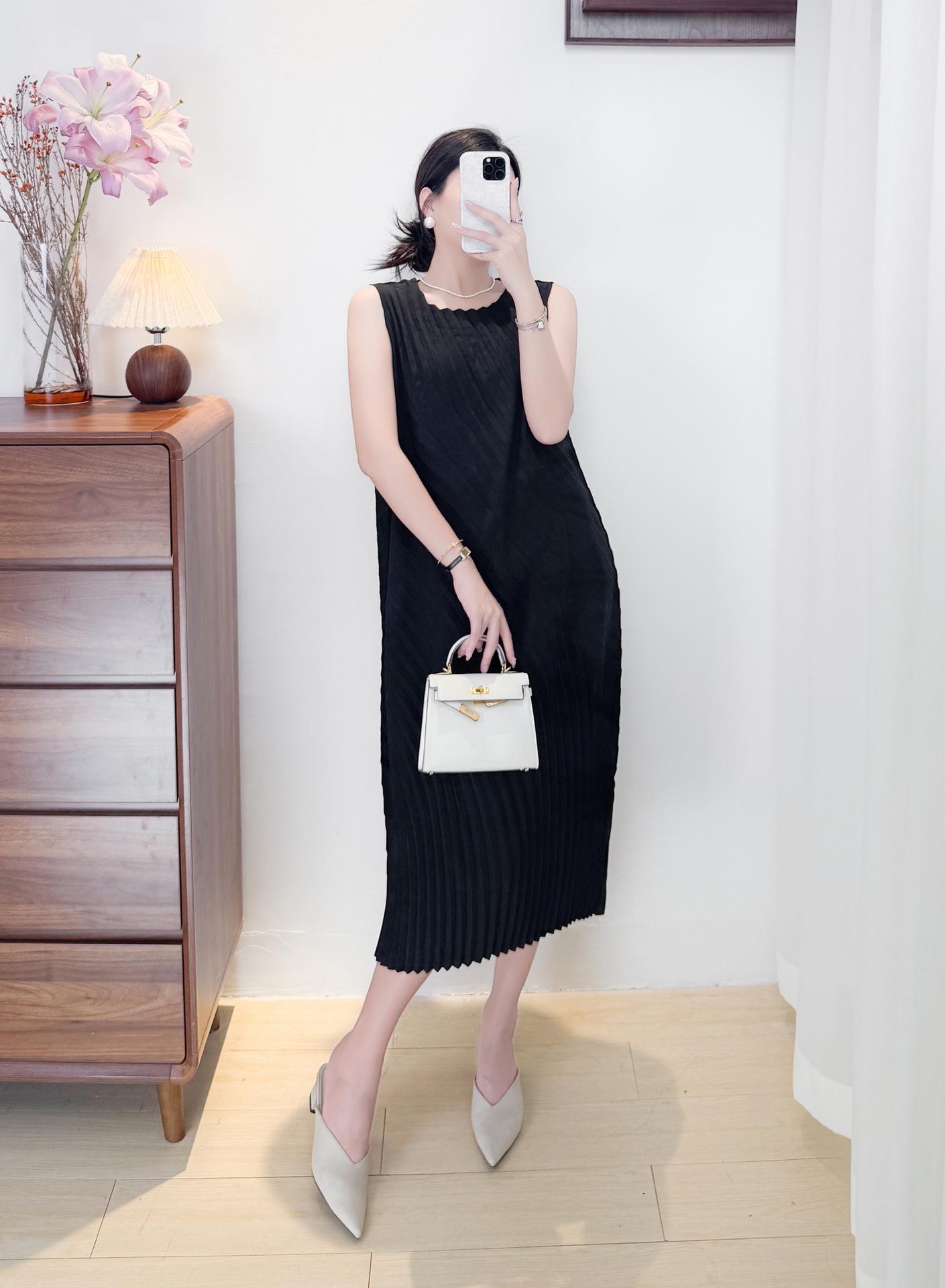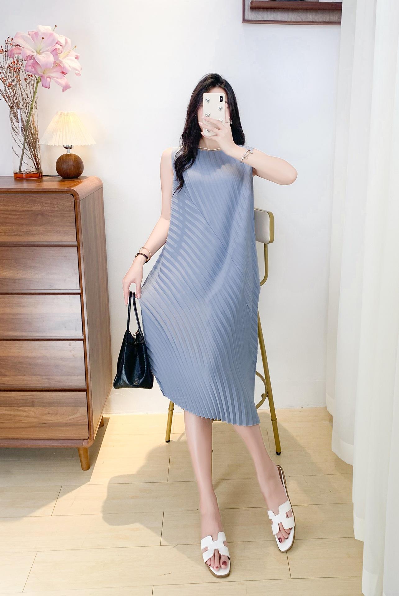Vestido Plisado Miyake Sin Mangas Casual Cuello Redondo Suelto Elegante Verano Midi Elegante Delgado Elegante Falda Larga