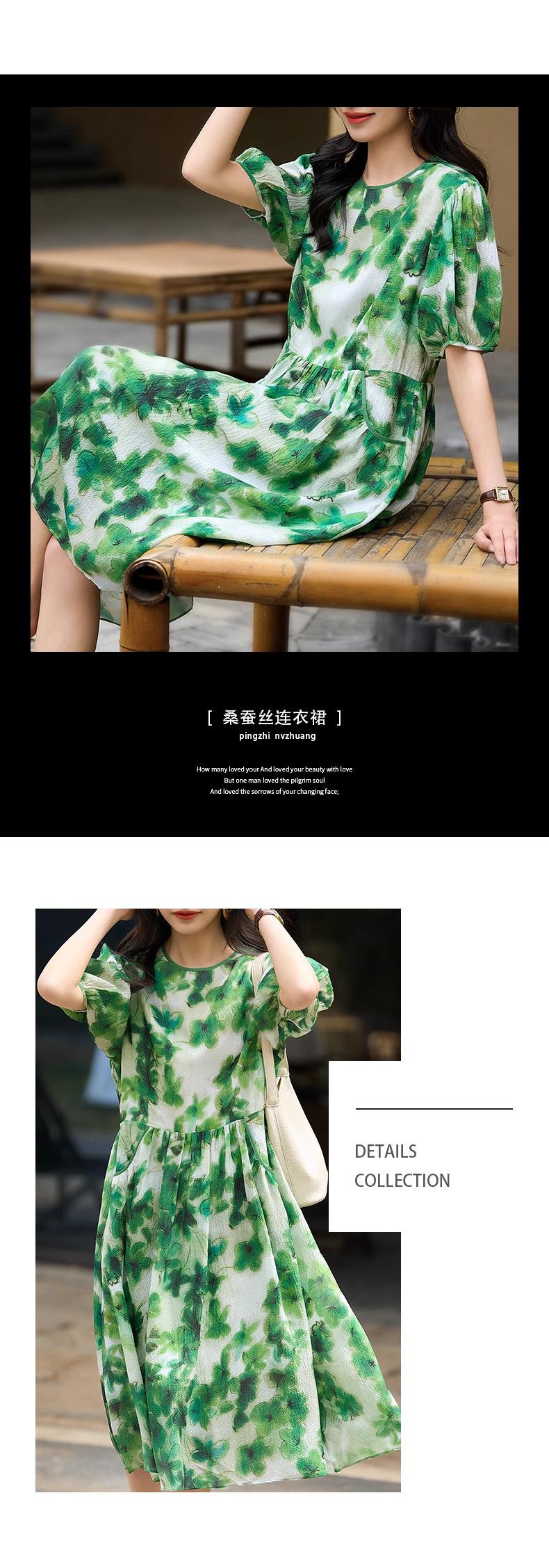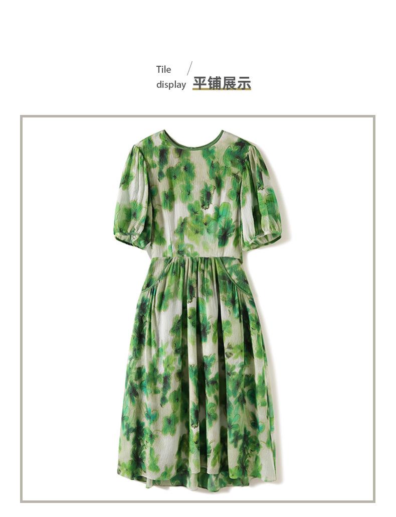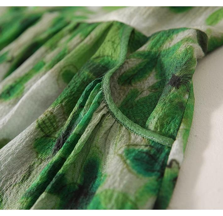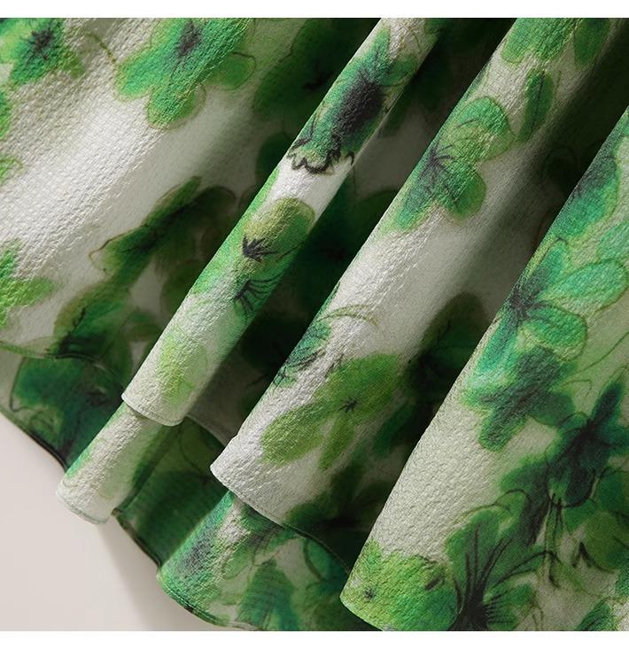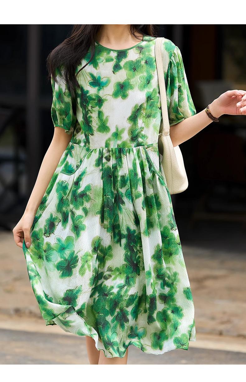 Vestido Romántico de Flores Estilo Vacacional de Alta Gama Seda de Morera Falda de Seda Floral Verde Cuello Redondo Verano de Mujer