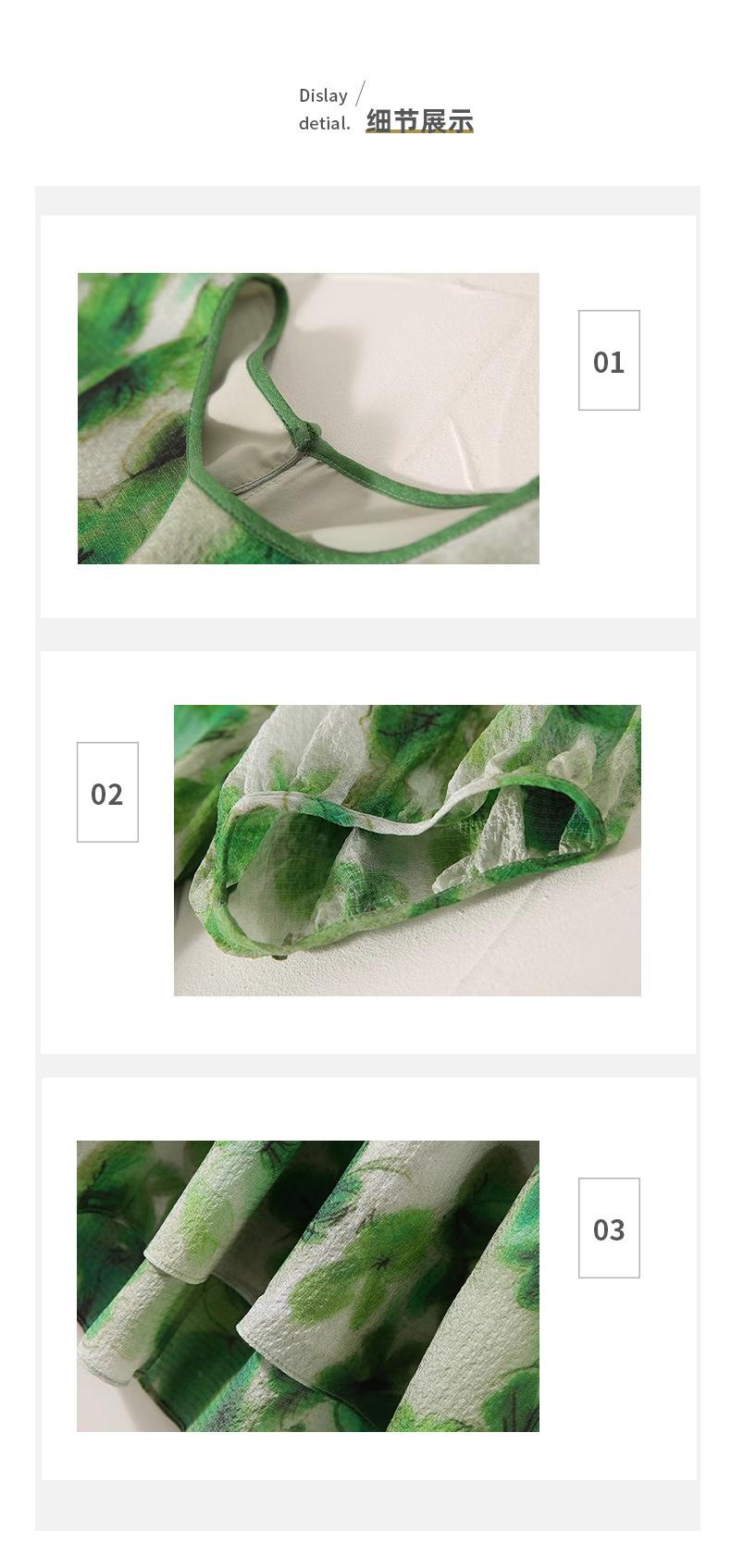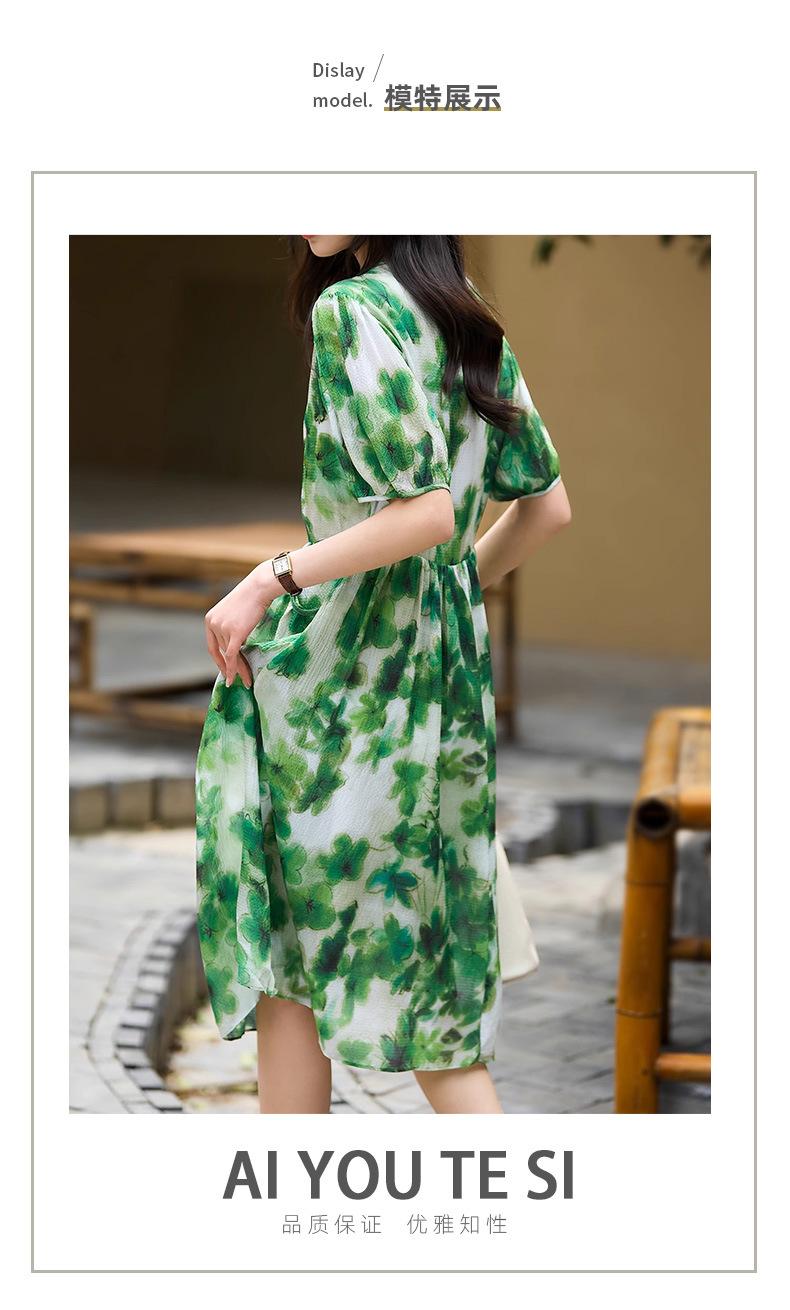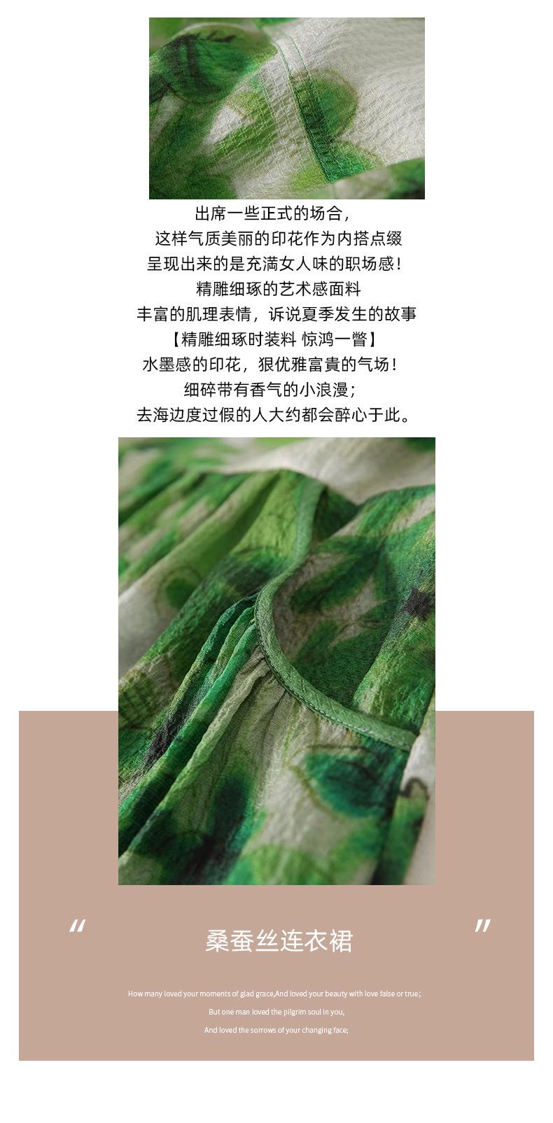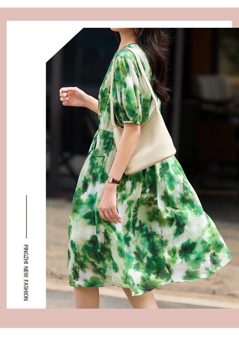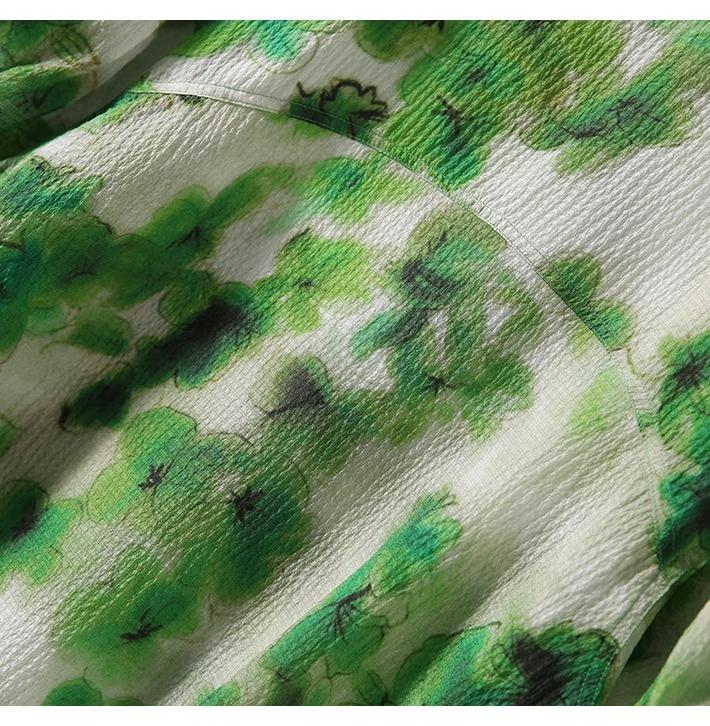 Vestido Romántico de Flores Estilo Vacacional de Alta Gama Seda de Morera Falda de Seda Floral Verde Cuello Redondo Verano de Mujer