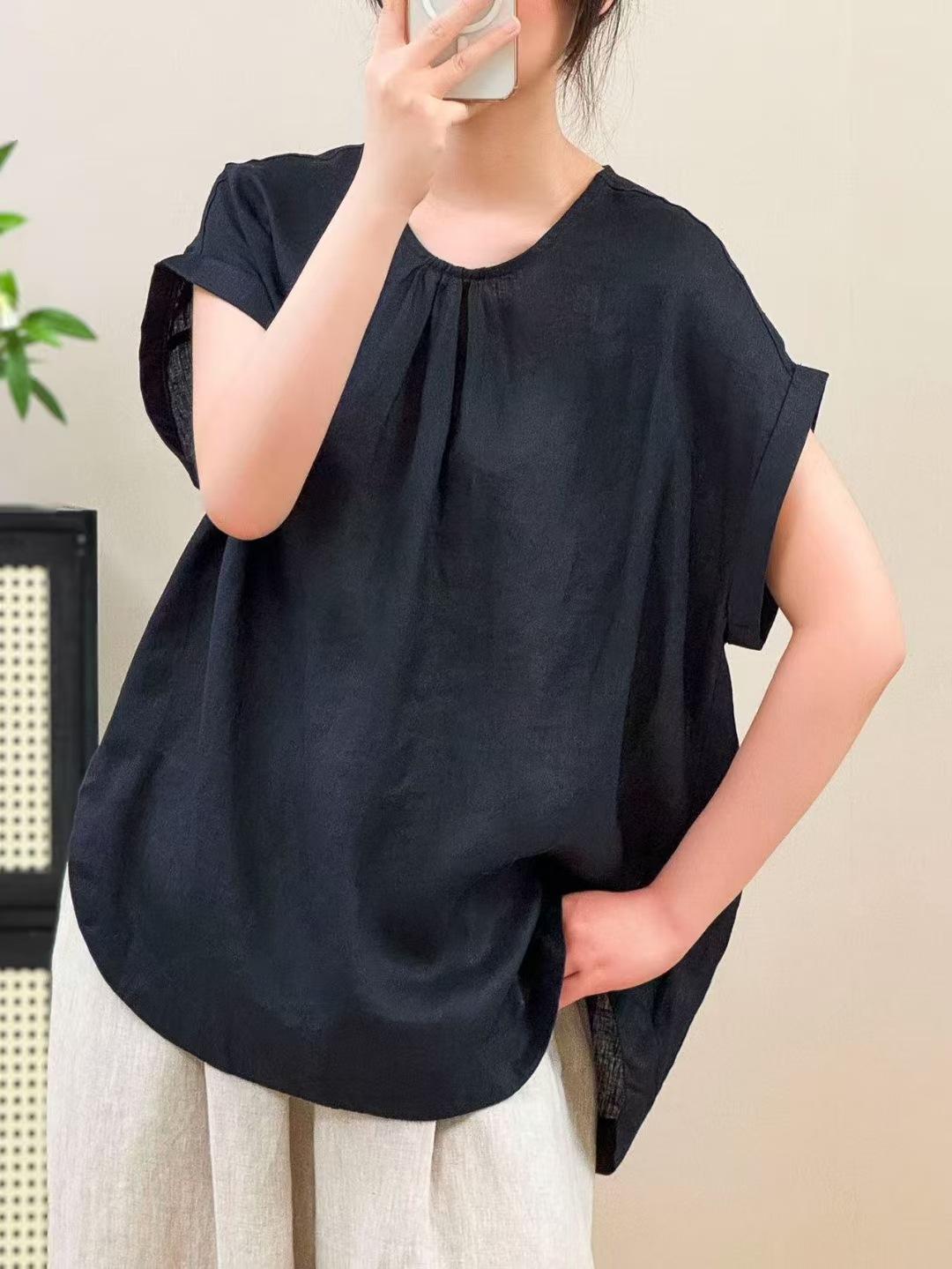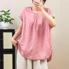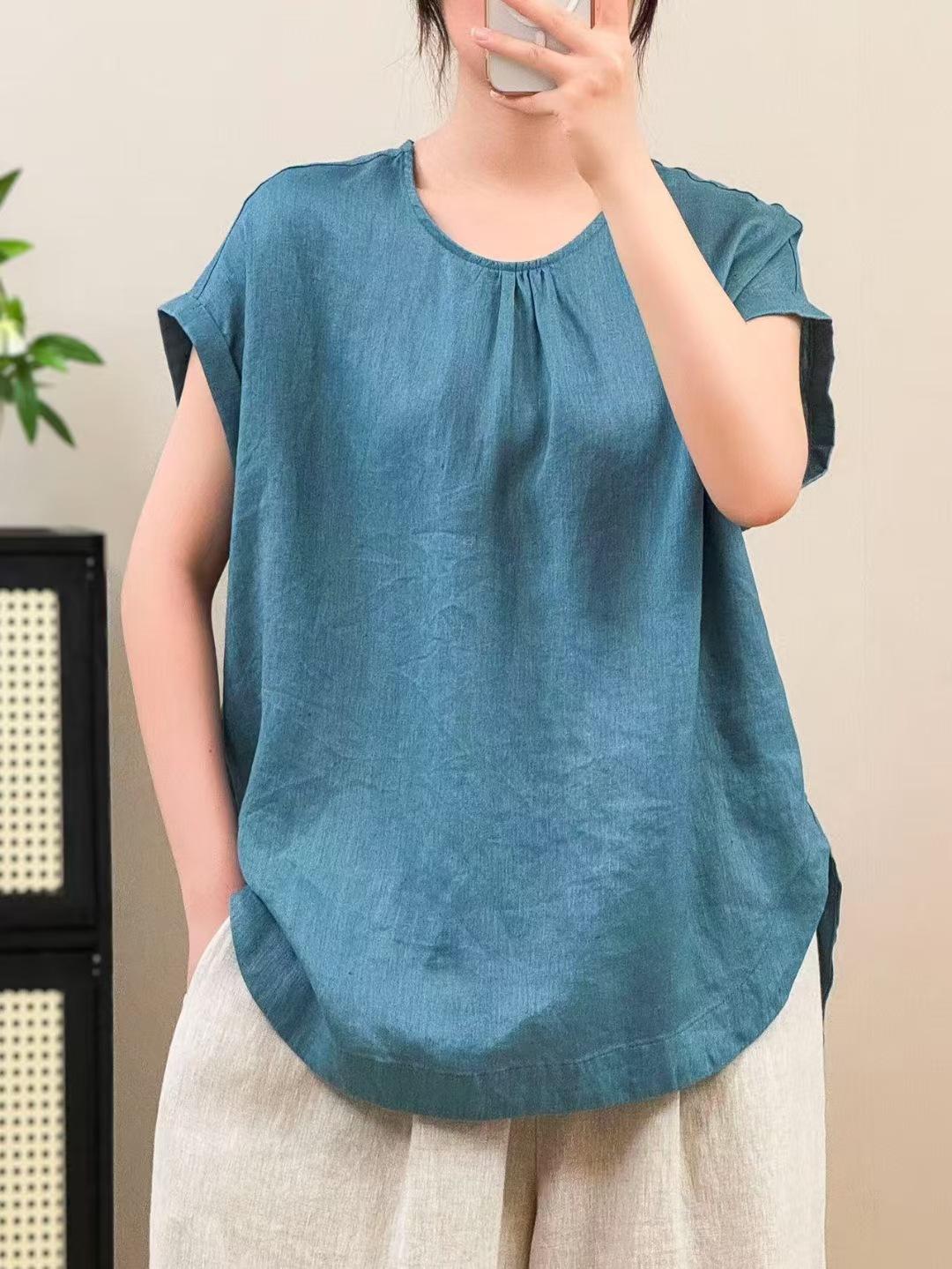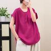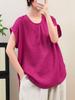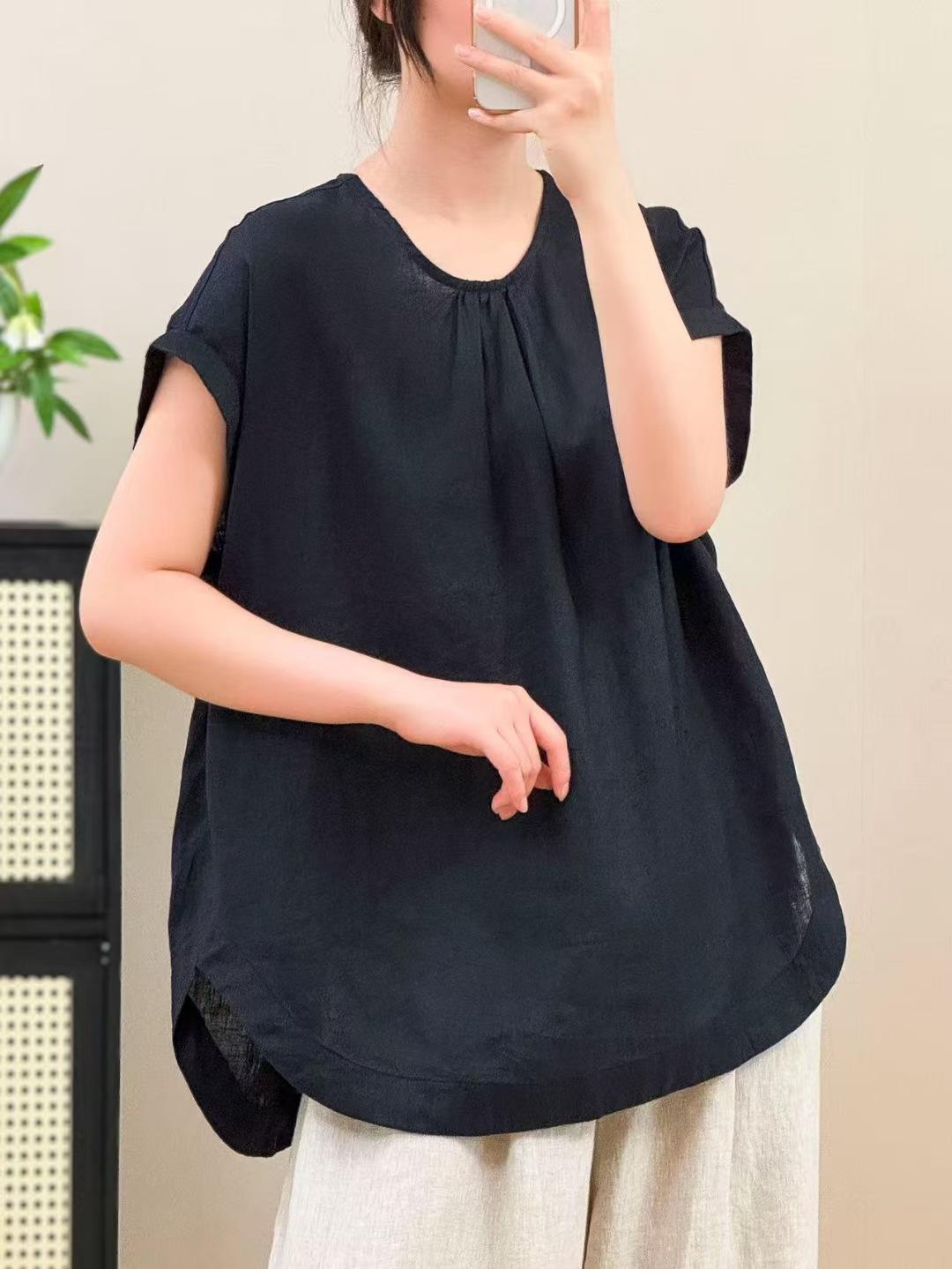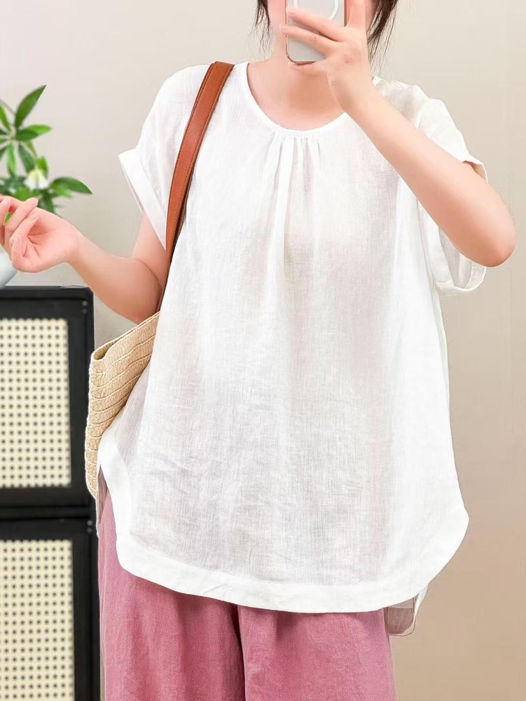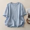 Camisa Lisa de Lino 2025 Verano Nuevo Estilo Artístico Pulóver Cuello Redondo Versátil Camisa de Manga Corta