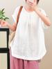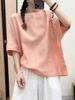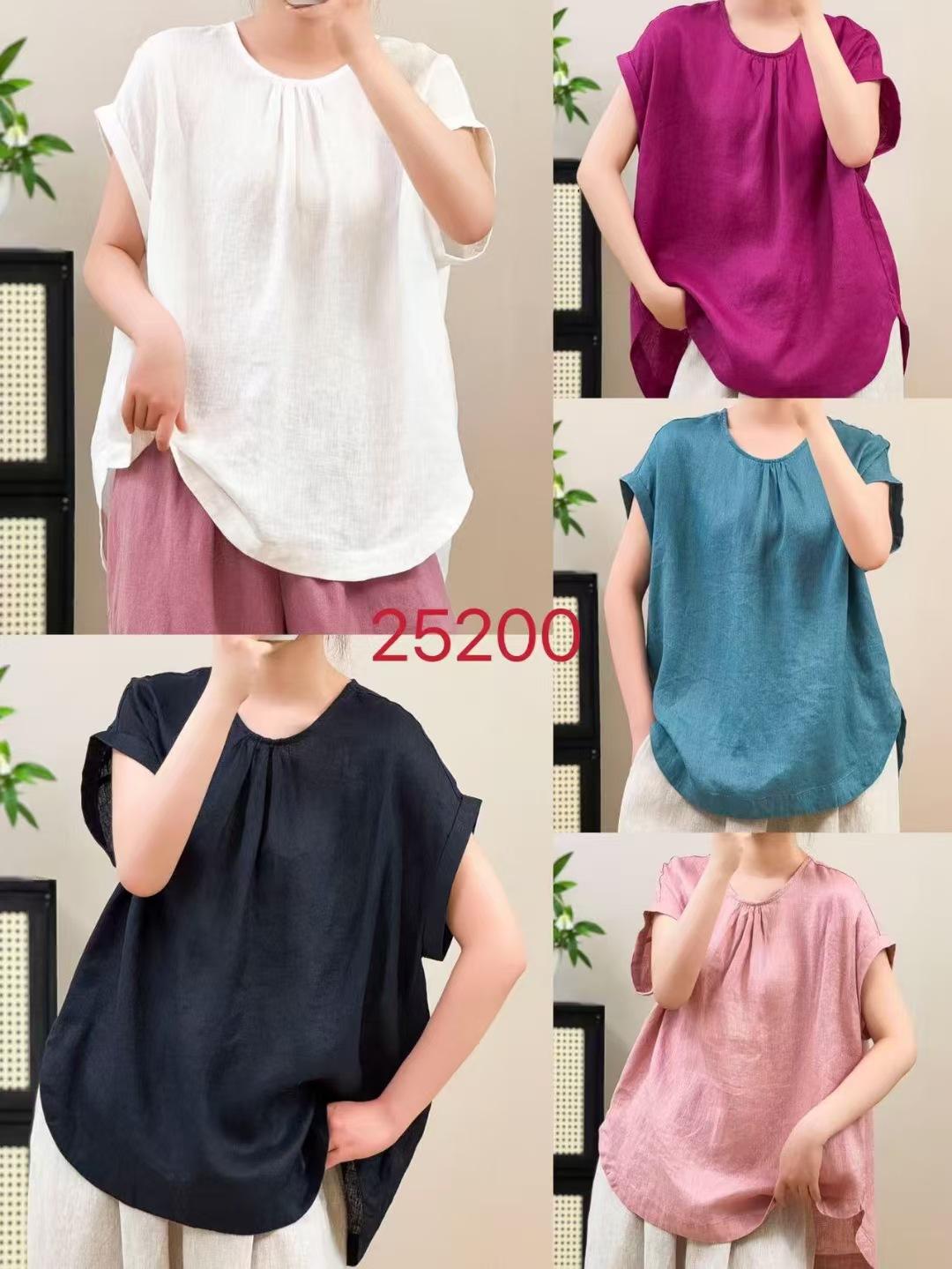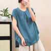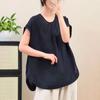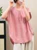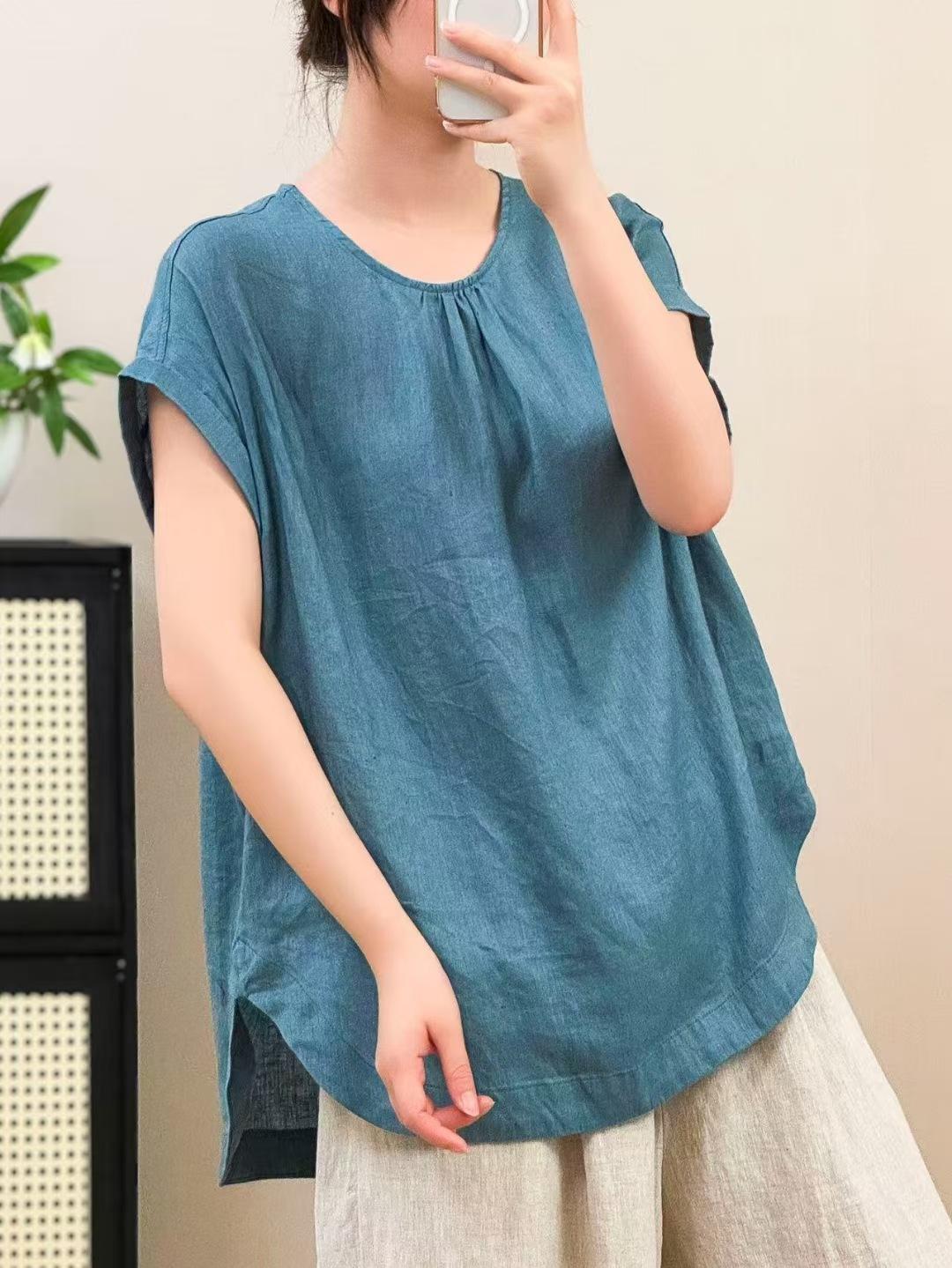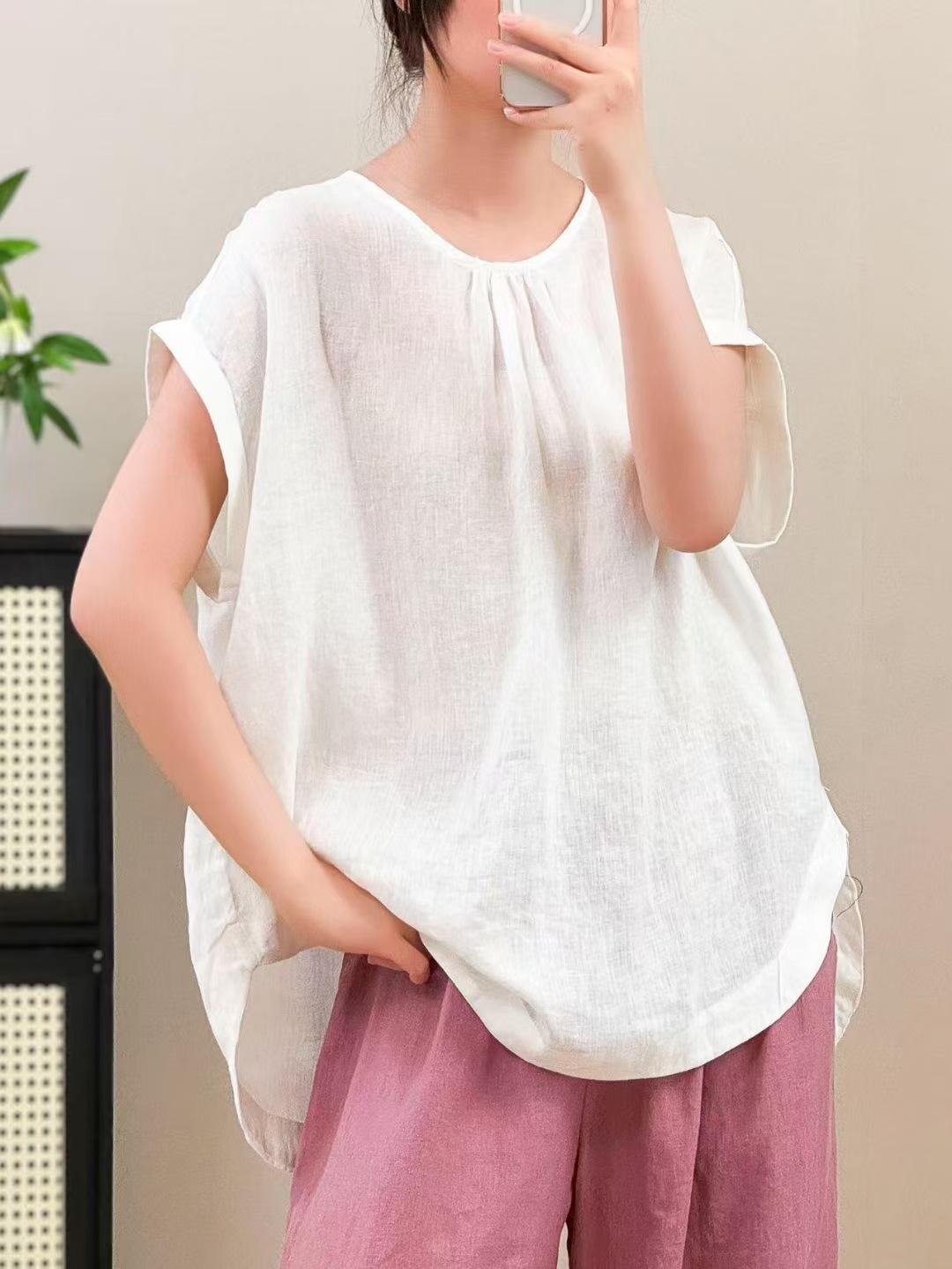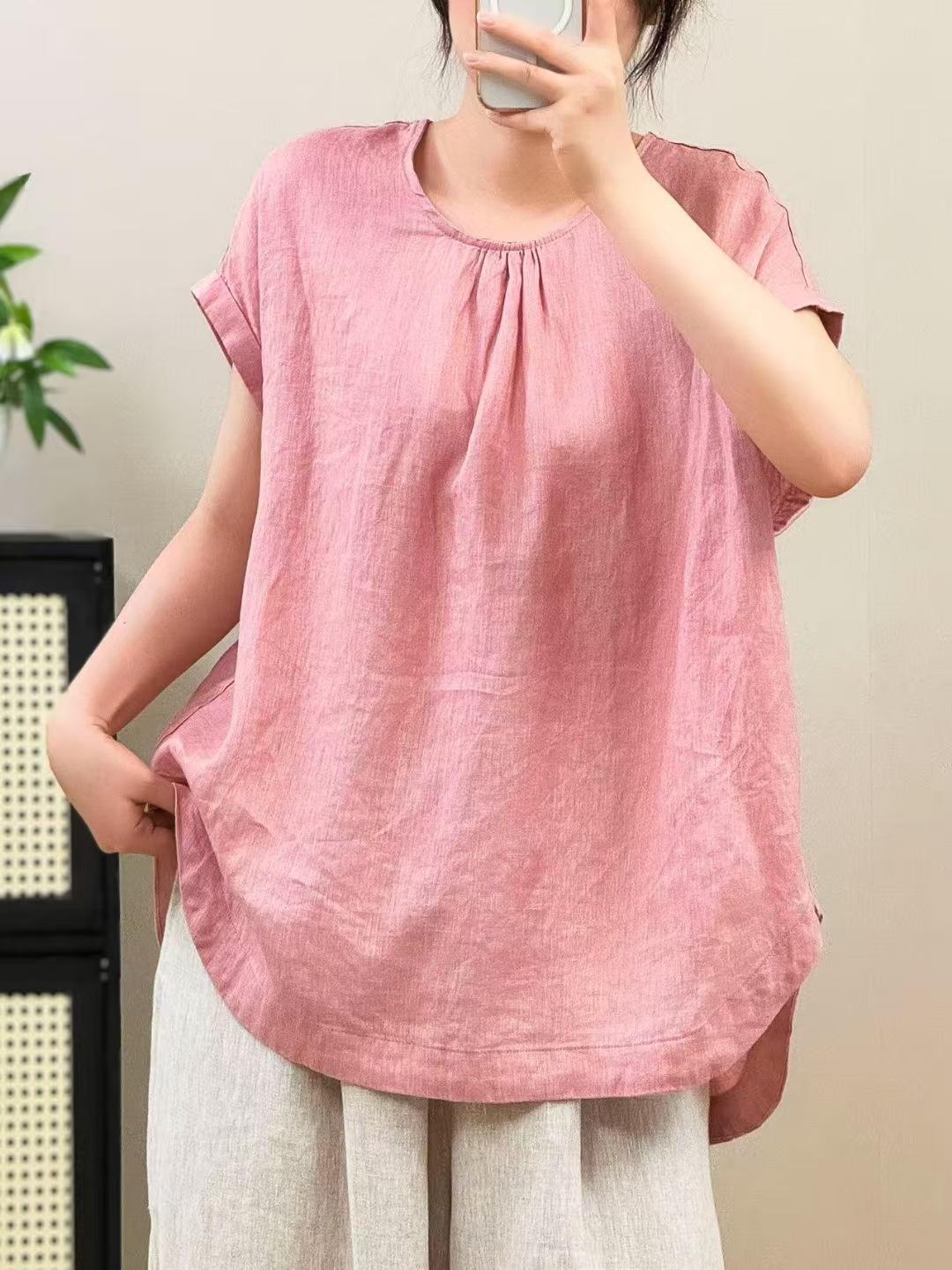 Camisa Lisa de Lino 2025 Verano Nuevo Estilo Artístico Pulóver Cuello Redondo Versátil Camisa de Manga Corta
