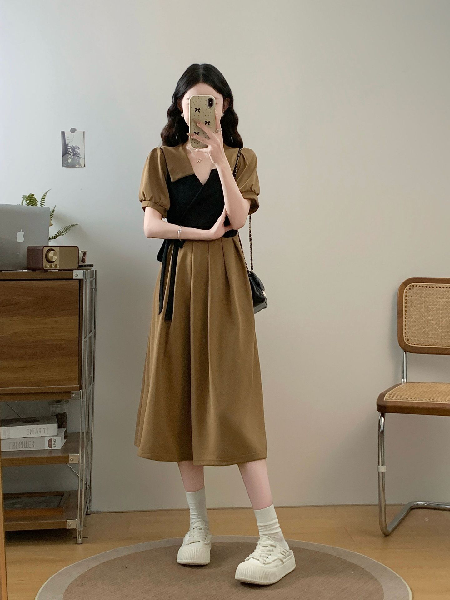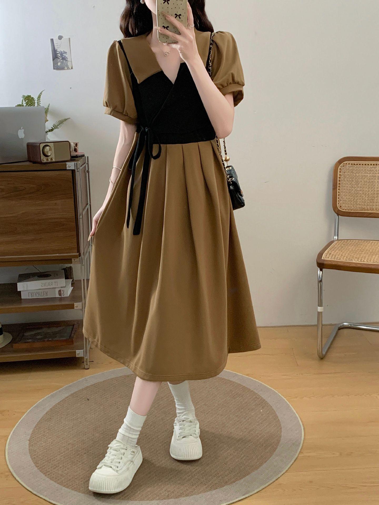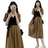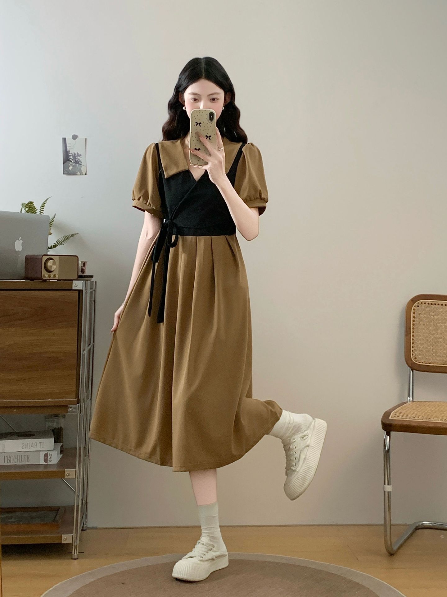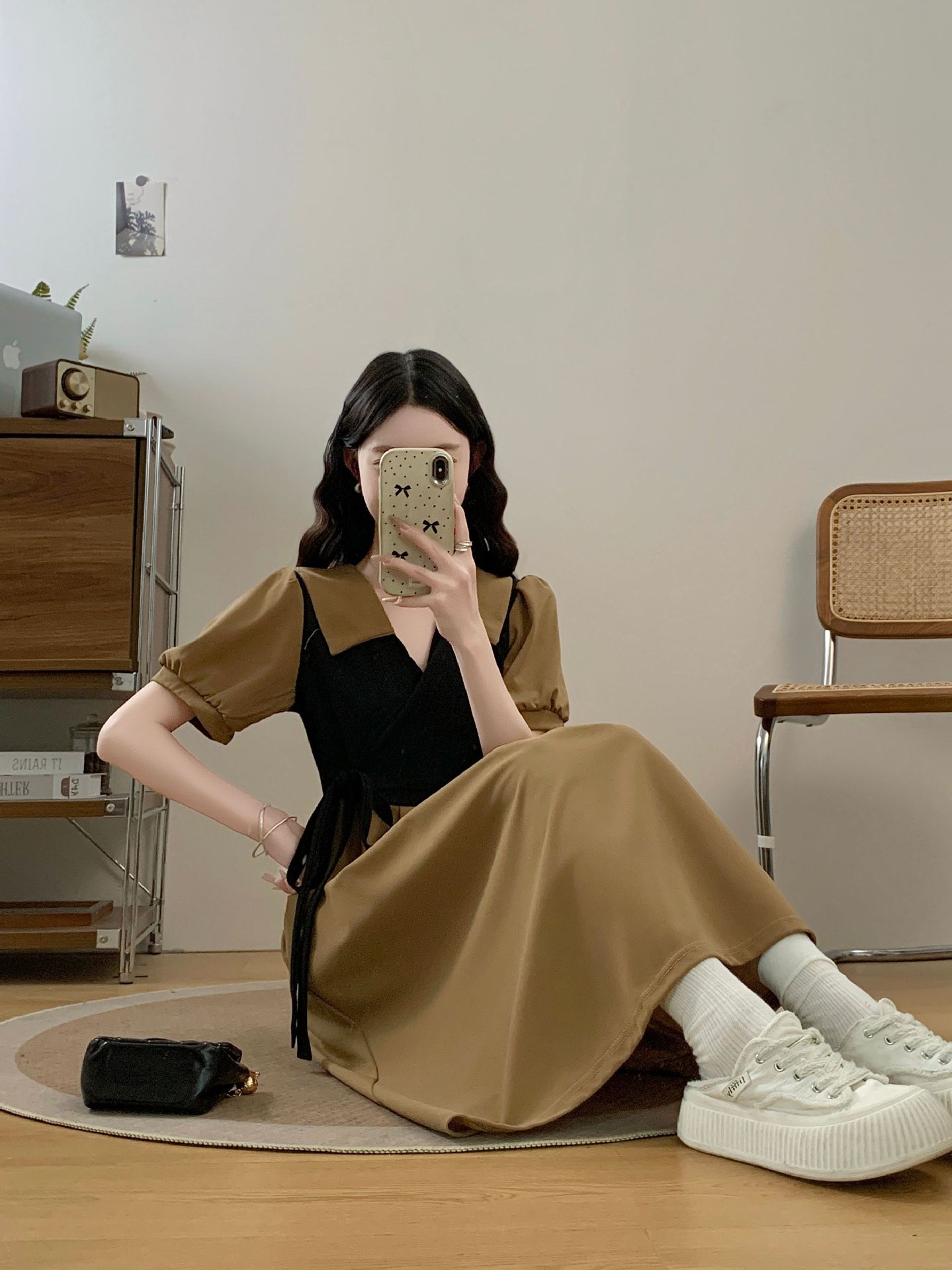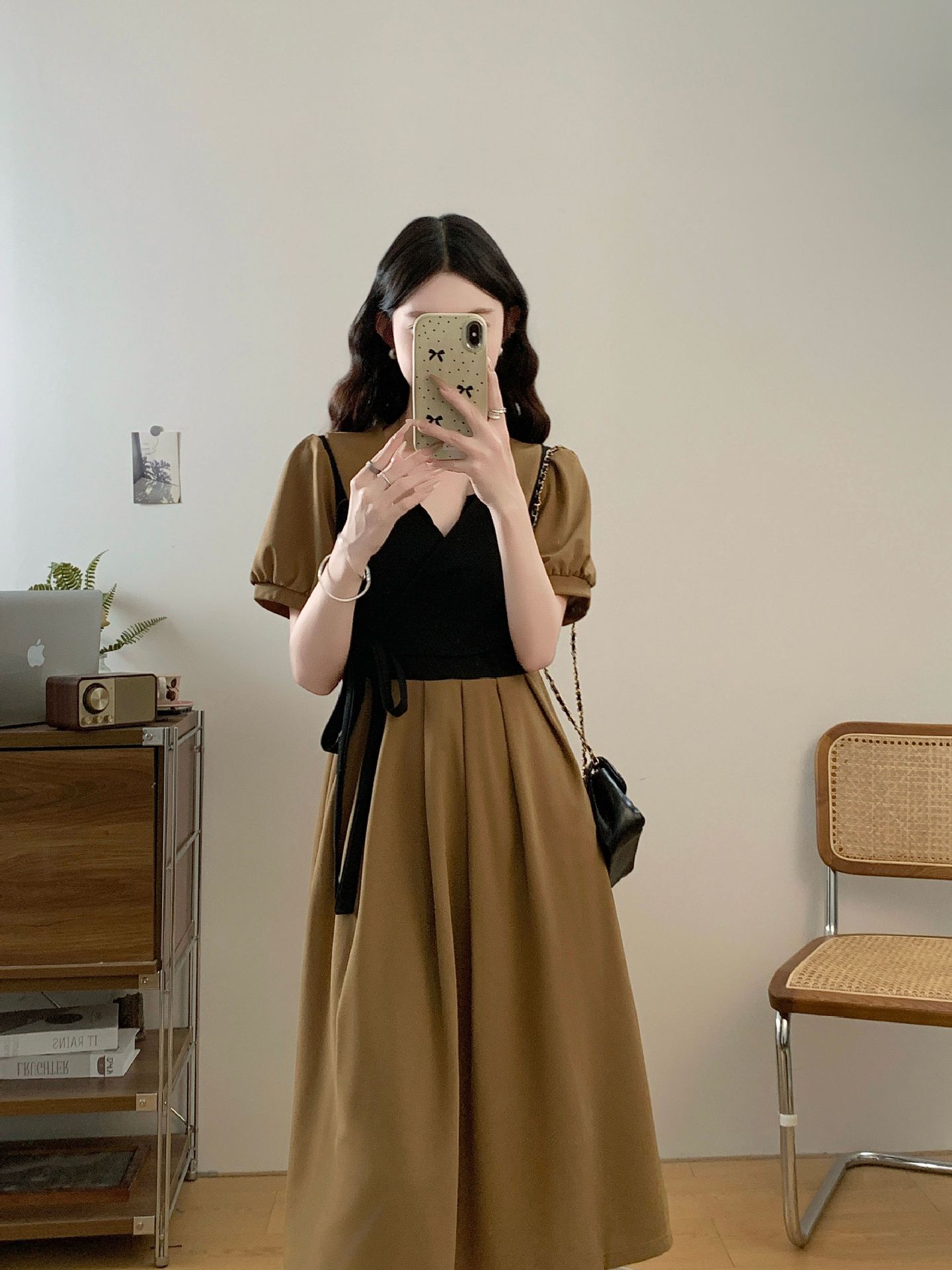 Vestido Francés de Estilo Ligero y Maduro de Dos Piezas Falsas para Mujer en Verano Estilo Coreano con Temperamento de Alta Gama y Falda Larga Retro Slim