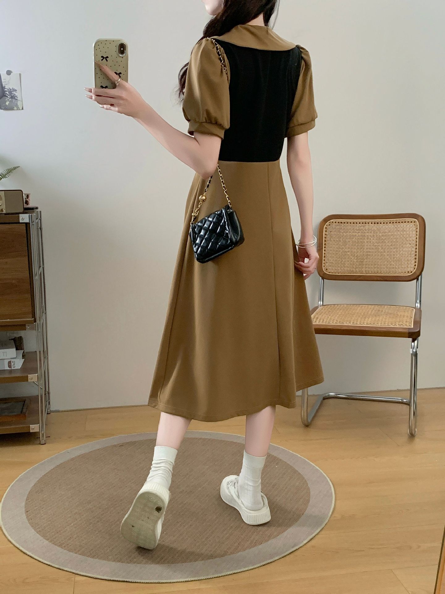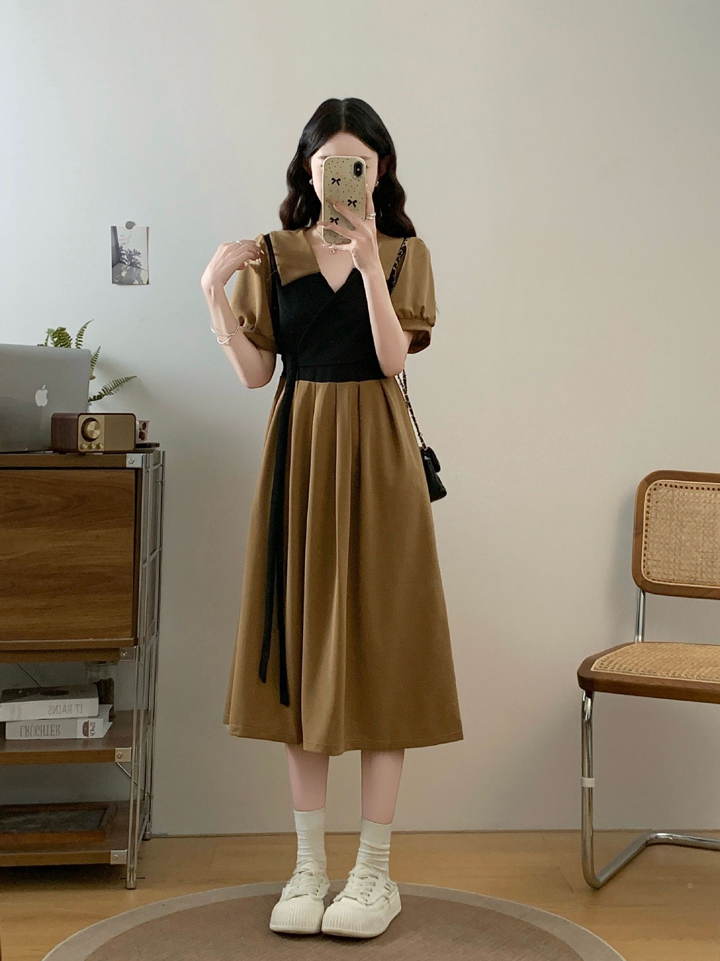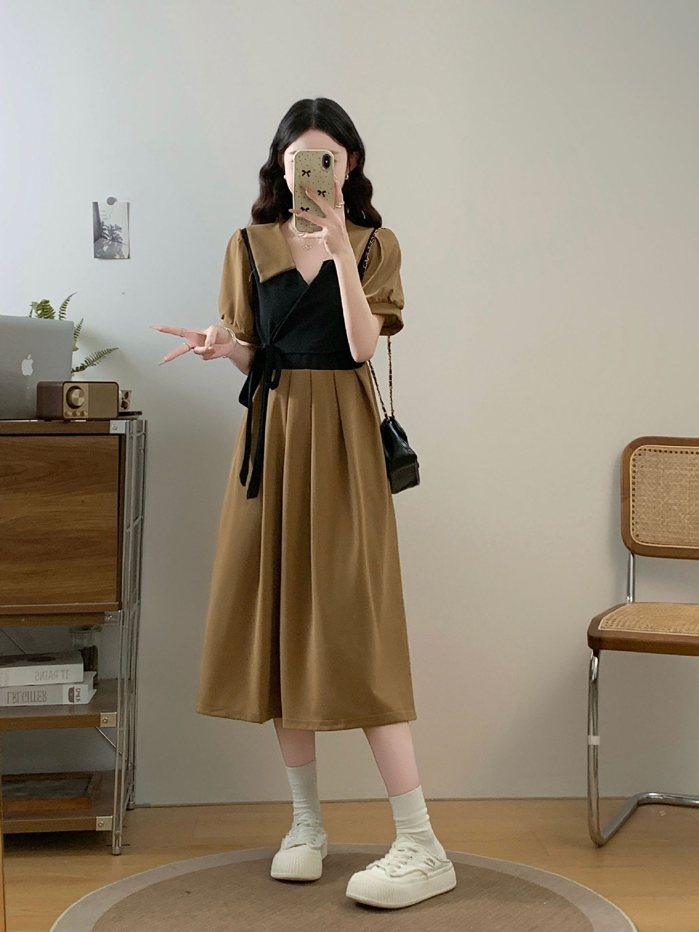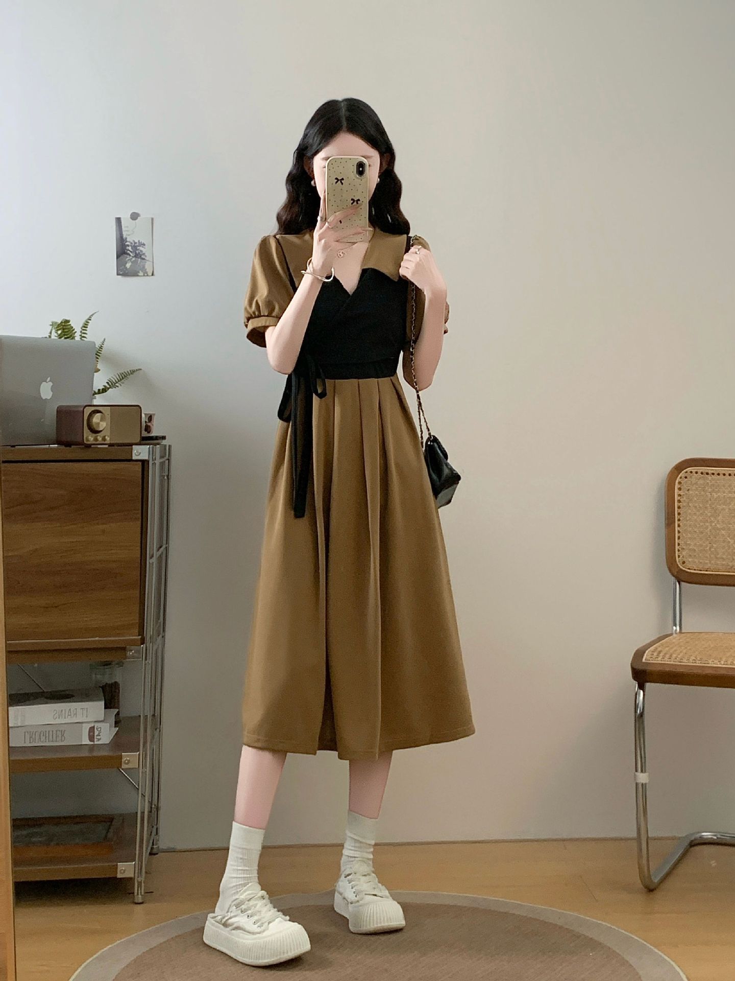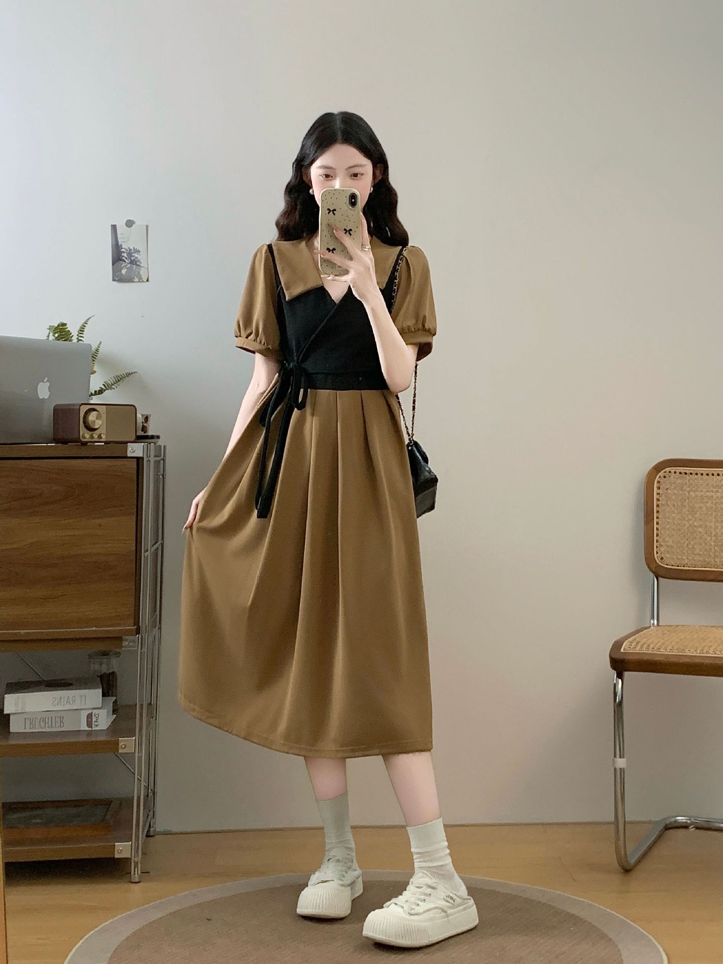 Vestido Francés de Estilo Ligero y Maduro de Dos Piezas Falsas para Mujer en Verano Estilo Coreano con Temperamento de Alta Gama y Falda Larga Retro Slim
