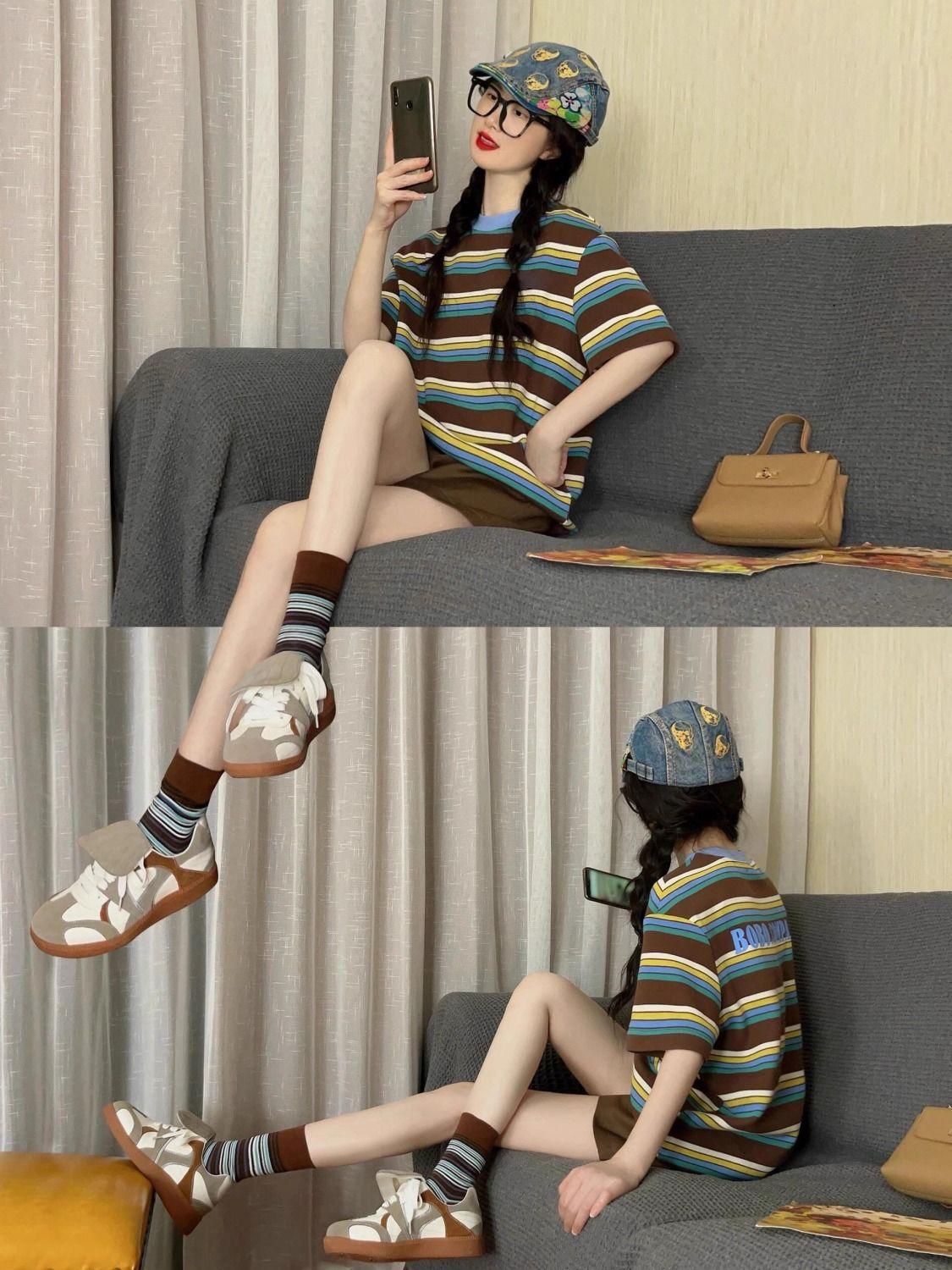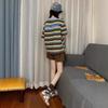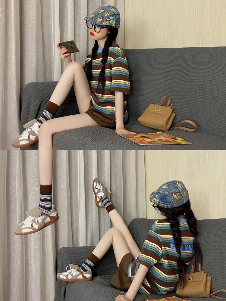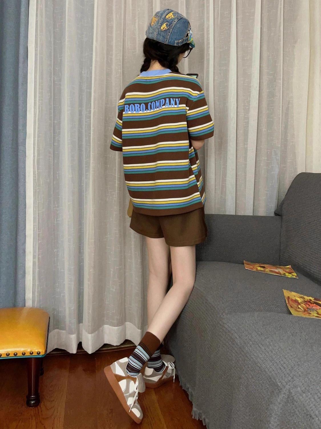Verano Nuevo Traje Deportivo Casual para Mujer a Rayas Moda Estudiantil Holgado Manga Corta Shorts Conjunto de Dos Piezas