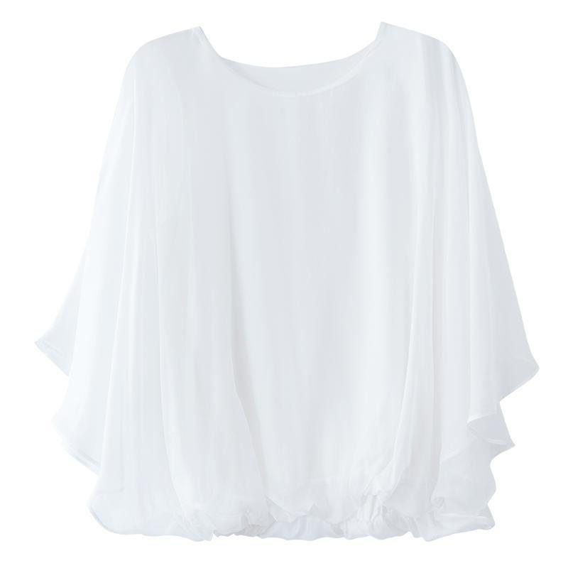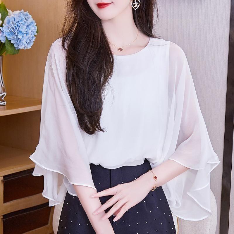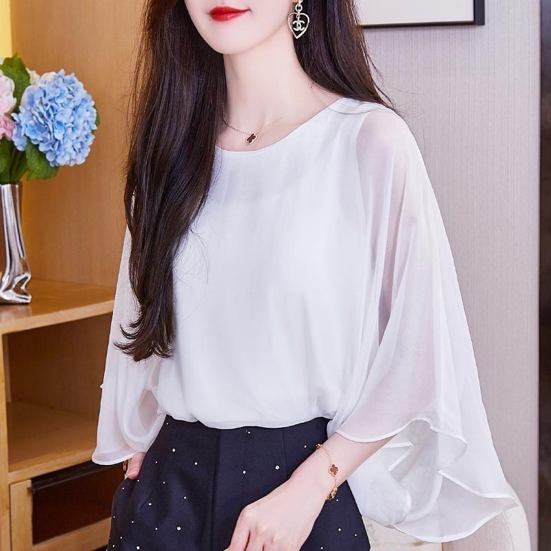 2025 Nuevo Chifón Manga Tres Cuartos Verano para Mujer Manga Murciélago Camisa Tops Cubre Carne Moderno y Elegante para Mujer Súper Hada y Versátil