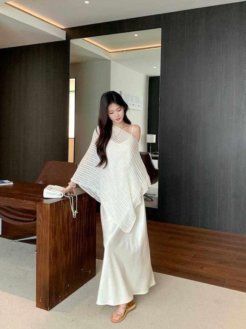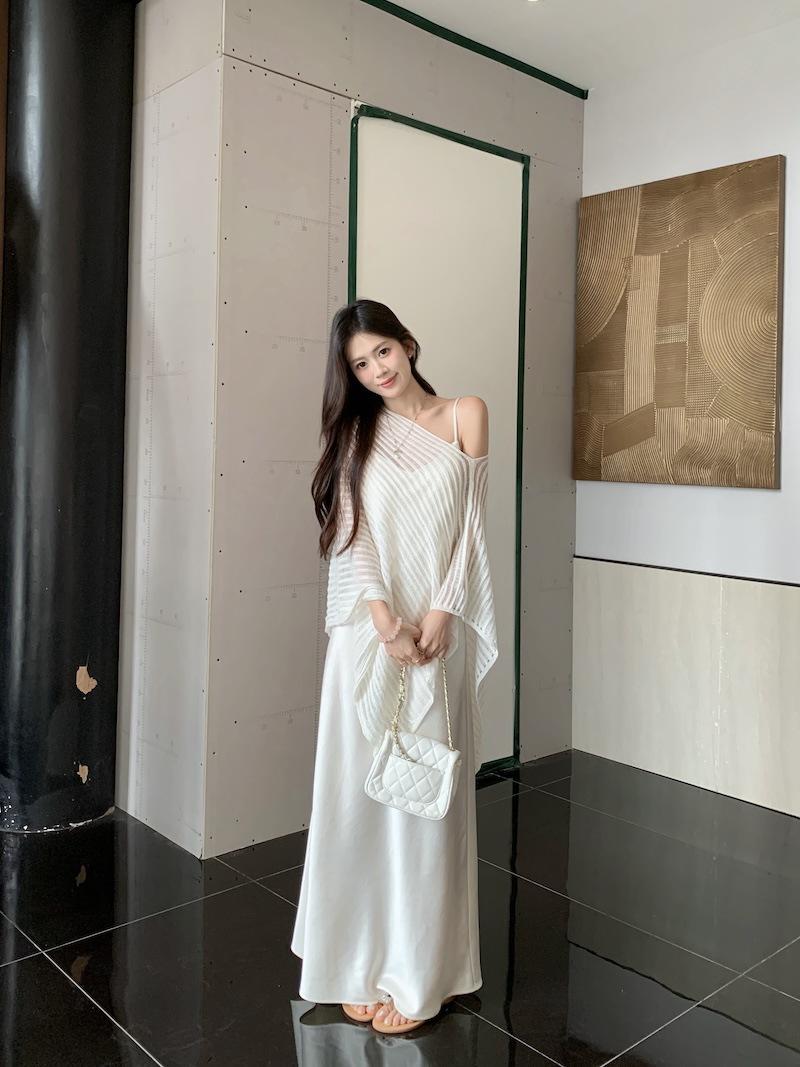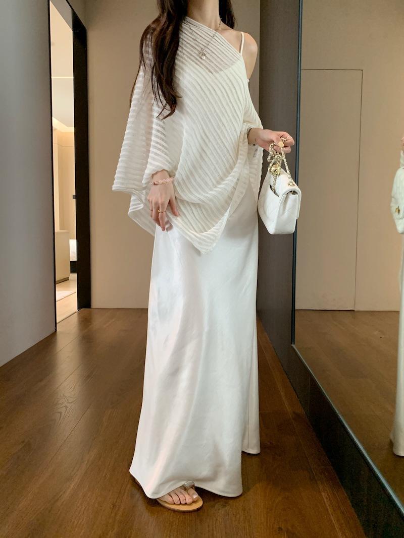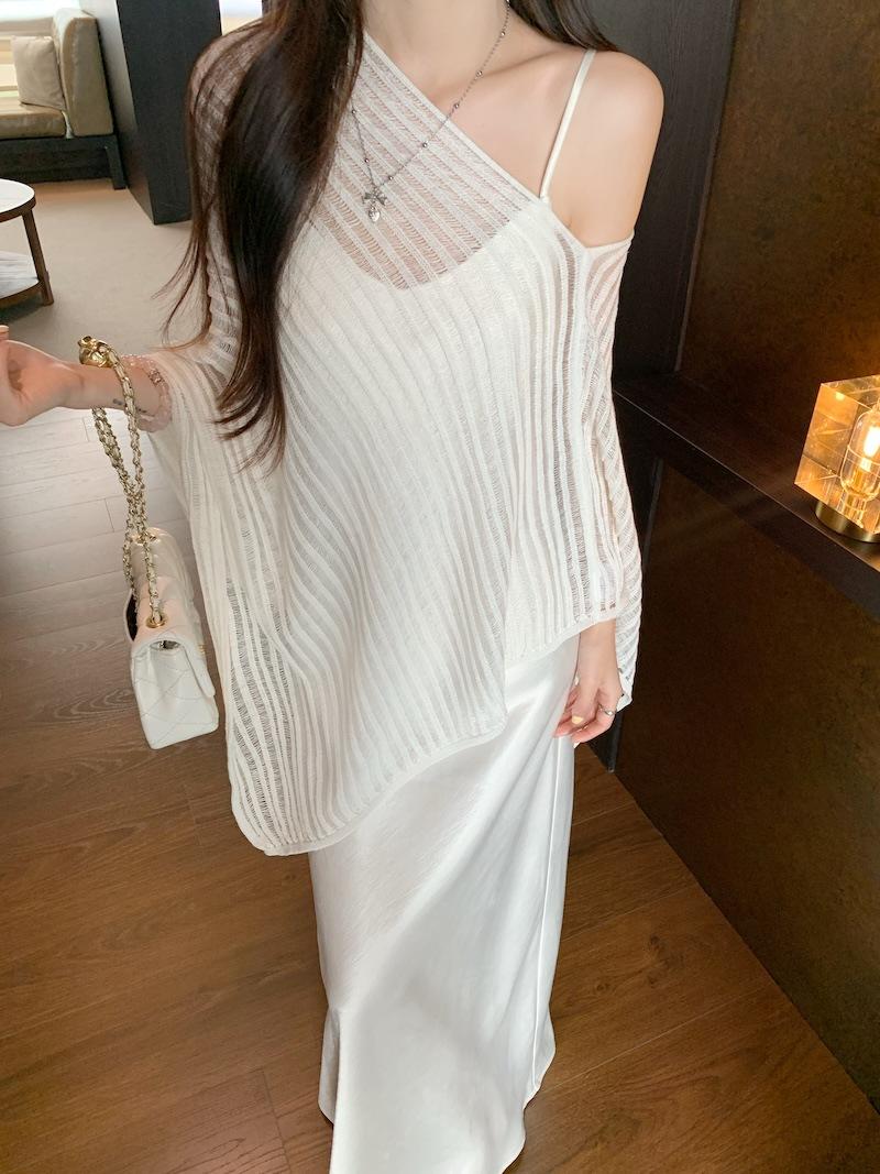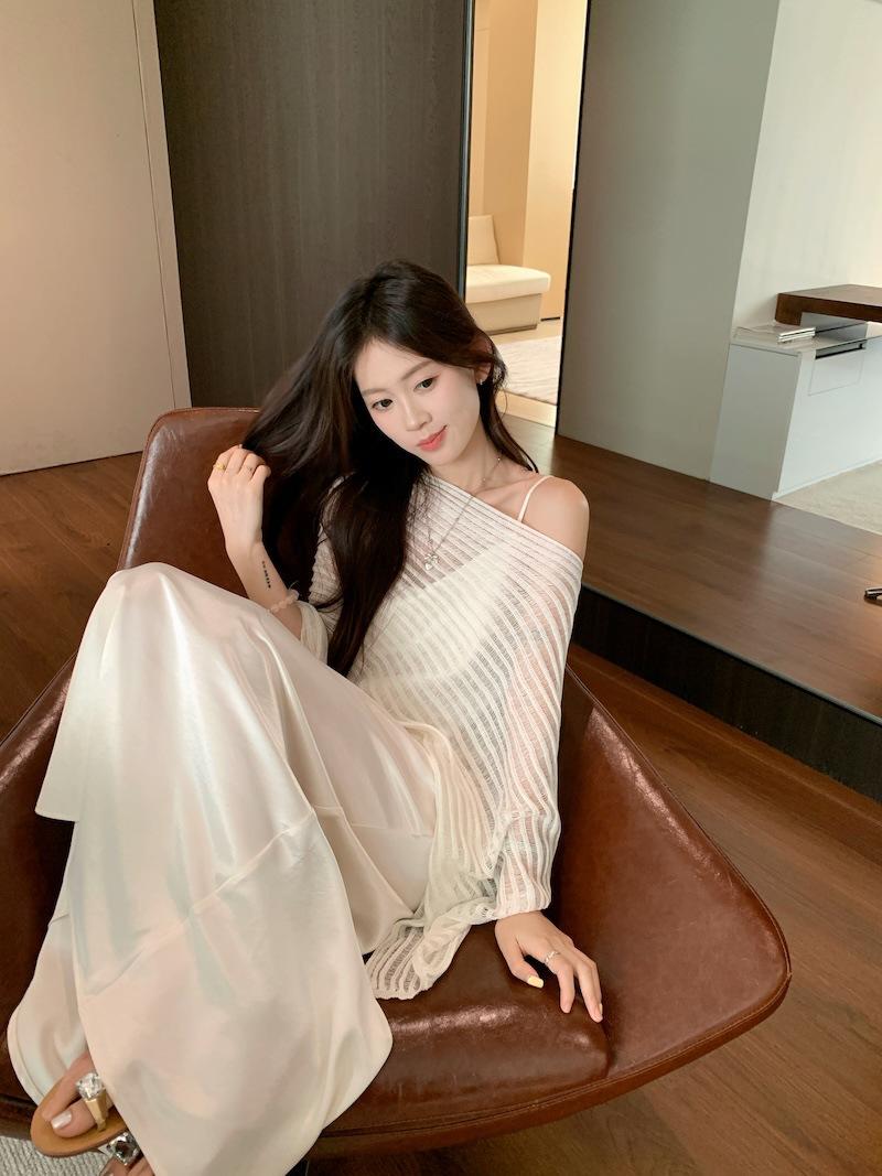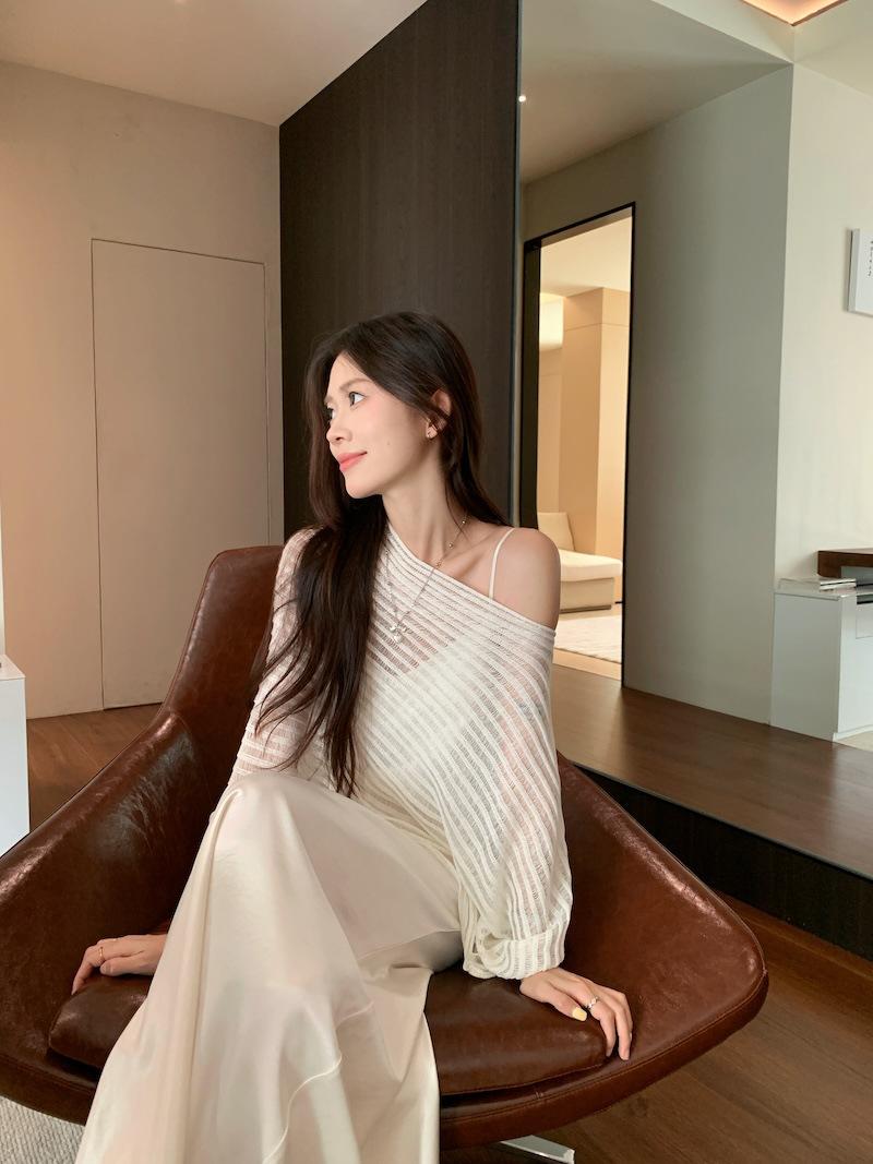 Foto Real Blusa de Punto de Manga Larga con Hombro Inclinado Irregular Francés para Mujer Verano Ajustada Adelgazante Vestido con Tirantes Conjunto de Dos Piezas