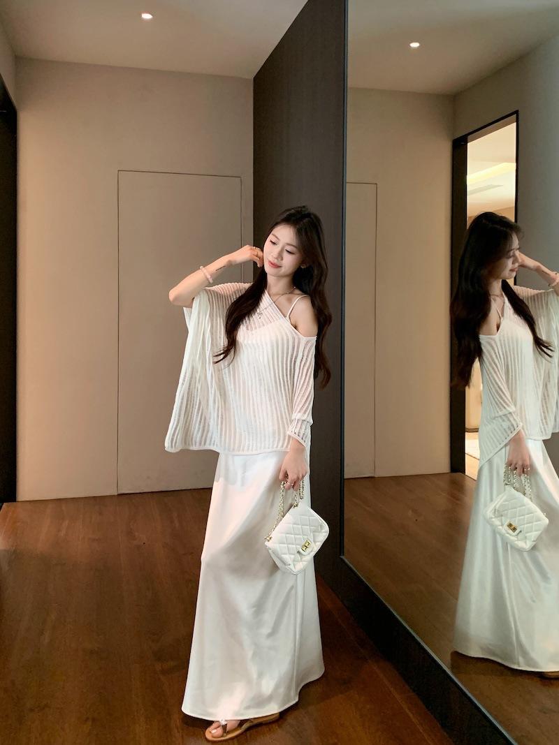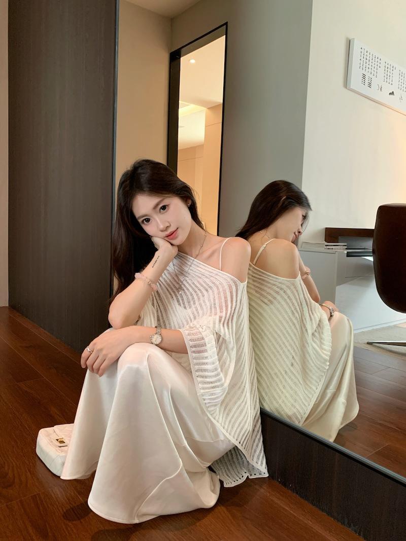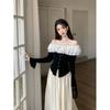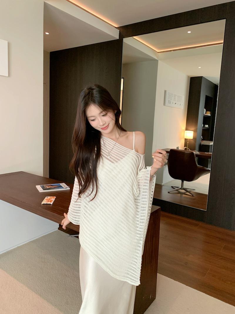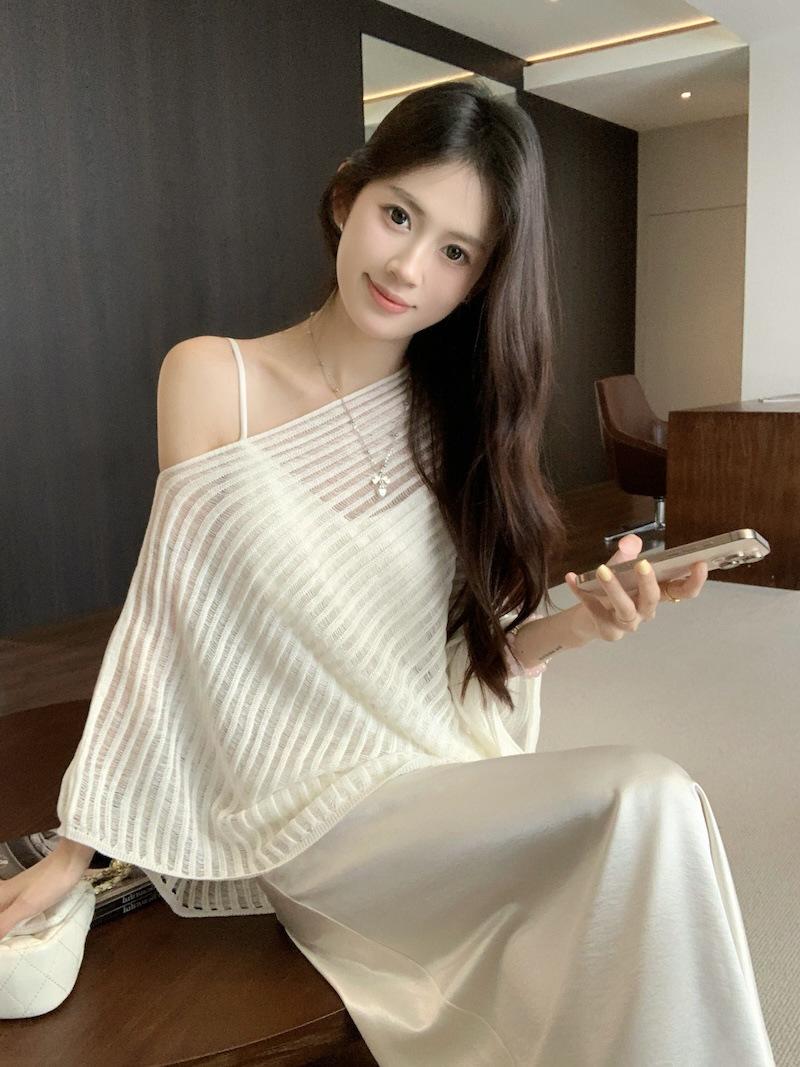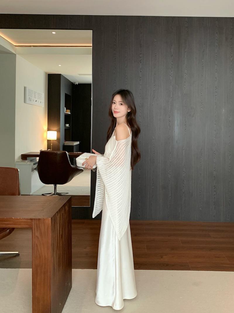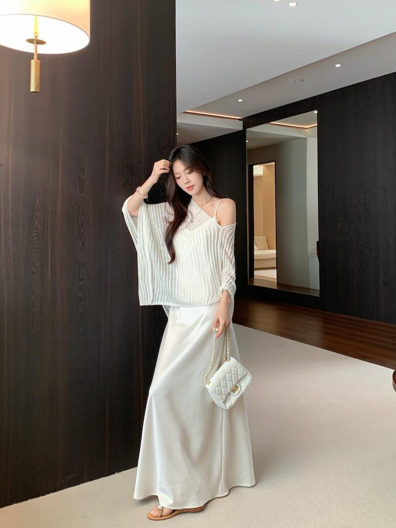 Foto Real Blusa de Punto de Manga Larga con Hombro Inclinado Irregular Francés para Mujer Verano Ajustada Adelgazante Vestido con Tirantes Conjunto de Dos Piezas