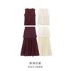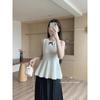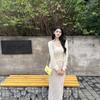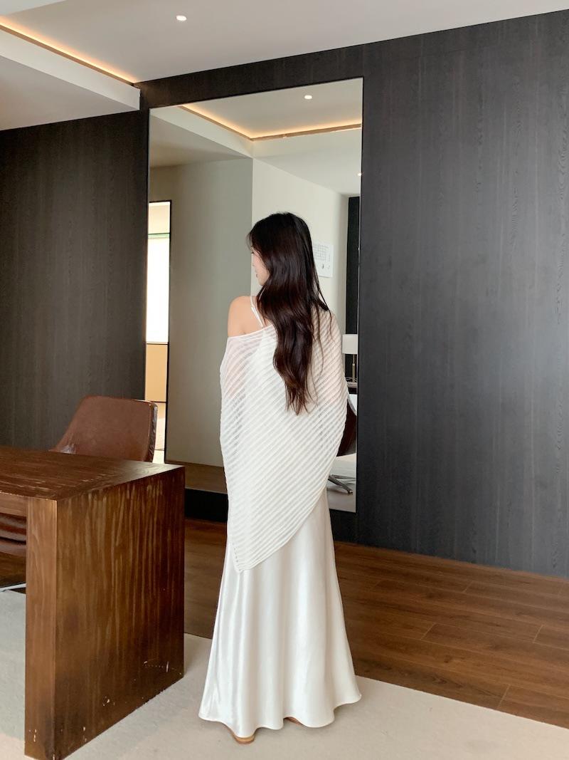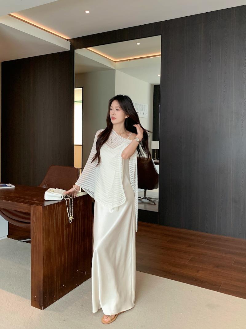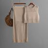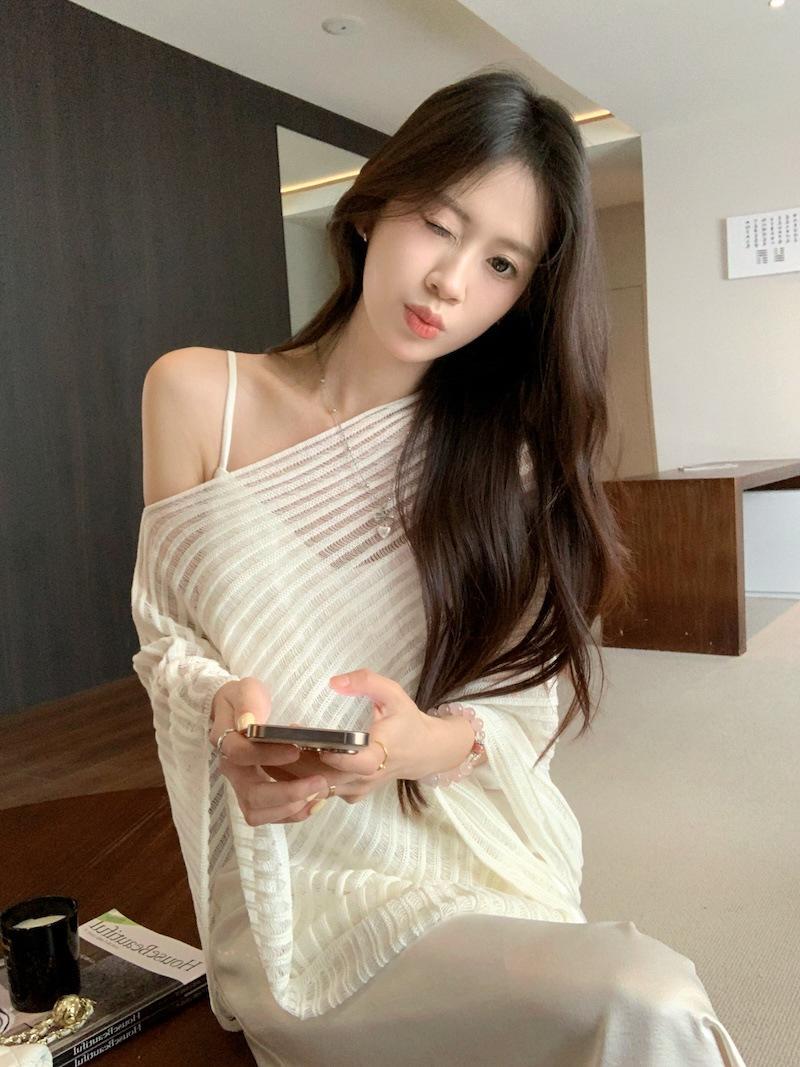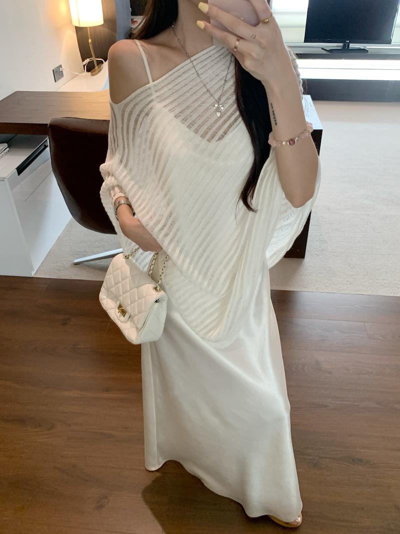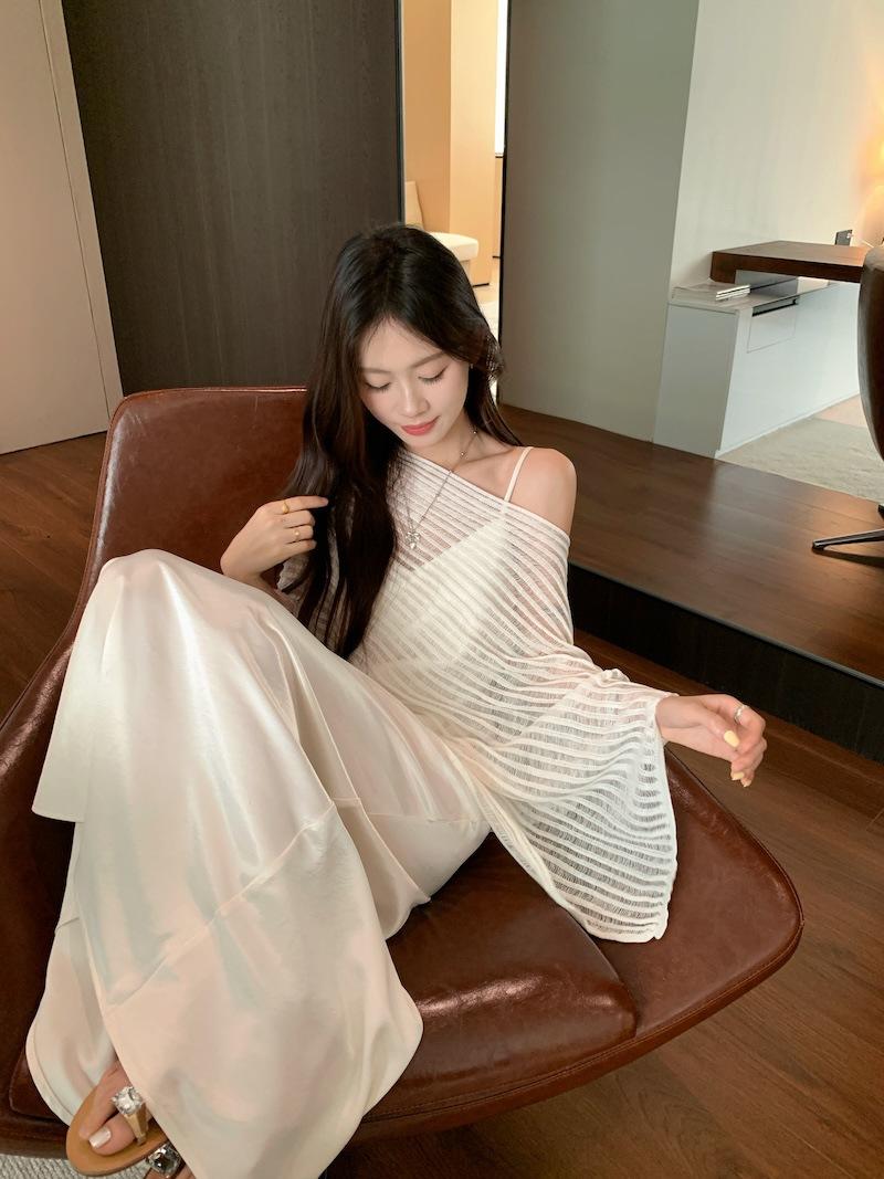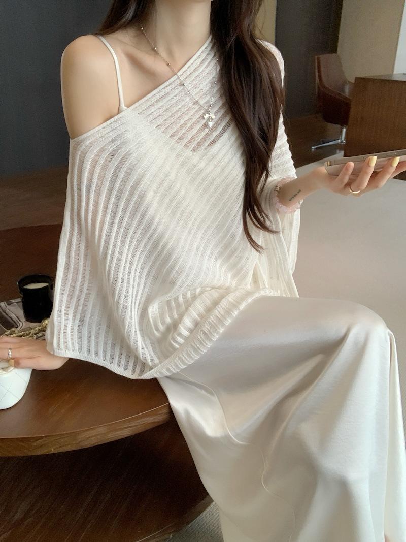 Foto Real Blusa de Punto de Manga Larga con Hombro Inclinado Irregular Francés para Mujer Verano Ajustada Adelgazante Vestido con Tirantes Conjunto de Dos Piezas