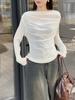 Playera Sexy de Punto de Manga Larga con Cuello Francés de Un Hombro Descubierto para Mujer Verano Diseño Delgado Plisado Holgada Look Adelgazante Top