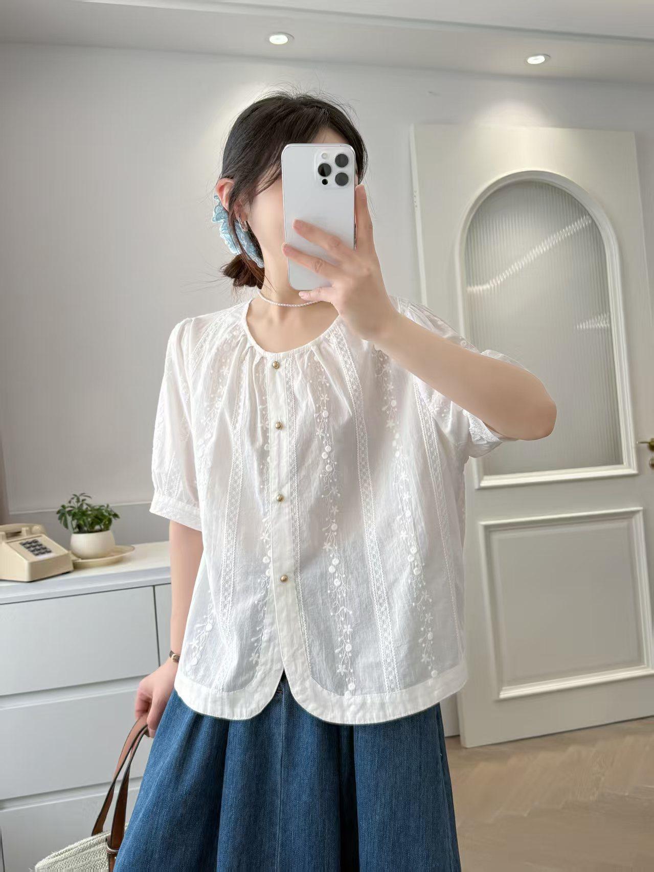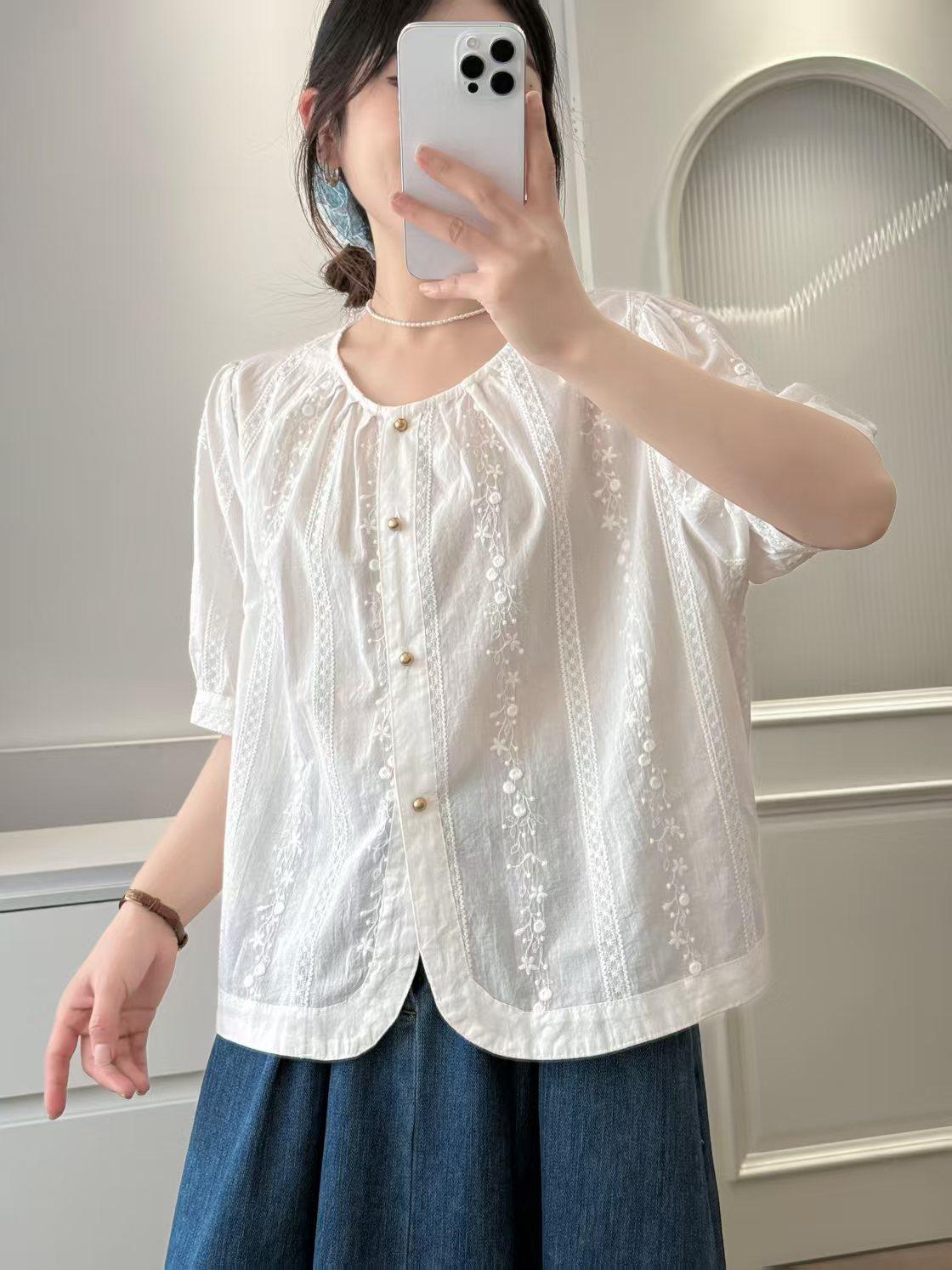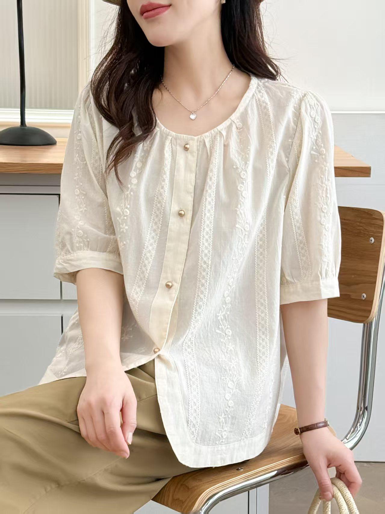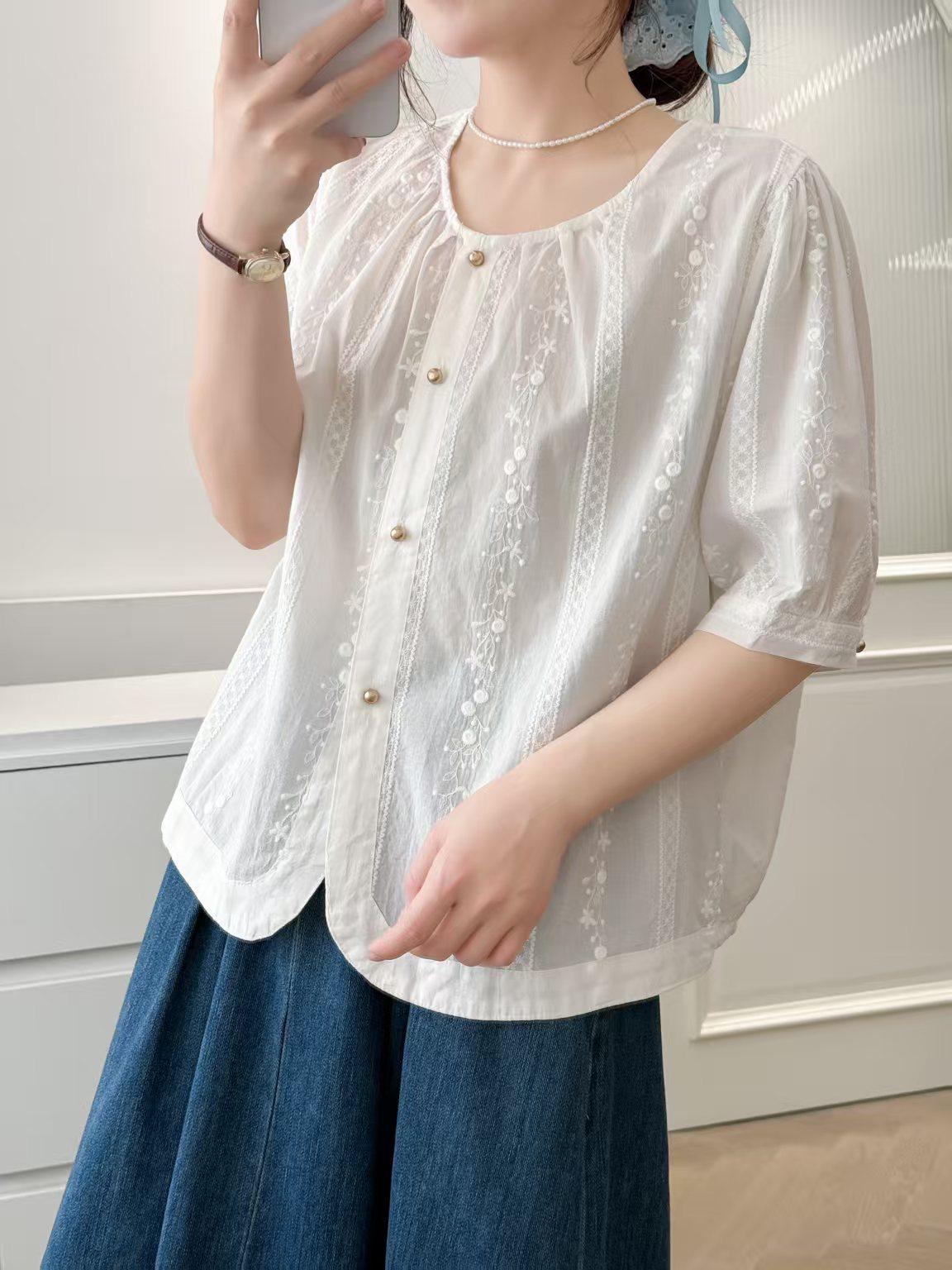 Camisa Bordada Diseño para Mujer Nicho Top de Manga Corta Verano 2025 Nuevo Coreano Cuello Redondo Holgada Ajustada