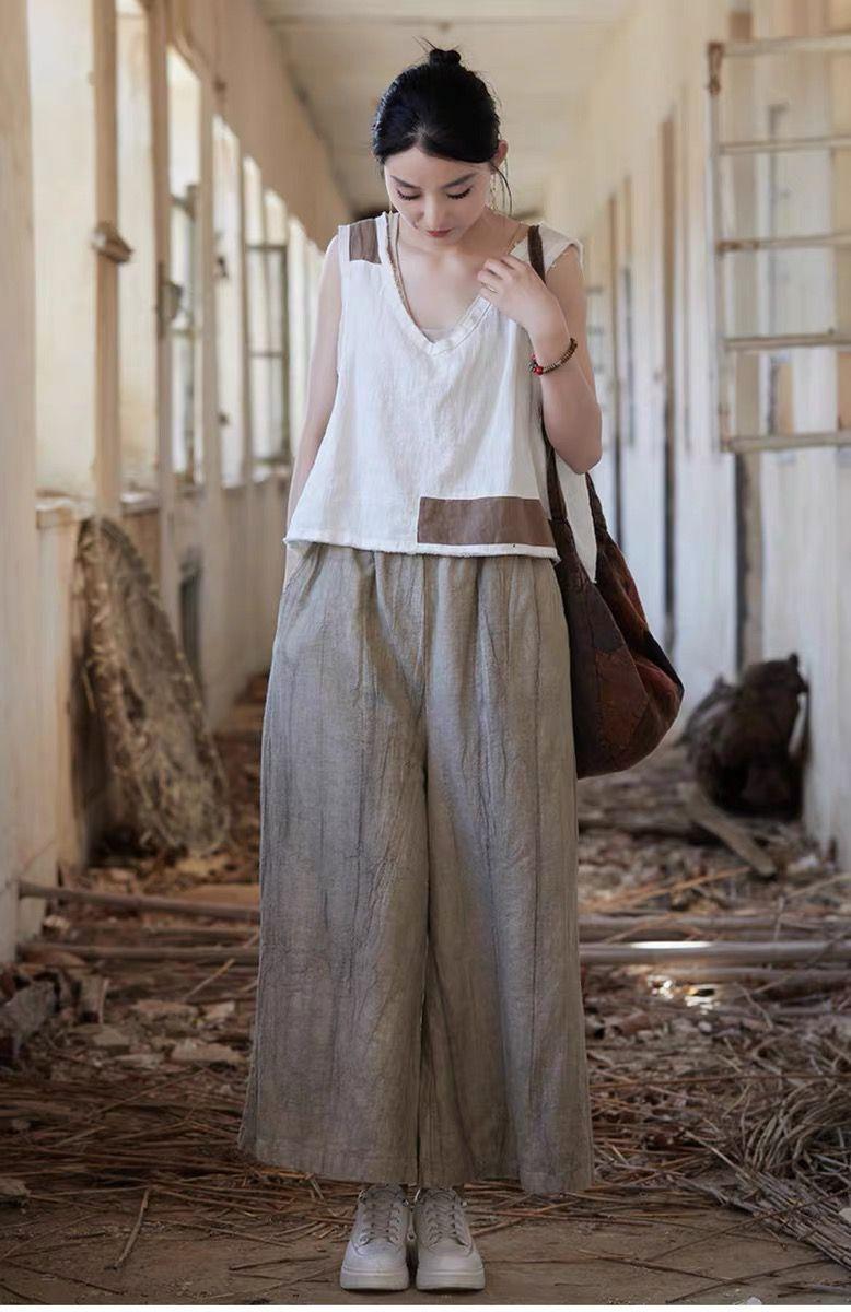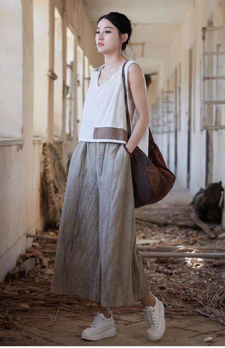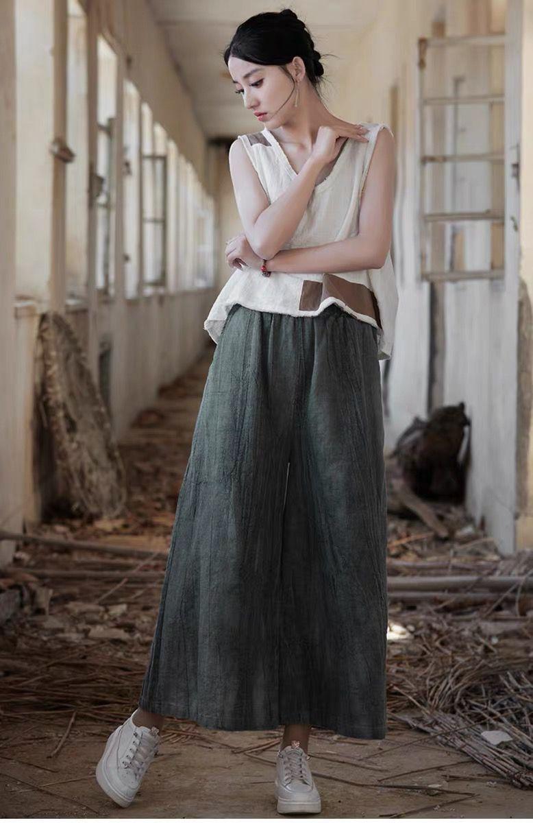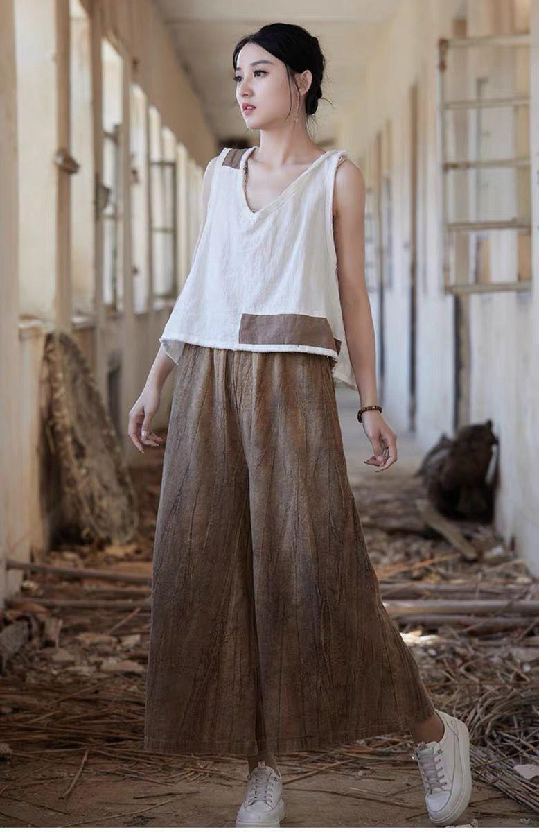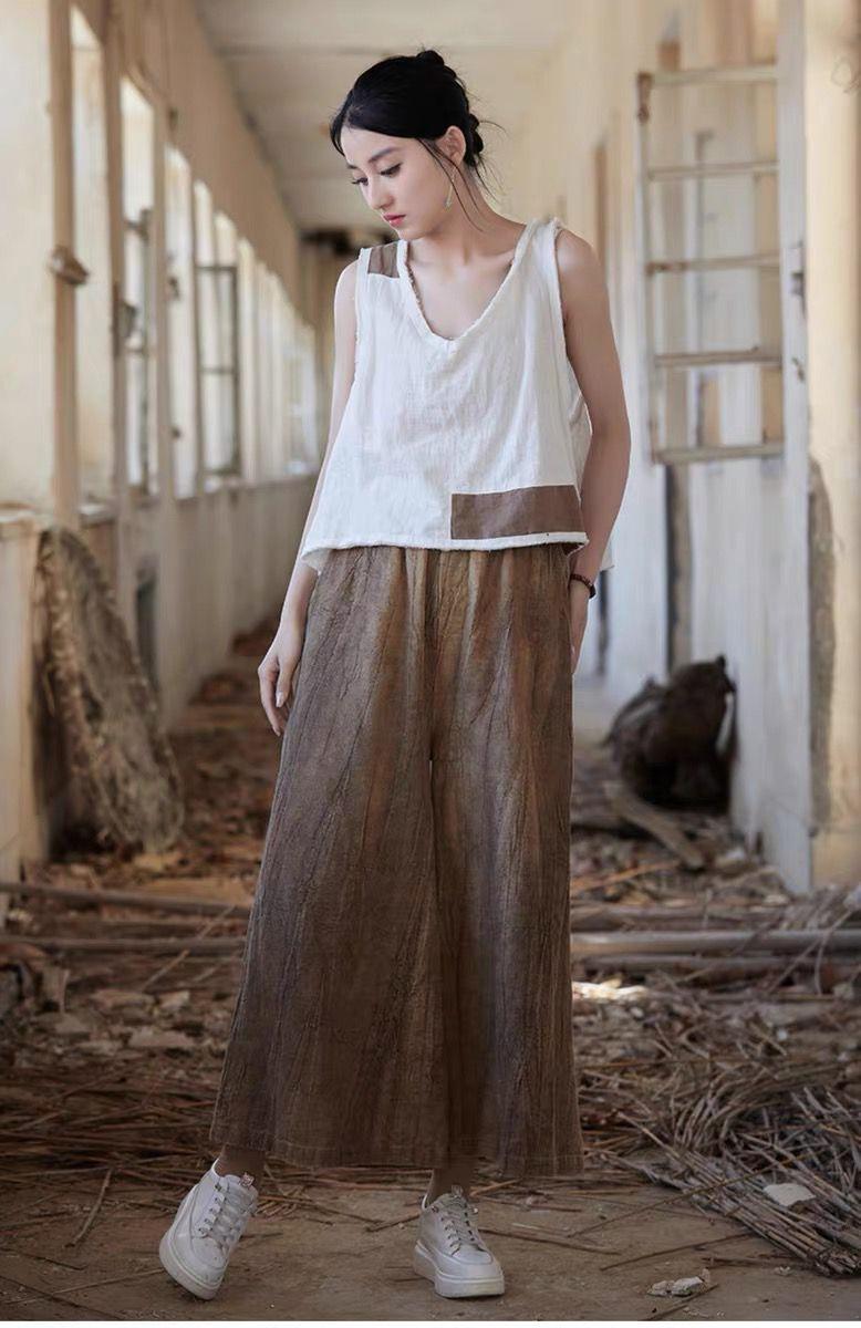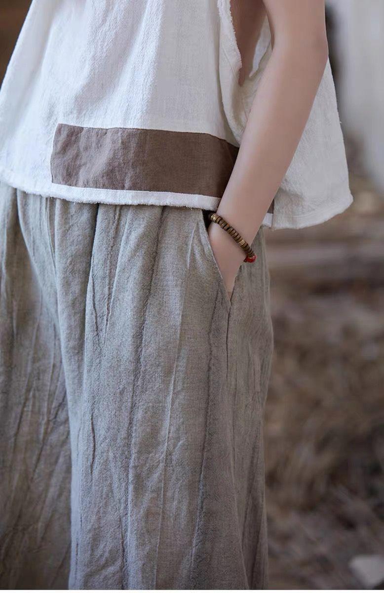 Pantalones Capri de Algodón y Lino para Mujer, Nuevos de Verano Cintura Elástica Adelgazantes Versátiles Casuales Algodón Tie-Dye Pierna Ancha para Mujer