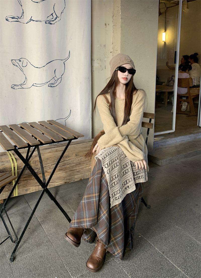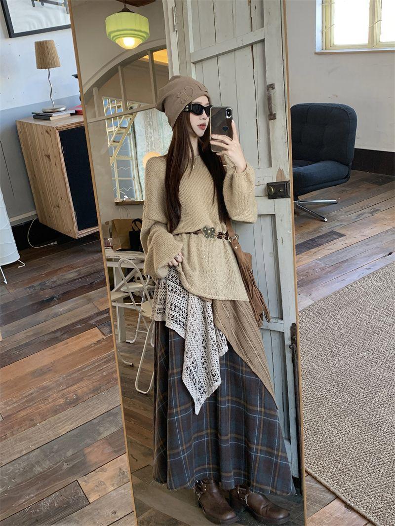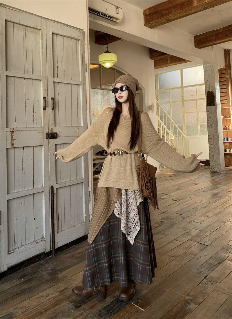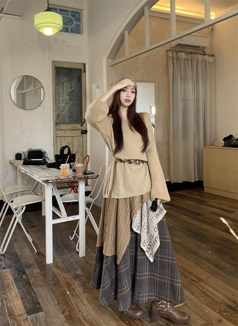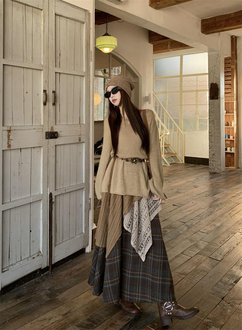 Traje de Moda Estilo Lazy Tejido de Punto Suéter Suéter Irregular Estampado a Cuadros Costuras Falda Conjunto de Dos Piezas para Mujer Primavera Temprana