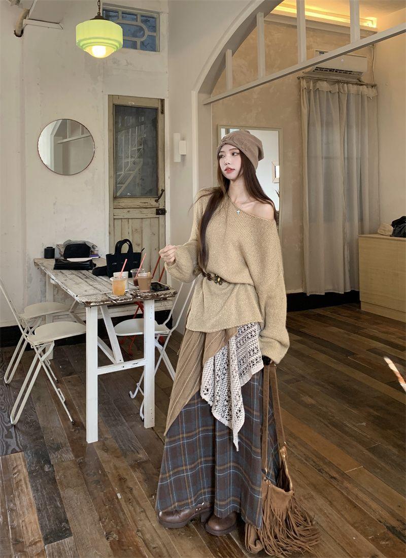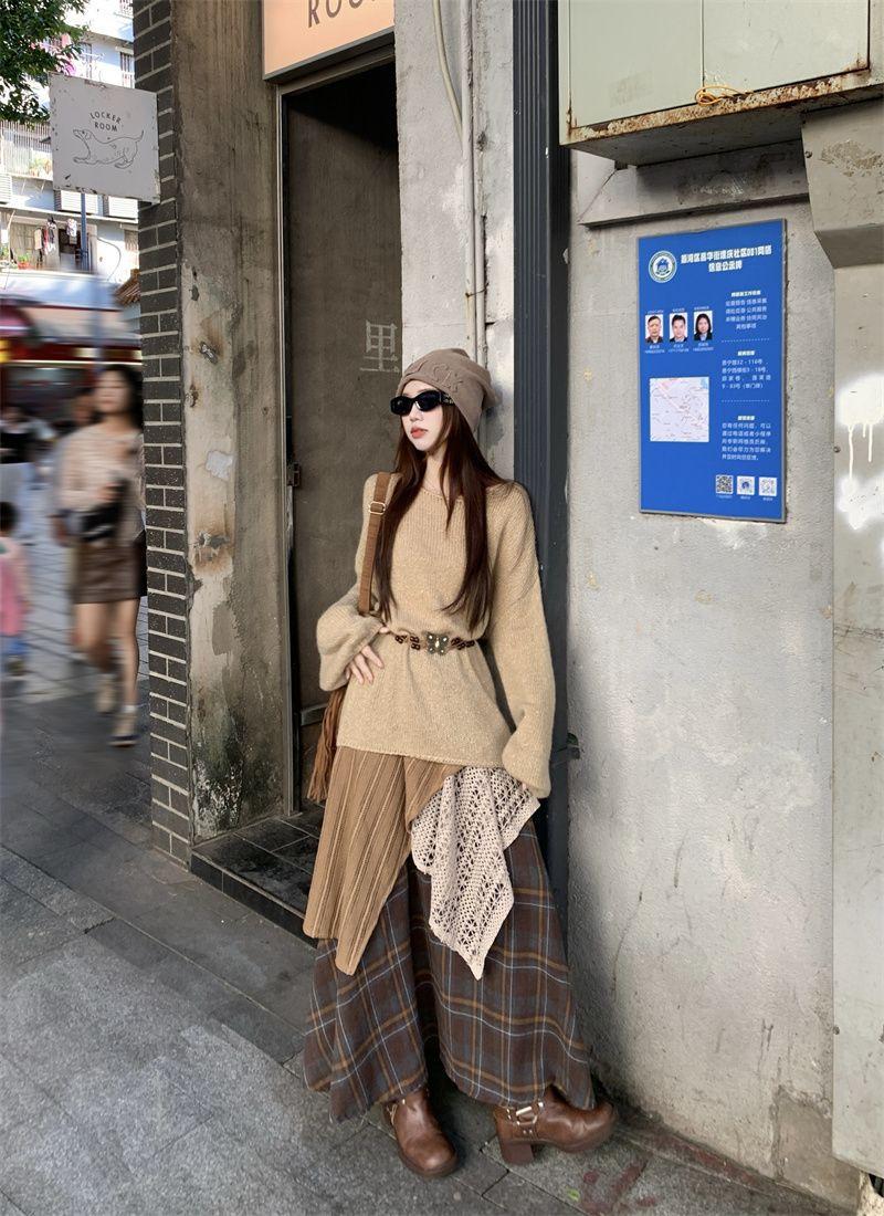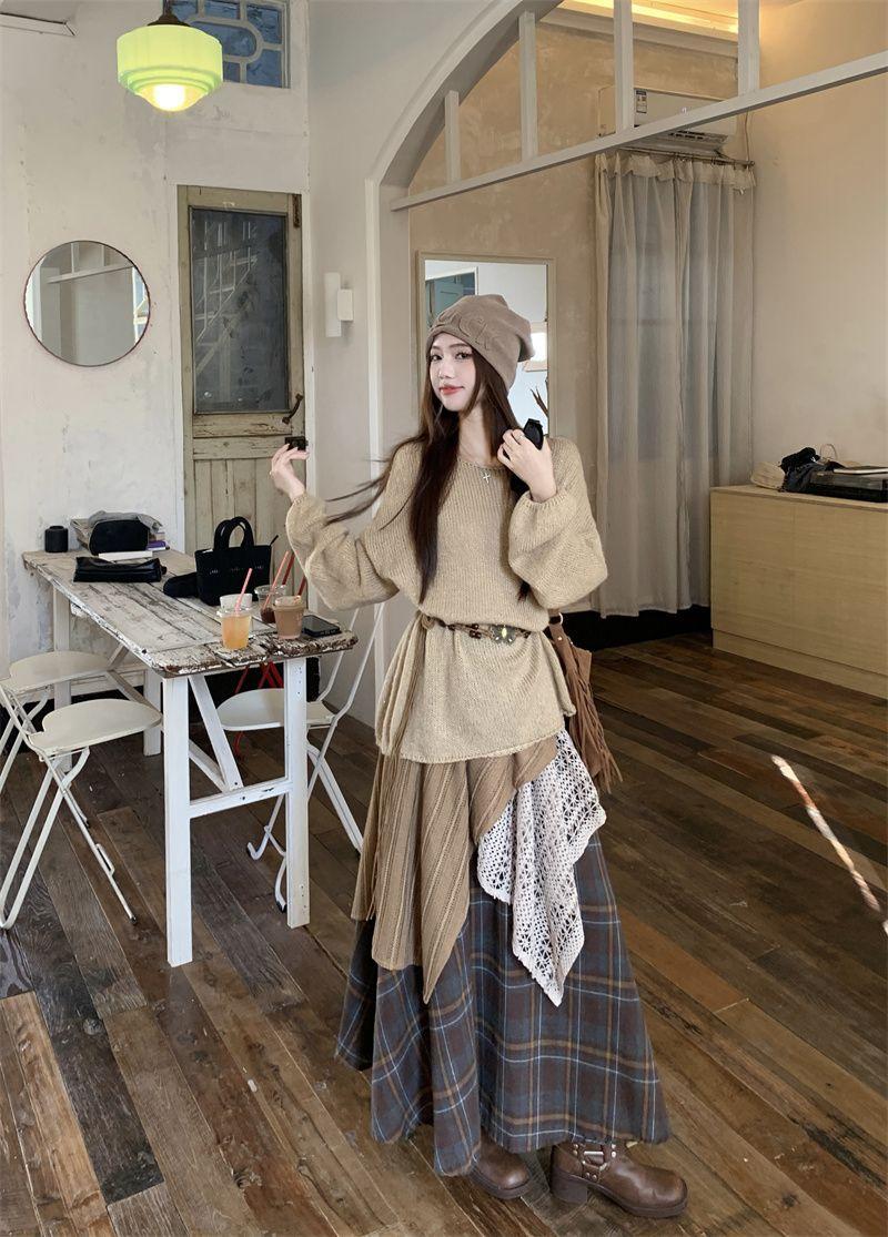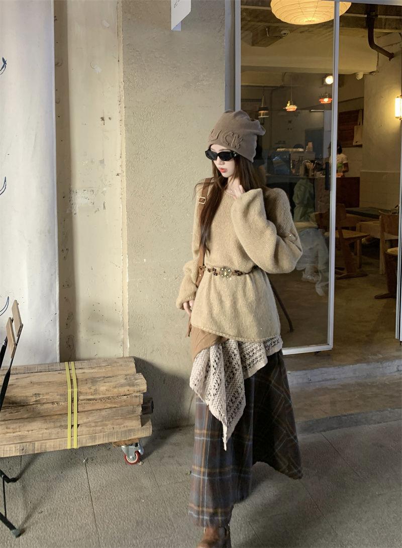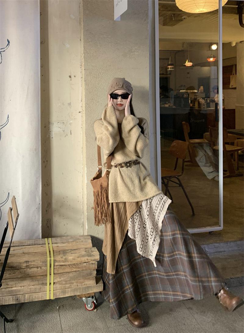 Traje de Moda Estilo Lazy Tejido de Punto Suéter Suéter Irregular Estampado a Cuadros Costuras Falda Conjunto de Dos Piezas para Mujer Primavera Temprana