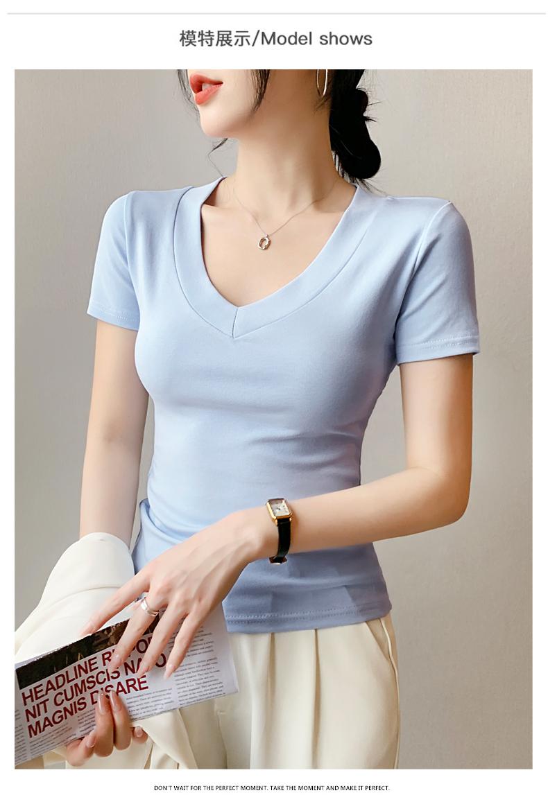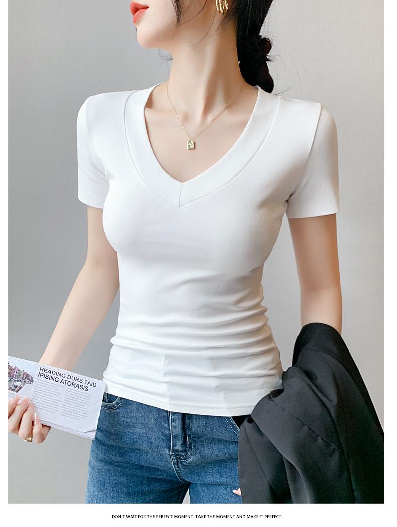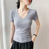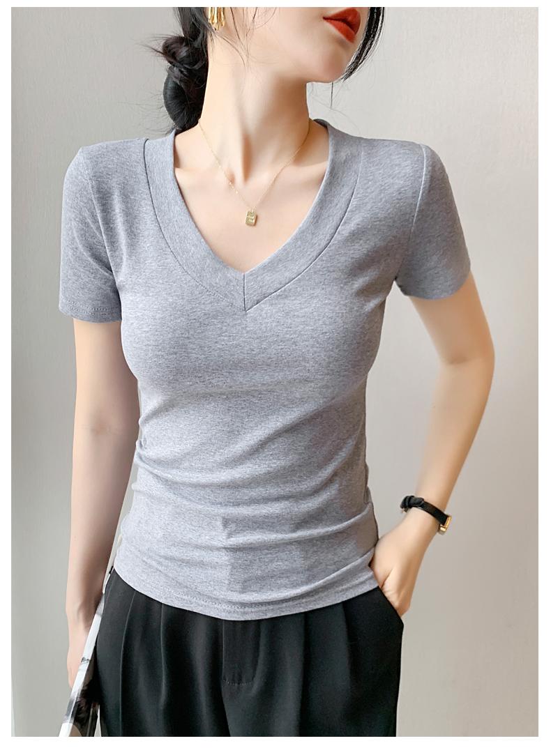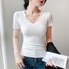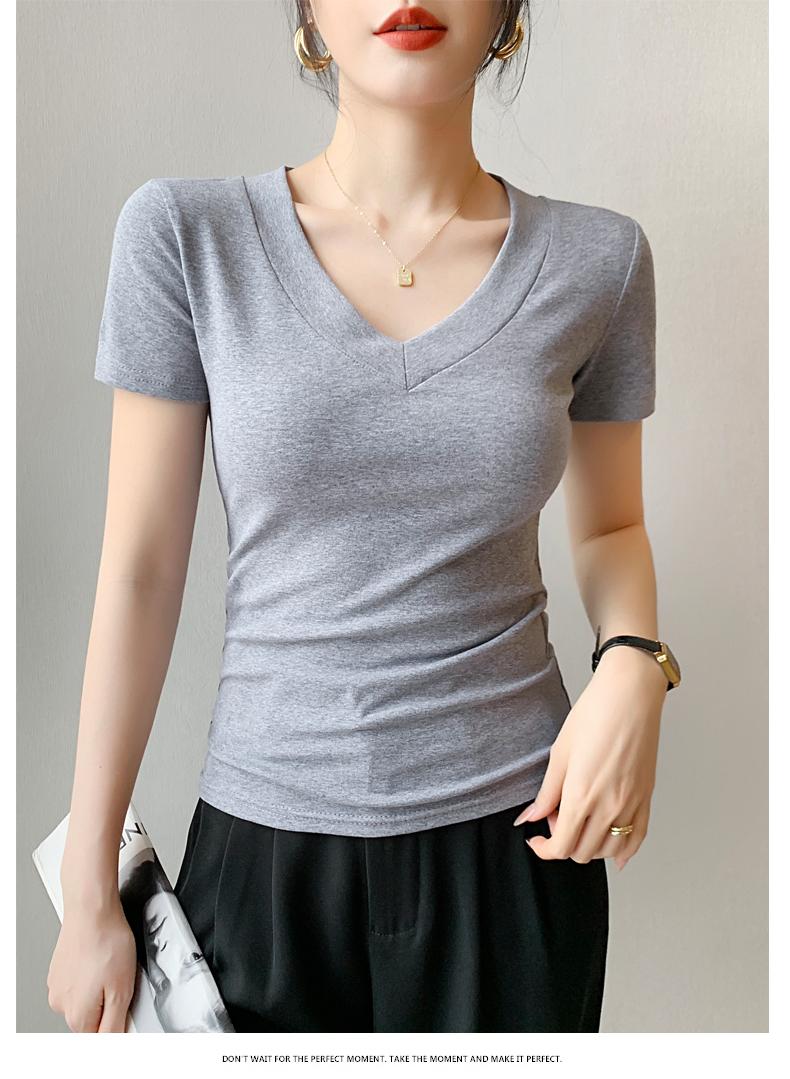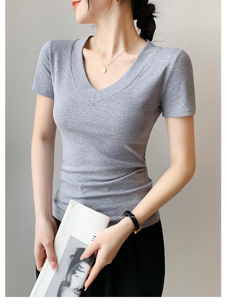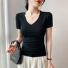 Playera de Cuello en V para Mujer Manga Corta Verano 2025 Nuevo Diseño Hombro Derecho Cintura Entallada Look Adelgazante Versátil Top de Camiseta