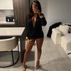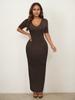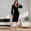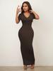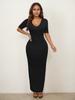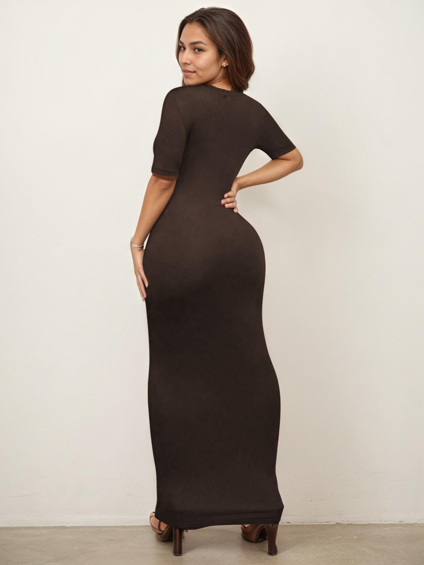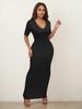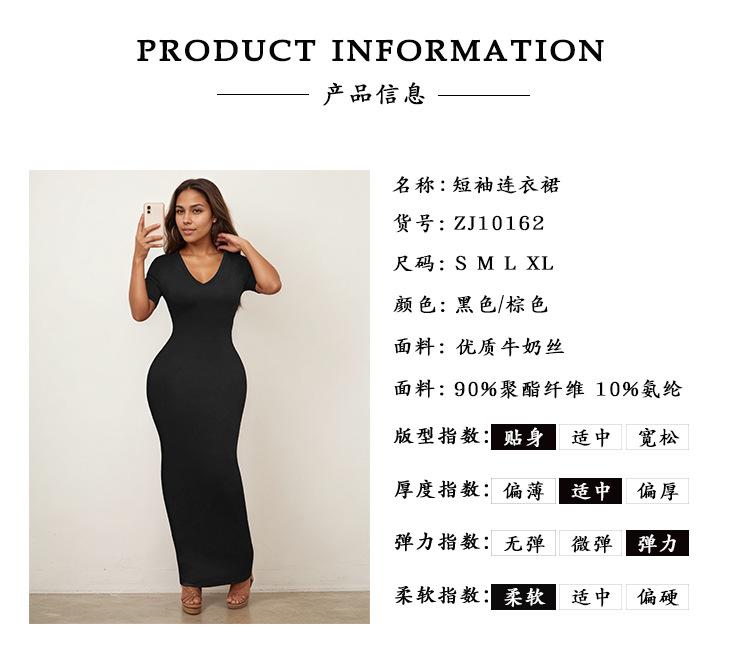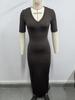 2025 Nuevo Ropa de Mujer Delgada y Sexy Transfronteriza Vestido Europeo y Americano de Cuello en V Profundo y Manga Media Color Puro Falda Larga de Alta Elasticidad que Cubre las Caderas