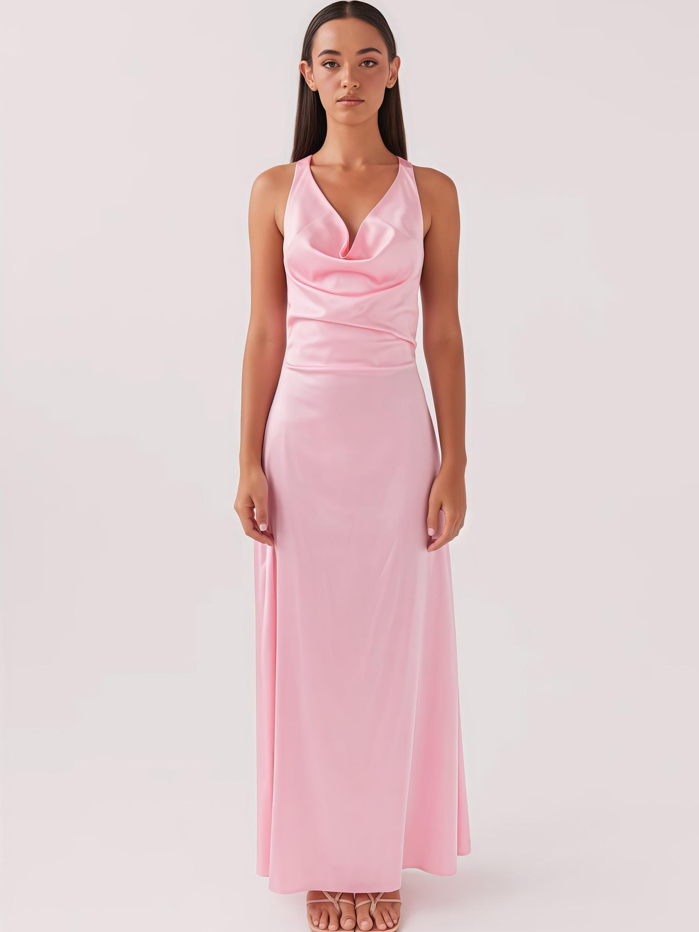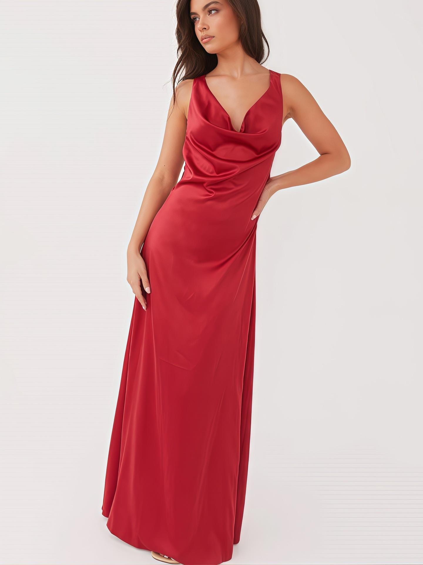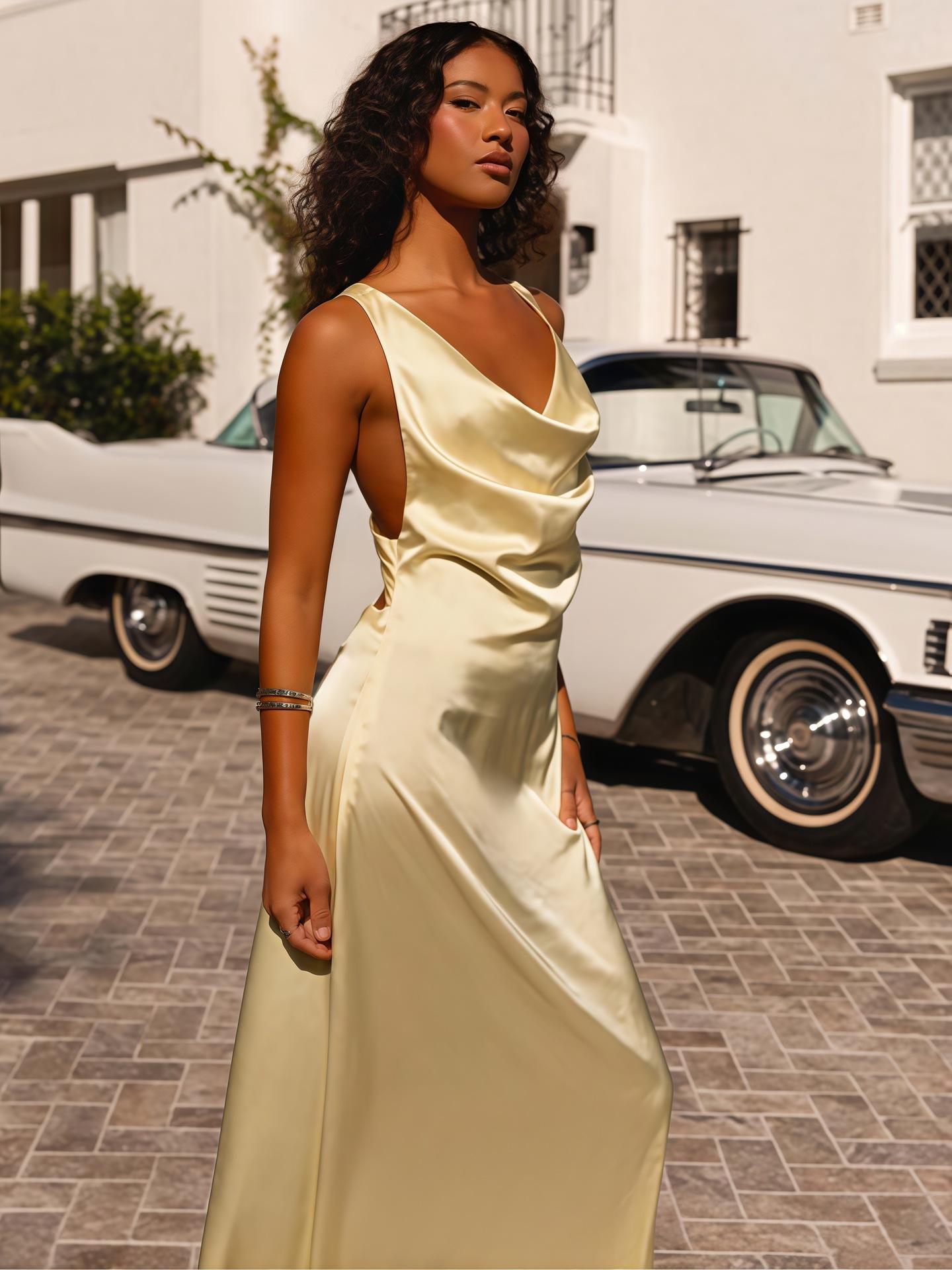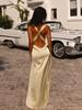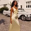 Europeo y Americano 2025 Nuevo Color Puro Sexy Cuello Oscilante Satén Brillante Fiesta Fiesta Vestido de Tirantes Falda Larga