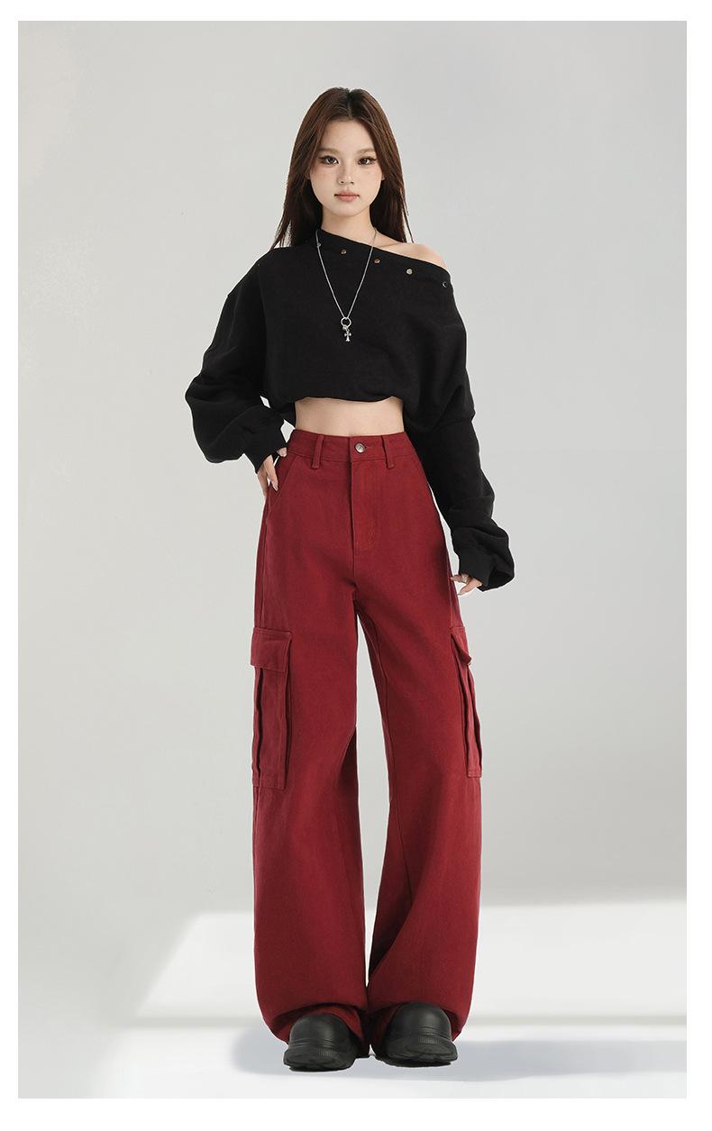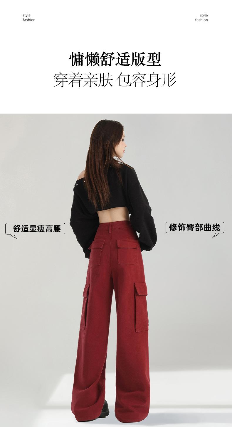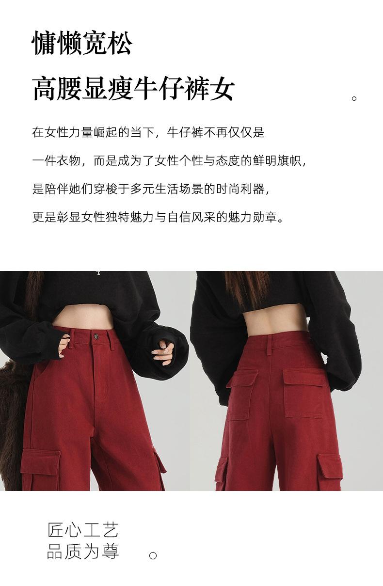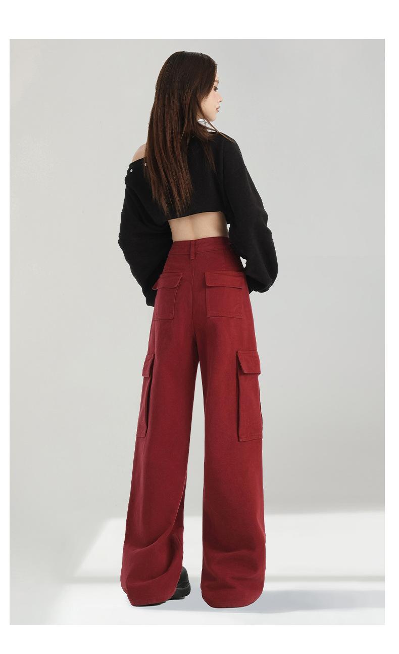 Ankesela Pantalones Cargo Rojos Jeans para Mujer Otoño 2025 Nuevo Diseño de Pantalones con Bolsillos de Múltiples Solapas Pantalones Holgados de Pierna Ancha