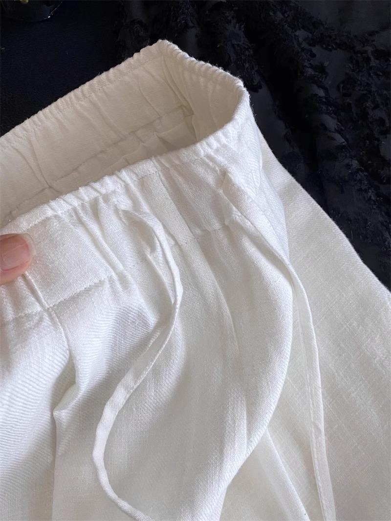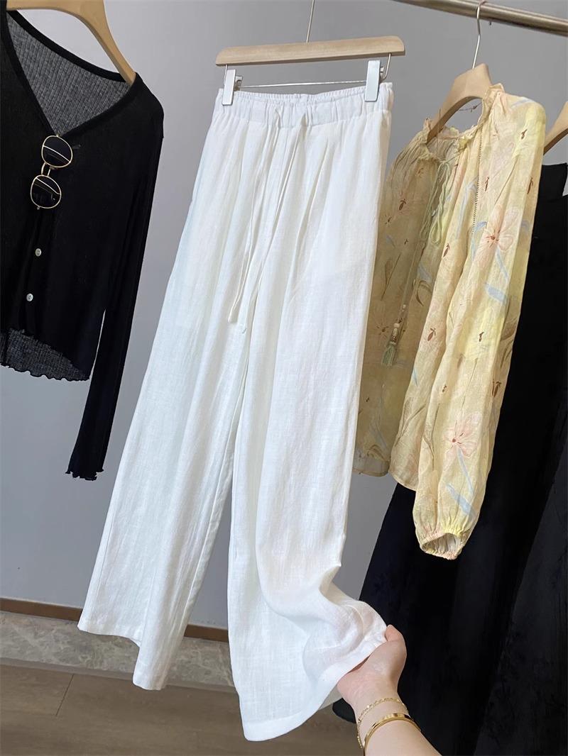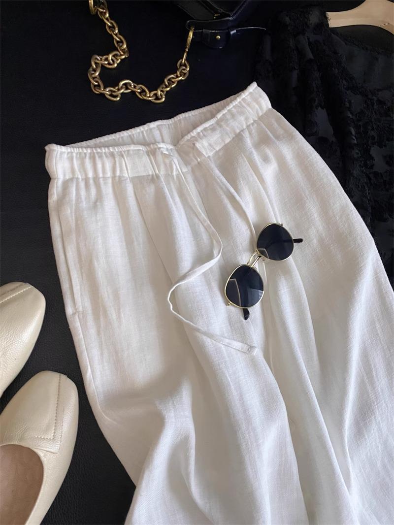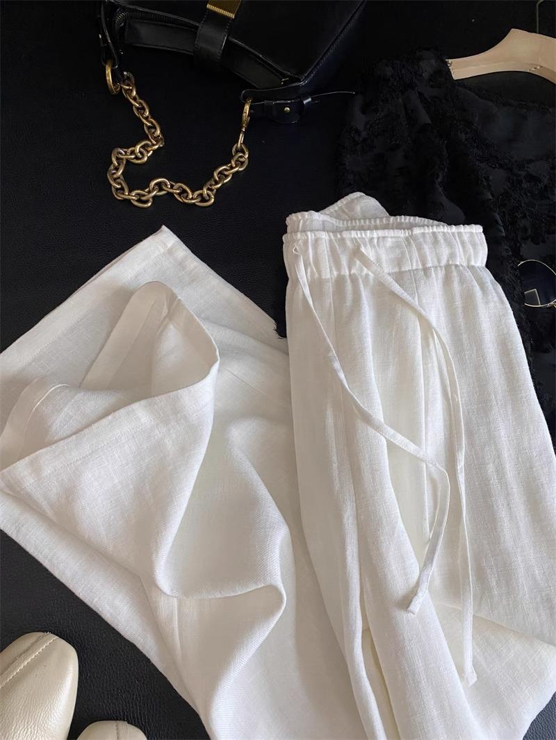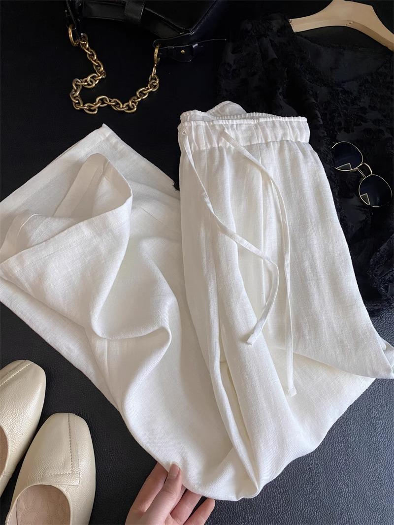 Pantalones de Lino Blanco de Pierna Ancha con Cintura Elástica con Cordón Estilo Vacacional Delgado para Mujer Verano 2025 Nuevo Estilo