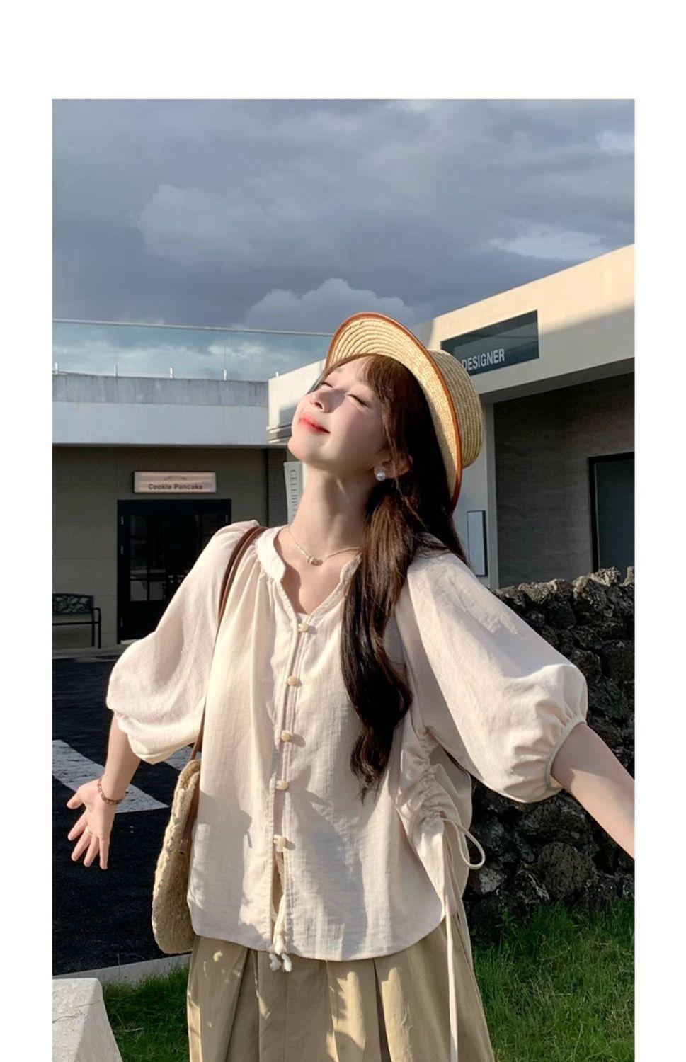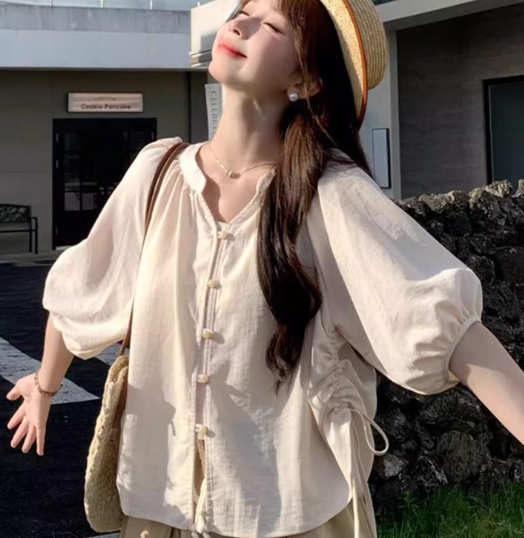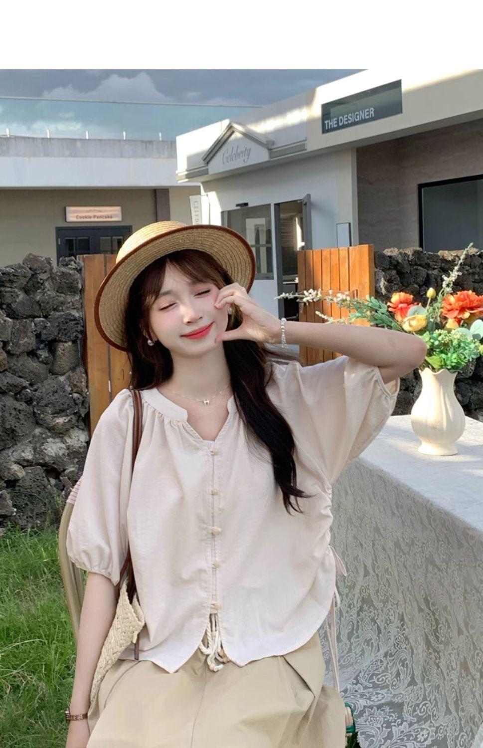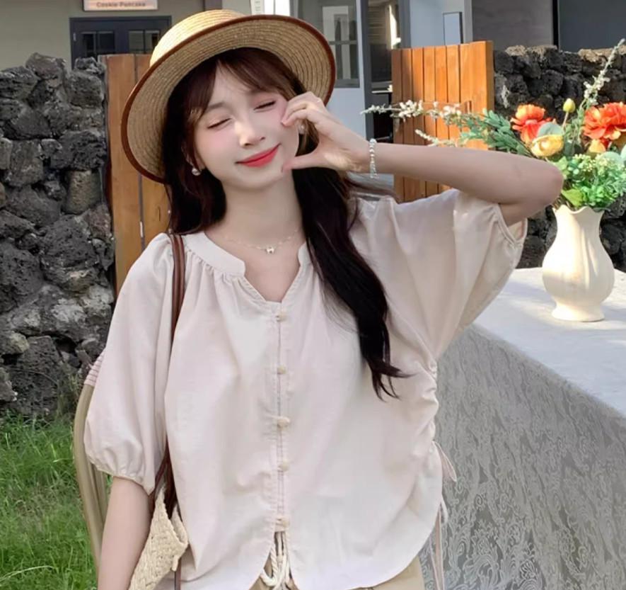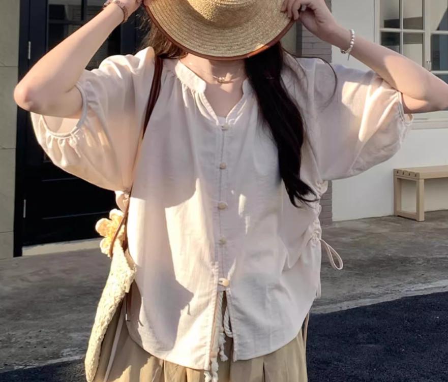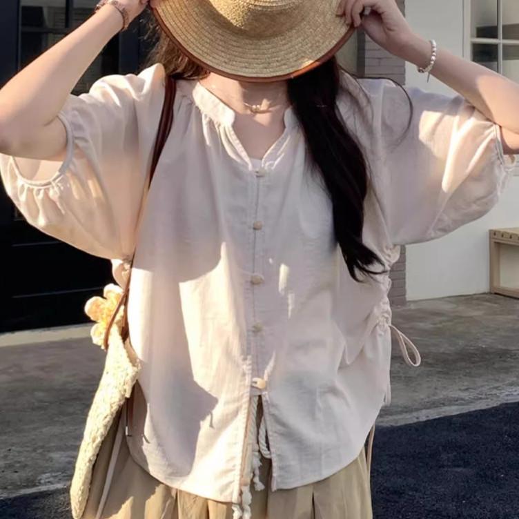Camisa Dulce Francesa con Cordón Fruncido y Manga Farol Plisada para Mujer Verano 2025 Nueva Talla Grande Holgada Top de Manga Corta
