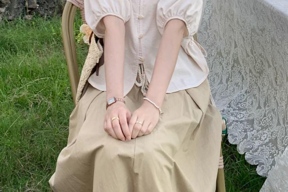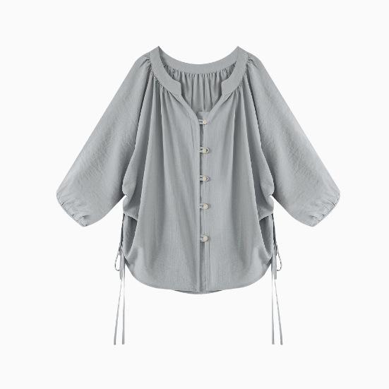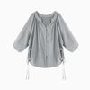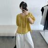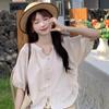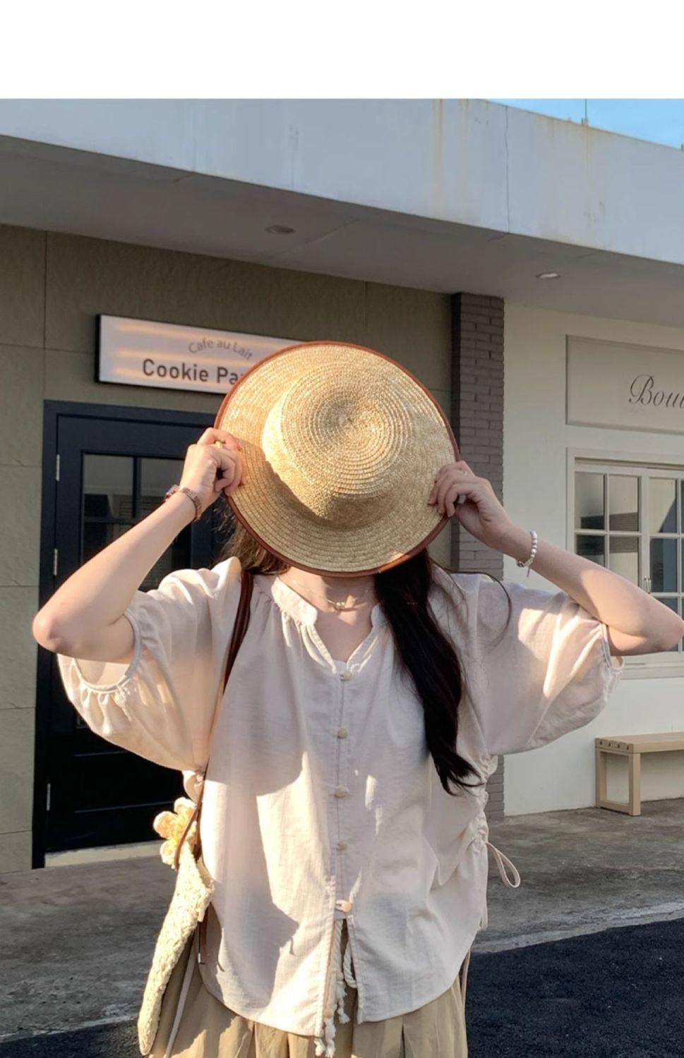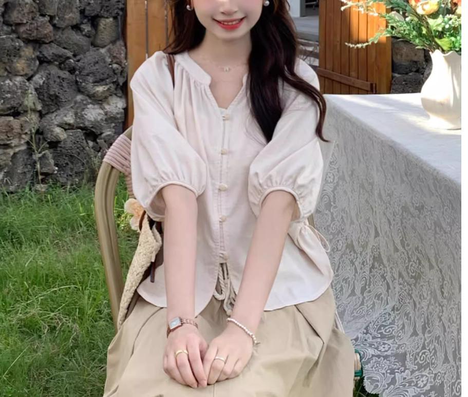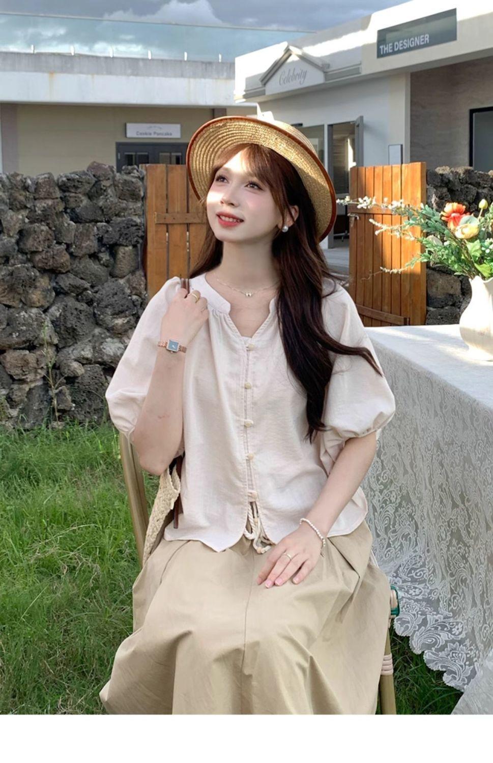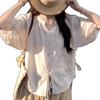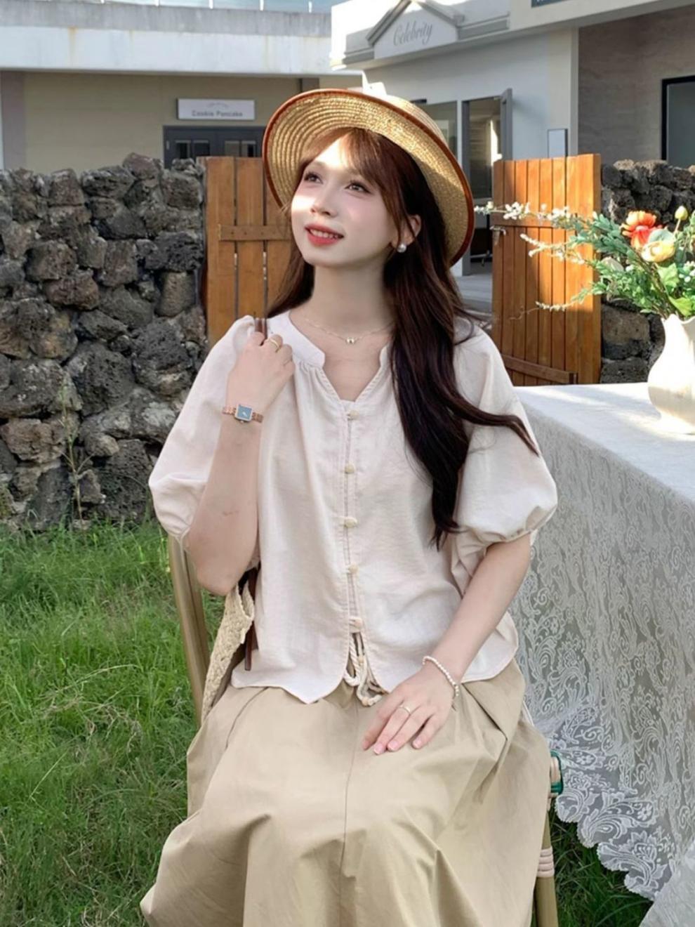 Camisa Dulce Francesa con Cordón Fruncido y Manga Farol Plisada para Mujer Verano 2025 Nueva Talla Grande Holgada Top de Manga Corta