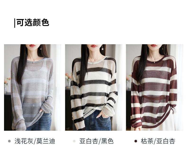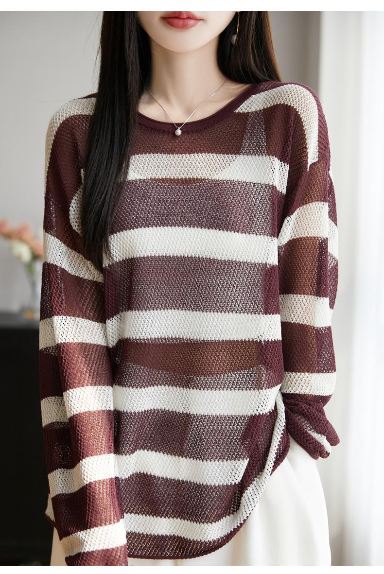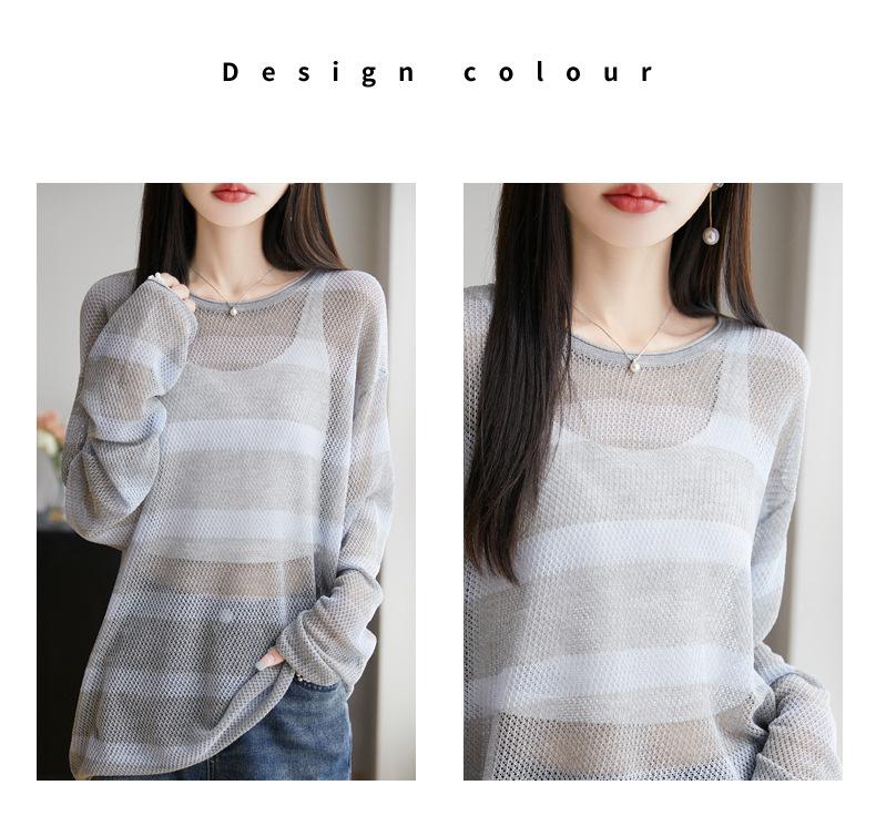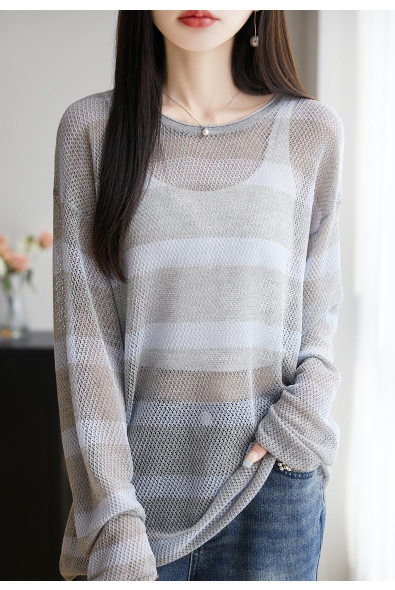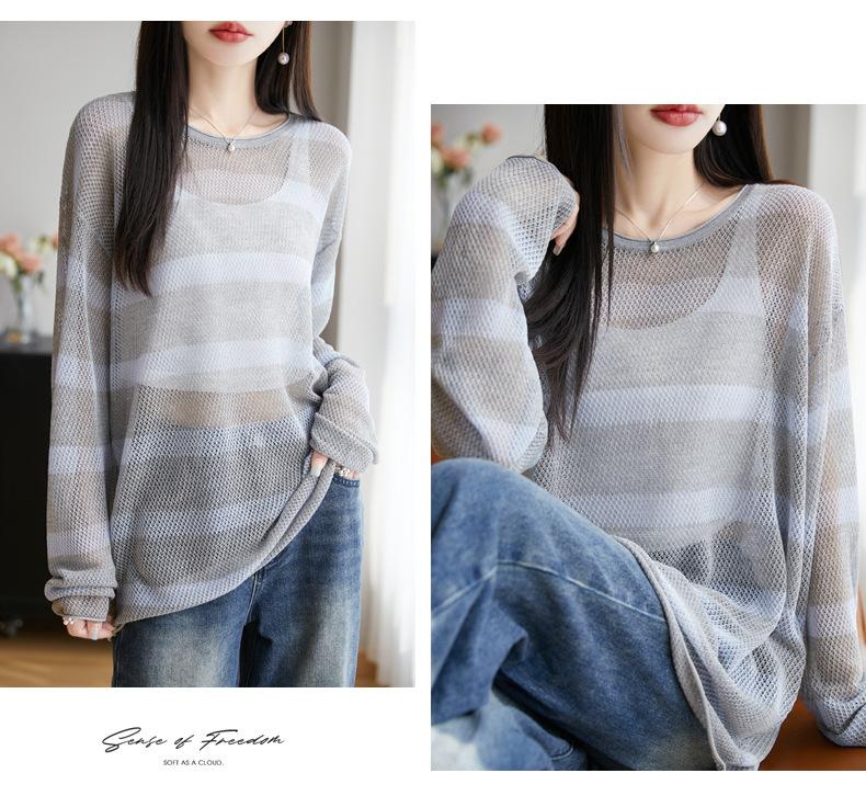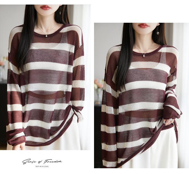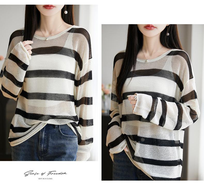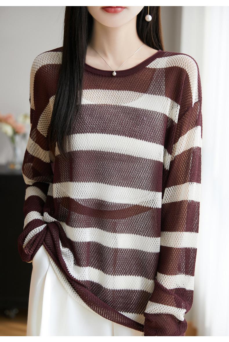 Blusa de Manga Larga Hueca para Primavera y Verano 2025 Cubriendo el Vientre Mezcla de Lino Lyocell Tejido Calado de Rayas Anchas Finas
