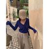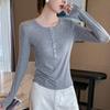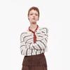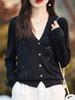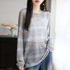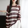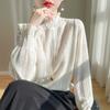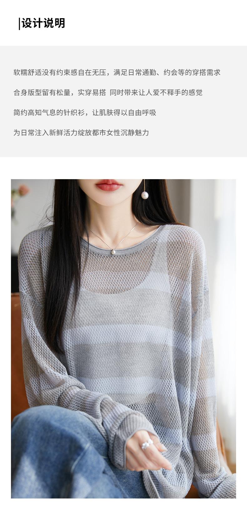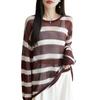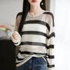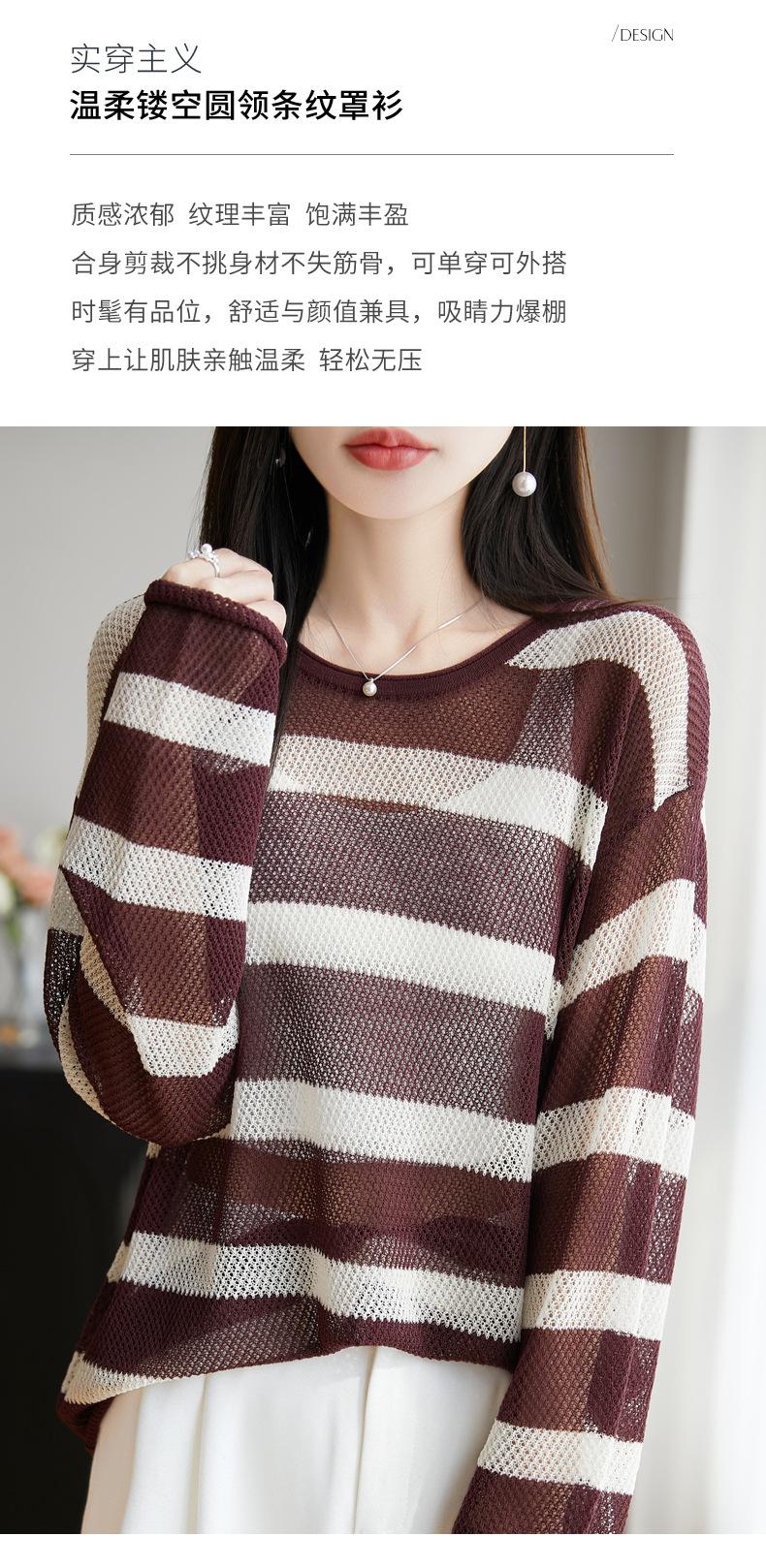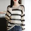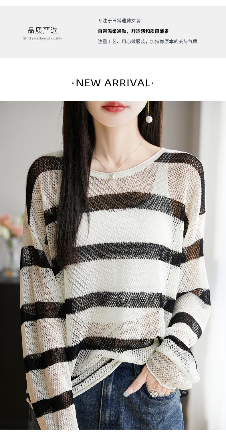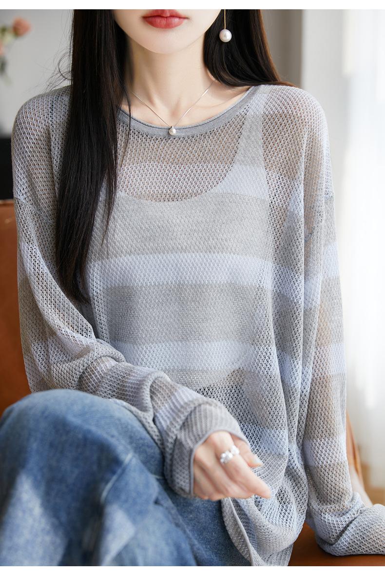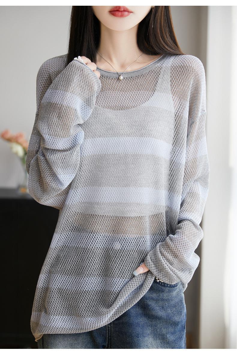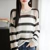 Blusa de Manga Larga Hueca para Primavera y Verano 2025 Cubriendo el Vientre Mezcla de Lino Lyocell Tejido Calado de Rayas Anchas Finas