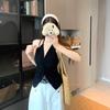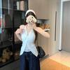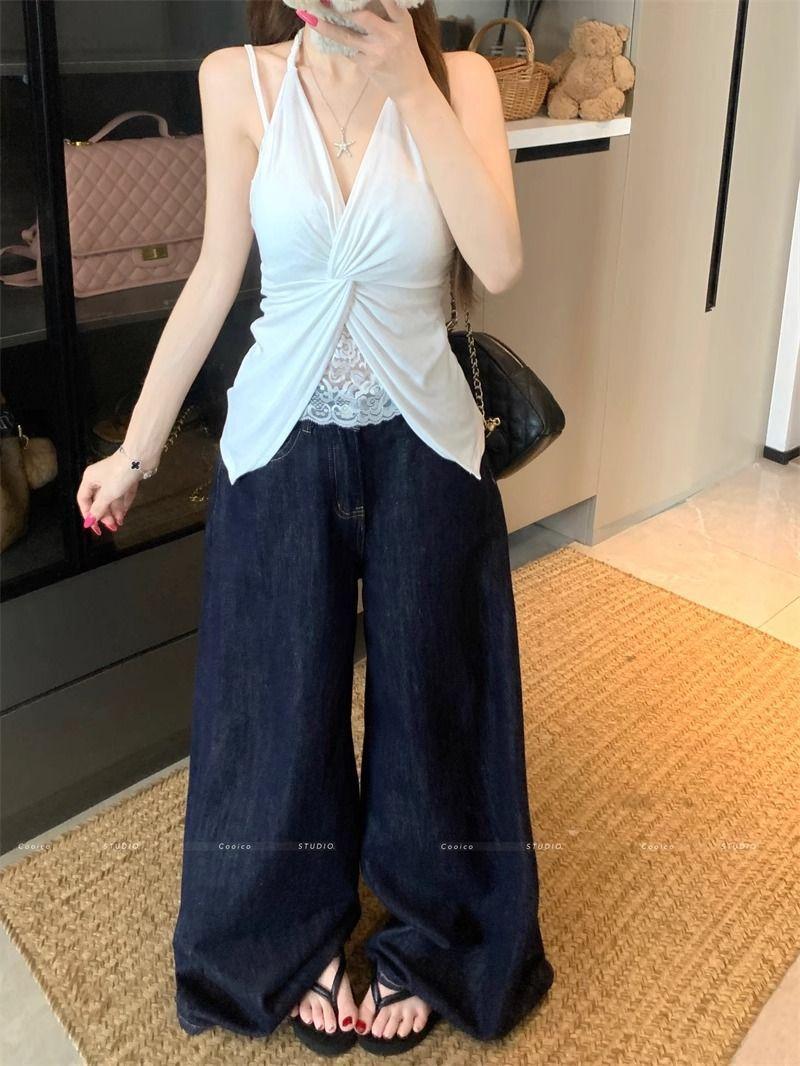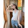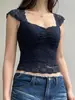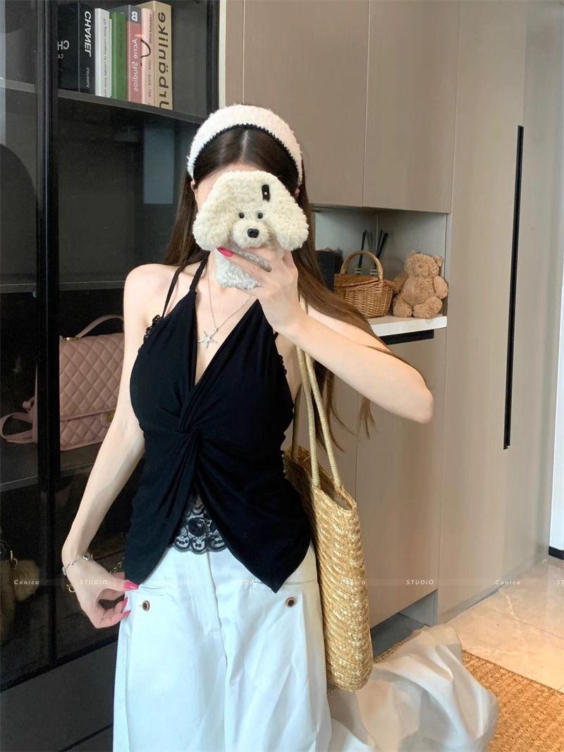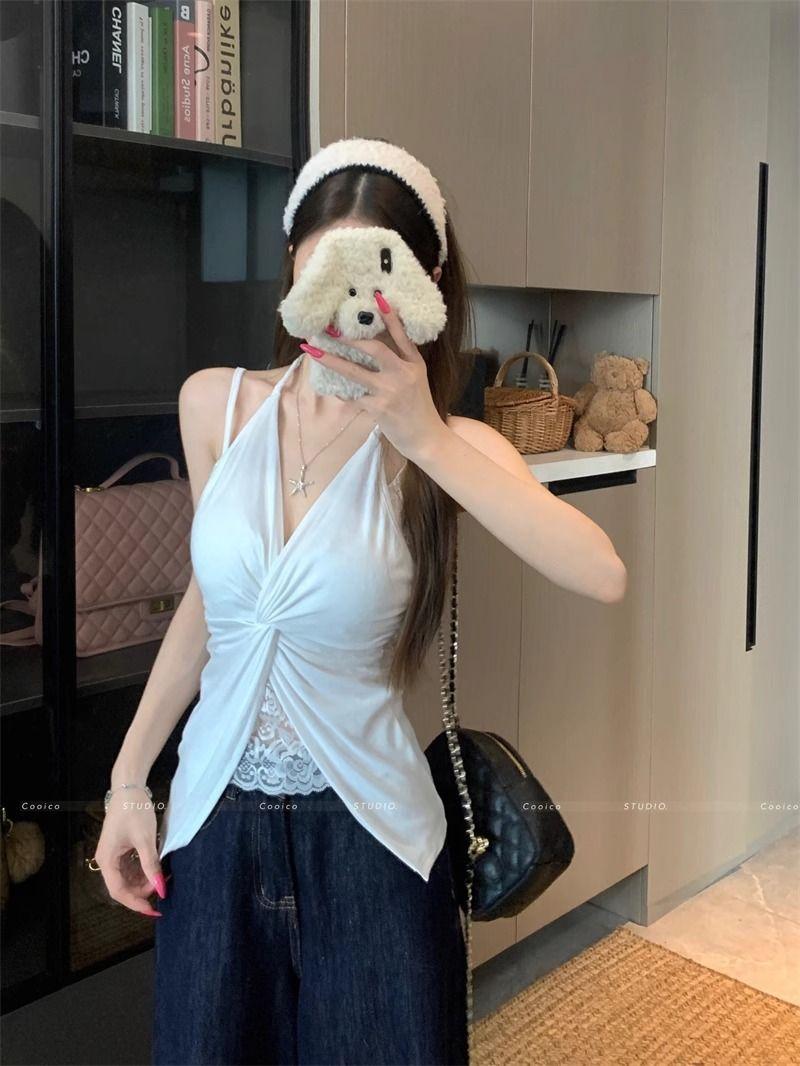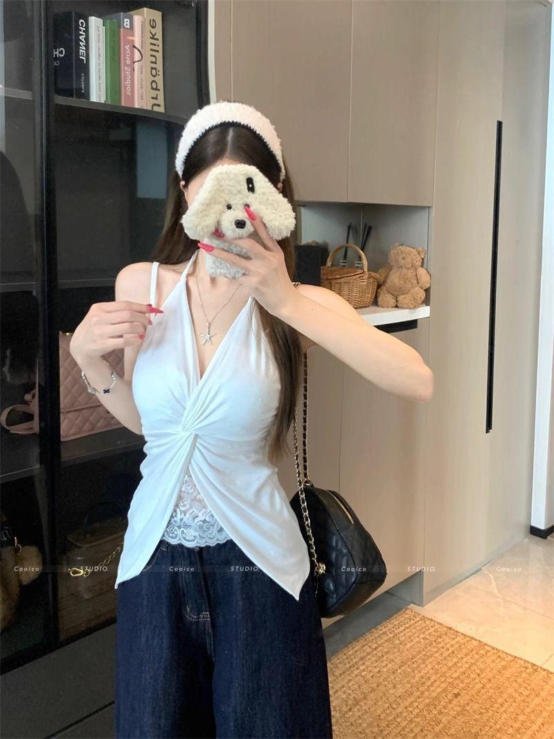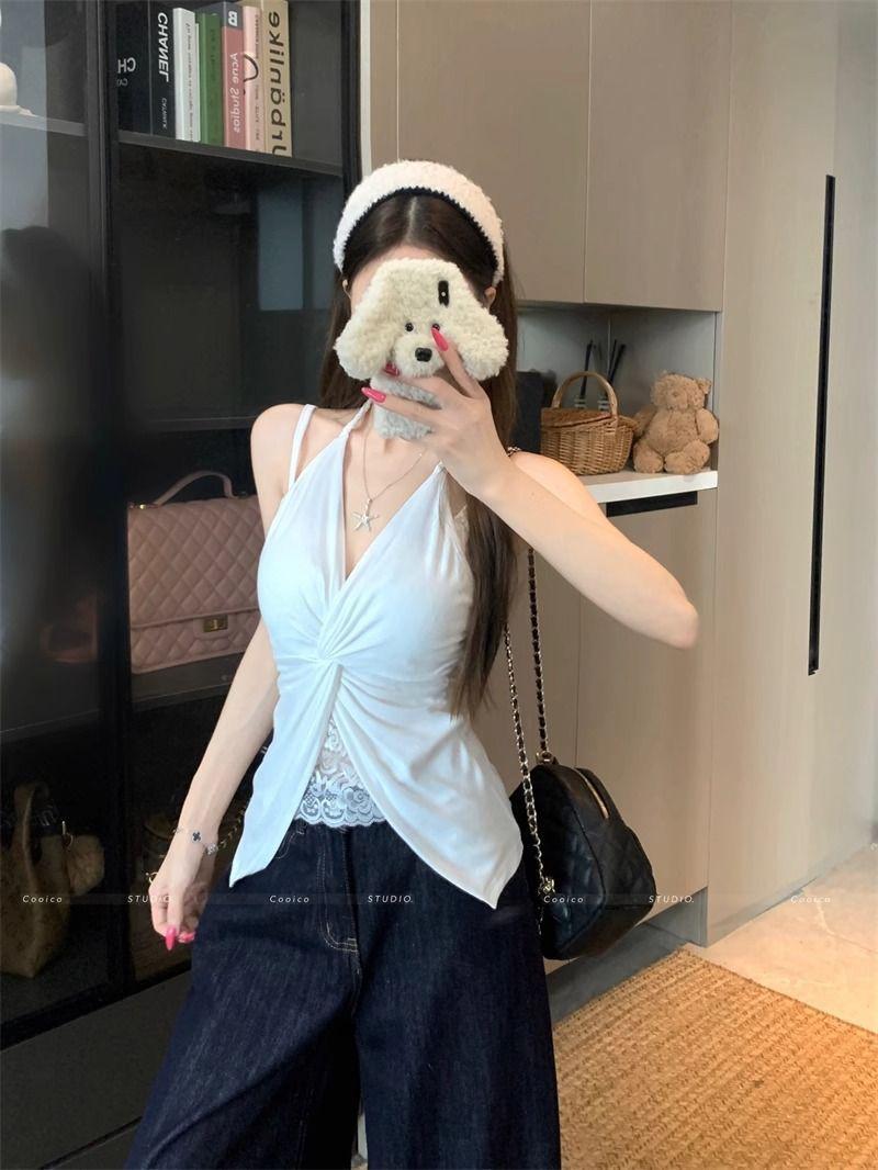 Diseño Sexy Encaje Empalmado Chaleco sin Mangas Verano Nuevo Giro Cuello en V Sexy Halter Slim Top Corto