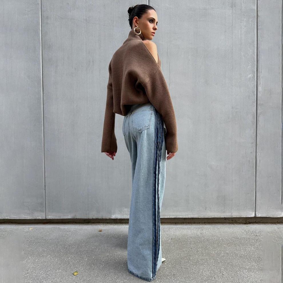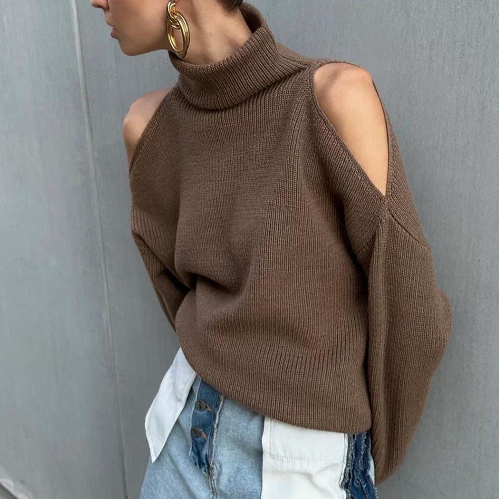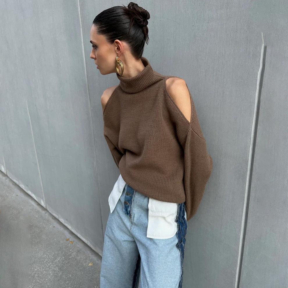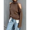 Nuevo Otoño/Invierno Sentido del Diseño Hombro Descubierto Cuello Alto Manga Larga Suéter de Moda