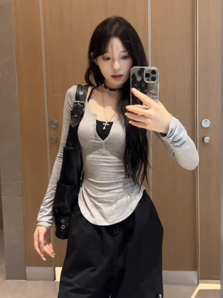 Moda Otoño Sentido de Diseño Nicho Camiseta de Manga Larga Estilo Spice Girls Ajustado Adelgazante Deseo Puro Sexy Chic Top Ins Mujeres