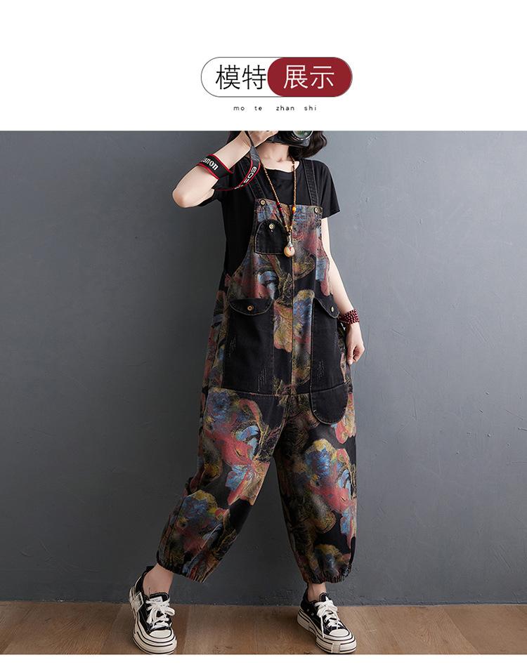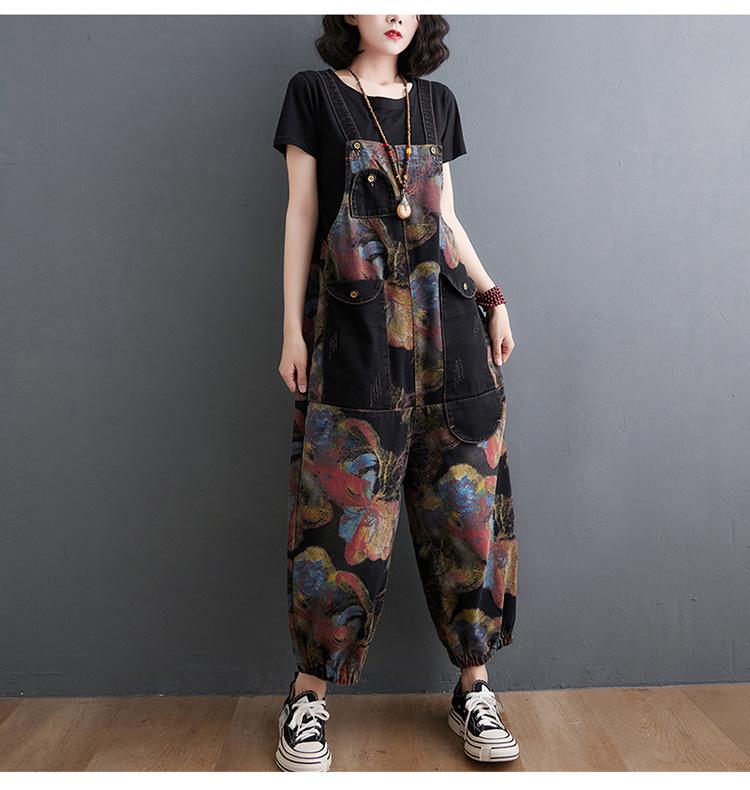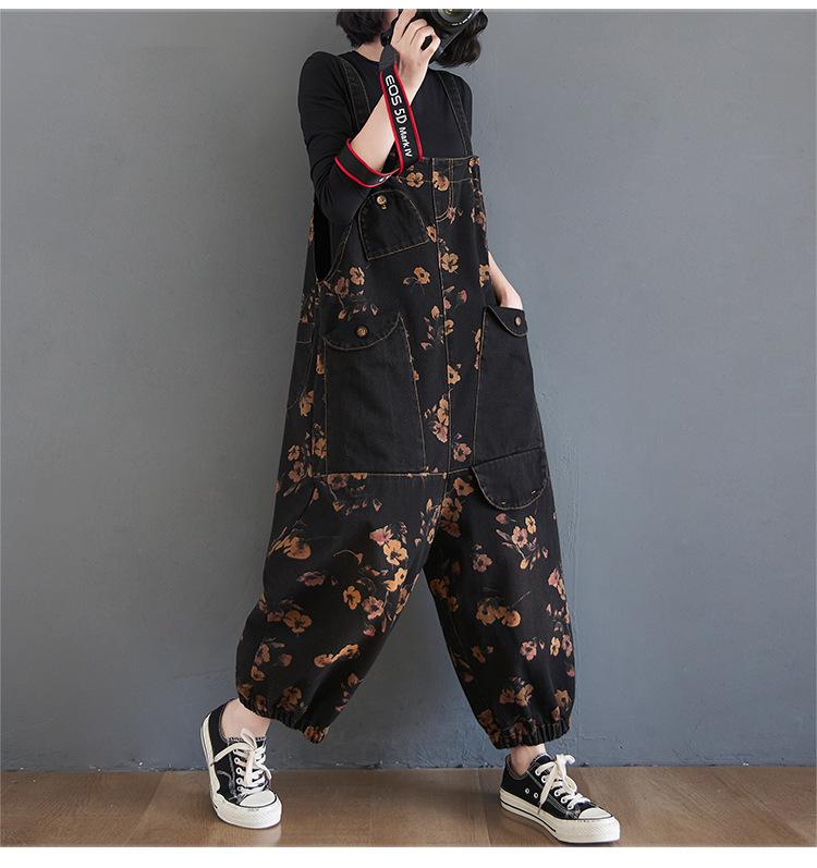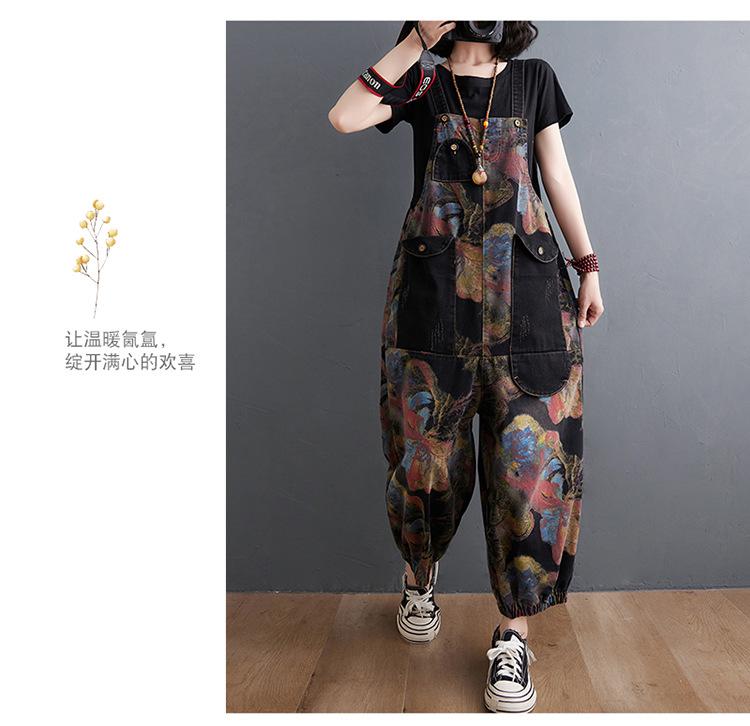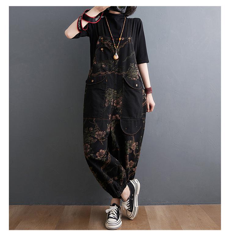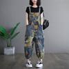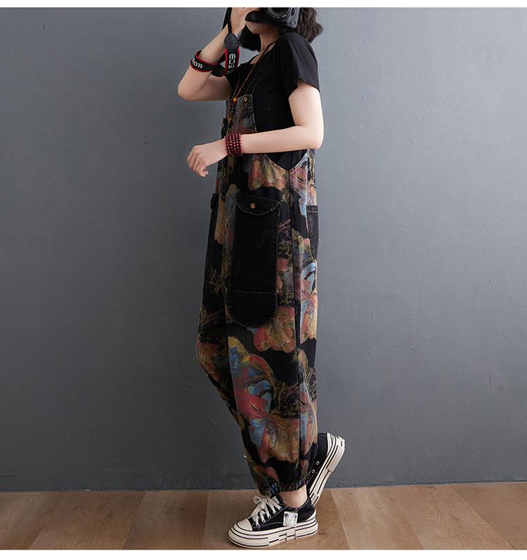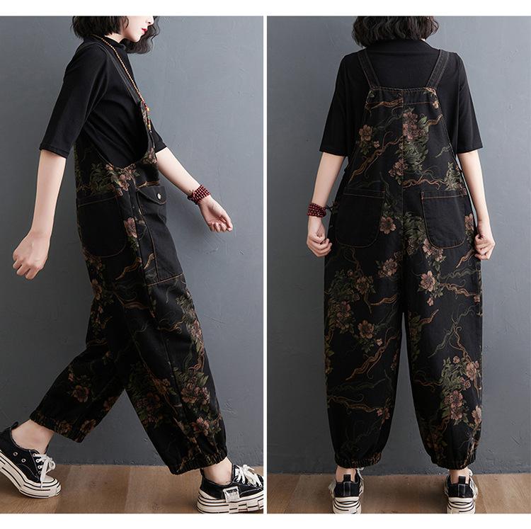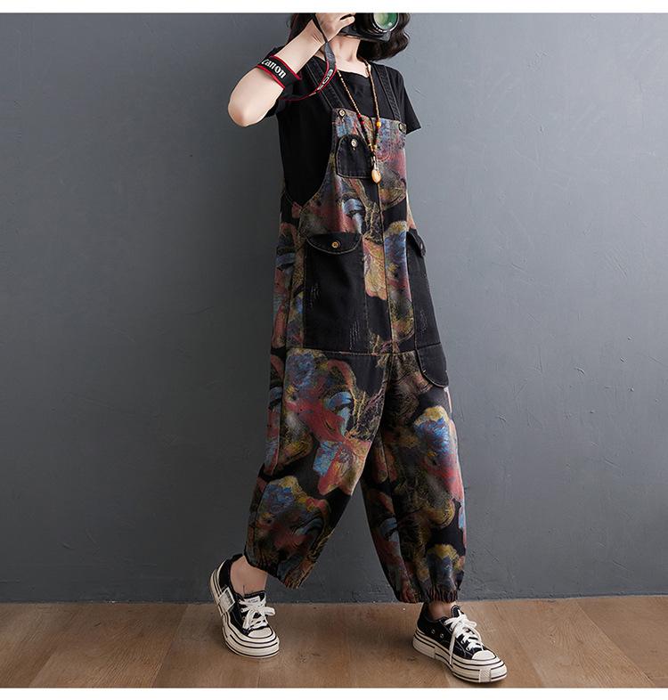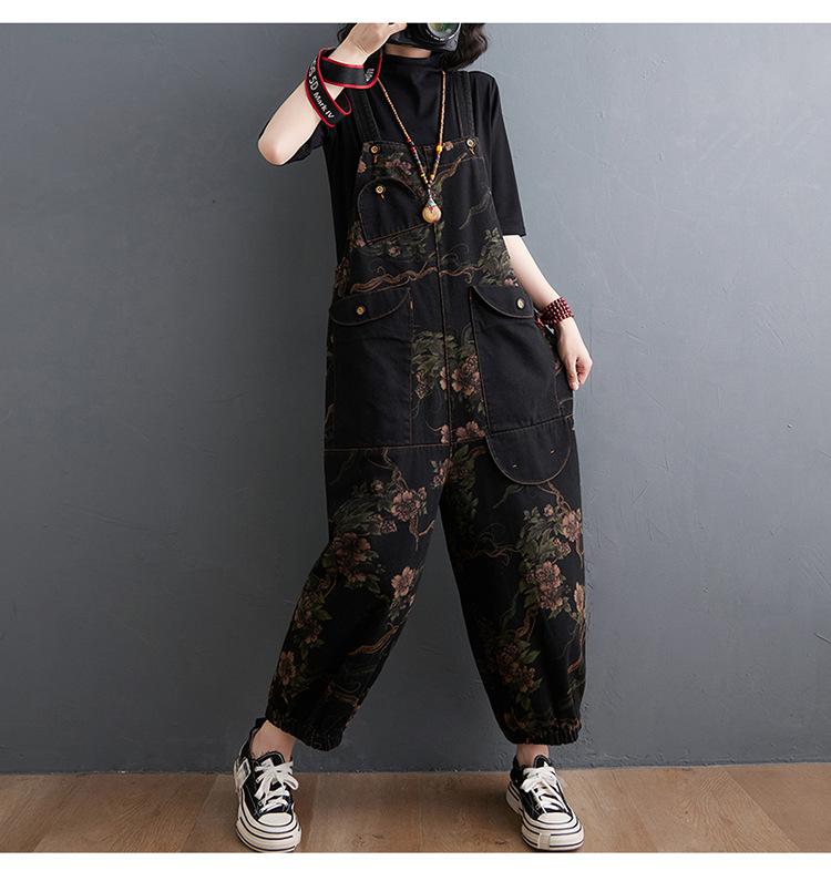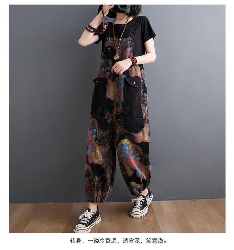 Overol de mezclilla de verano para mujer de talla grande, holgado, estampado, con bolsillo grande, entrepierna caída, pantalones harem casuales