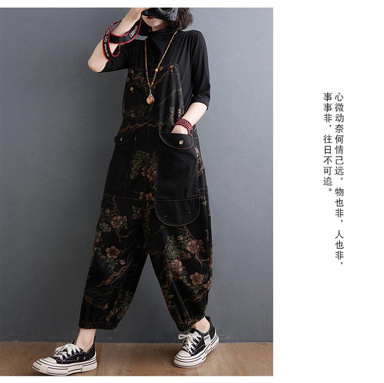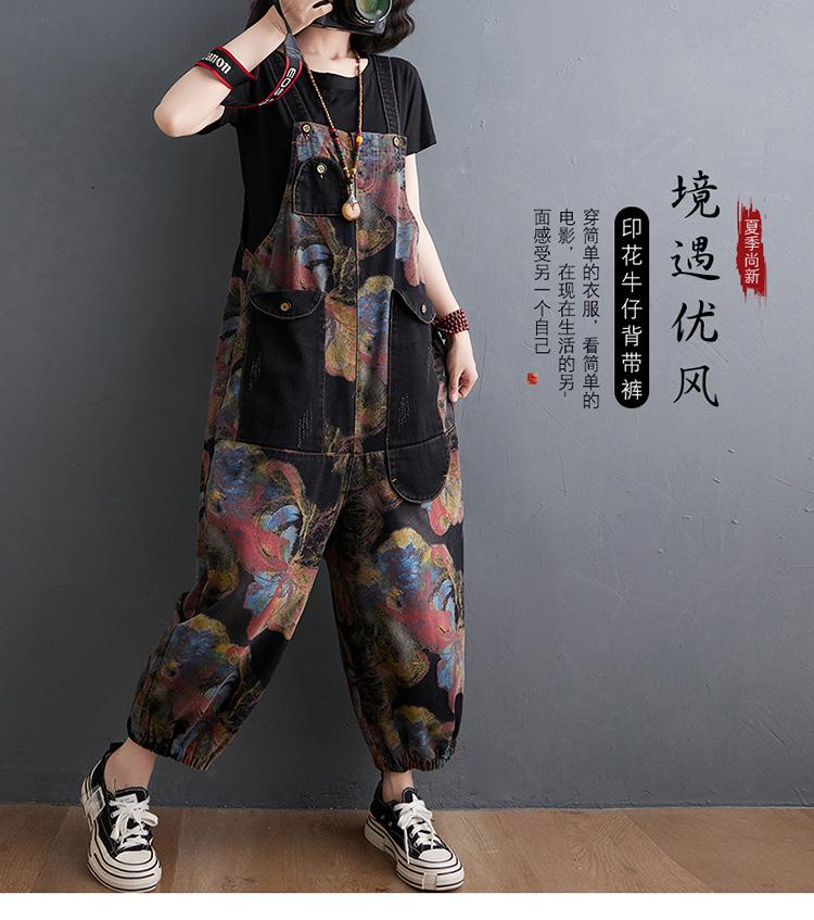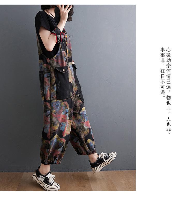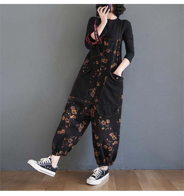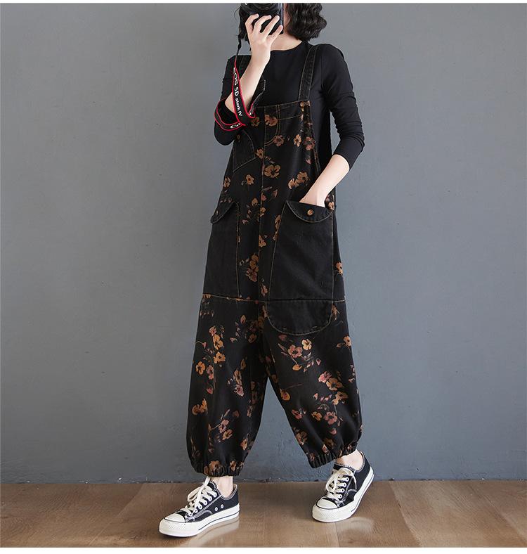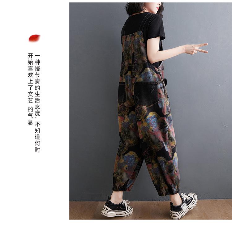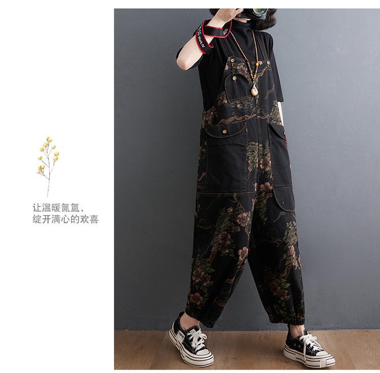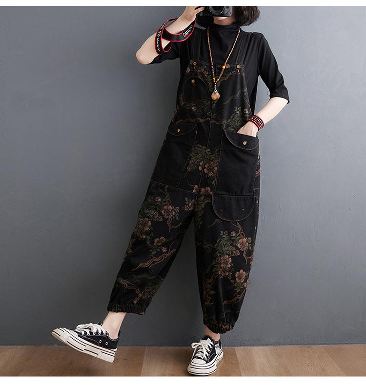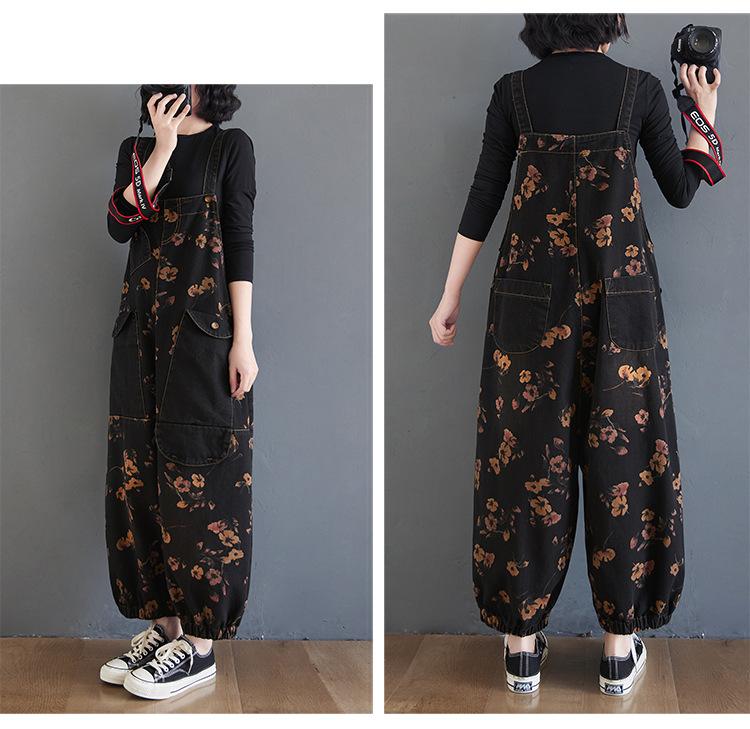 Overol de mezclilla de verano para mujer de talla grande, holgado, estampado, con bolsillo grande, entrepierna caída, pantalones harem casuales
