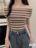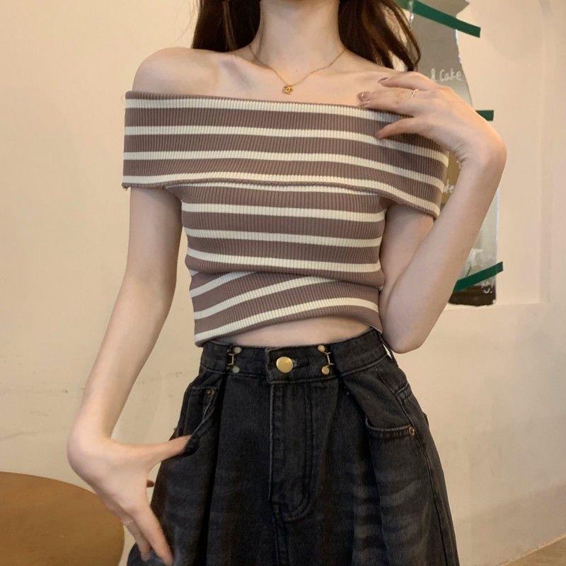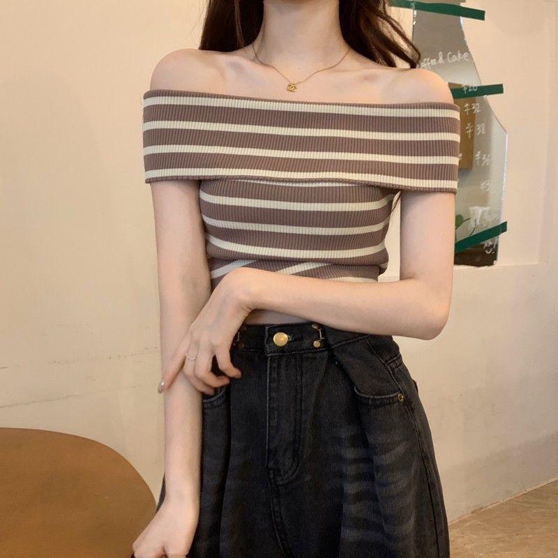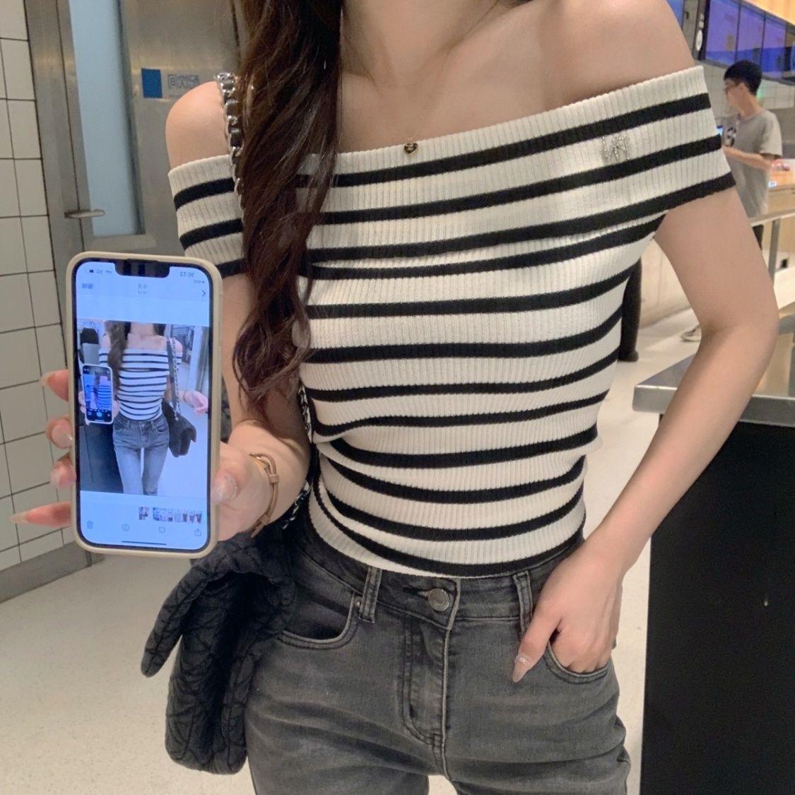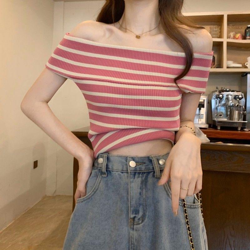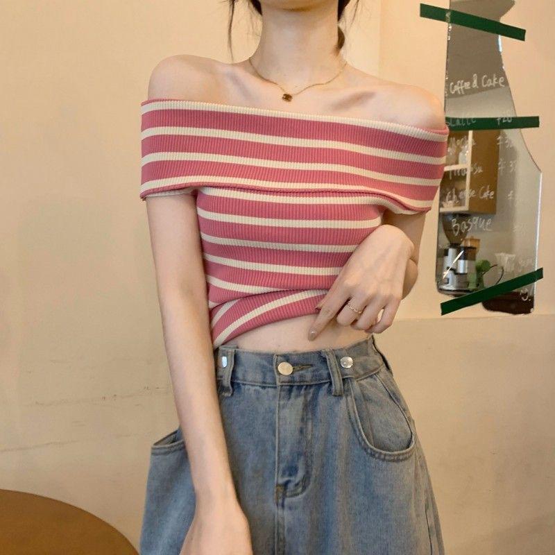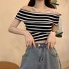 Playera tejida de rayas con hombros descubiertos, corte ajustado y adelgazante para mujer Verano 2024 Nuevo diseño nicho con sentido de la moda top corto