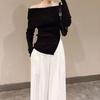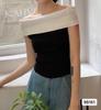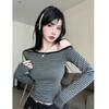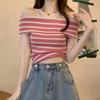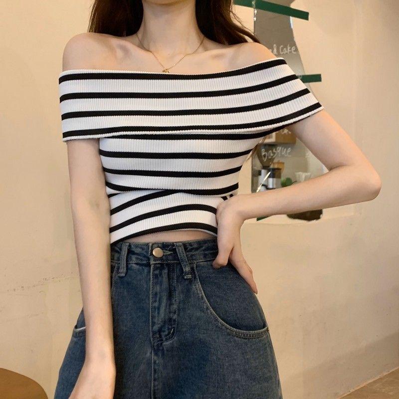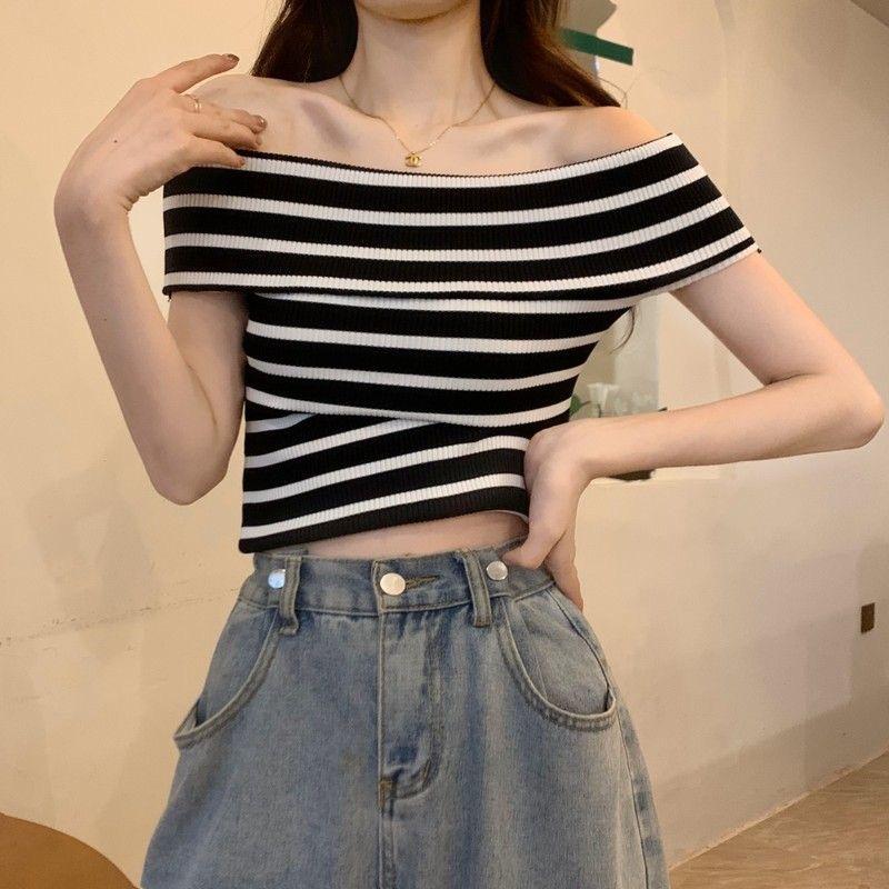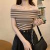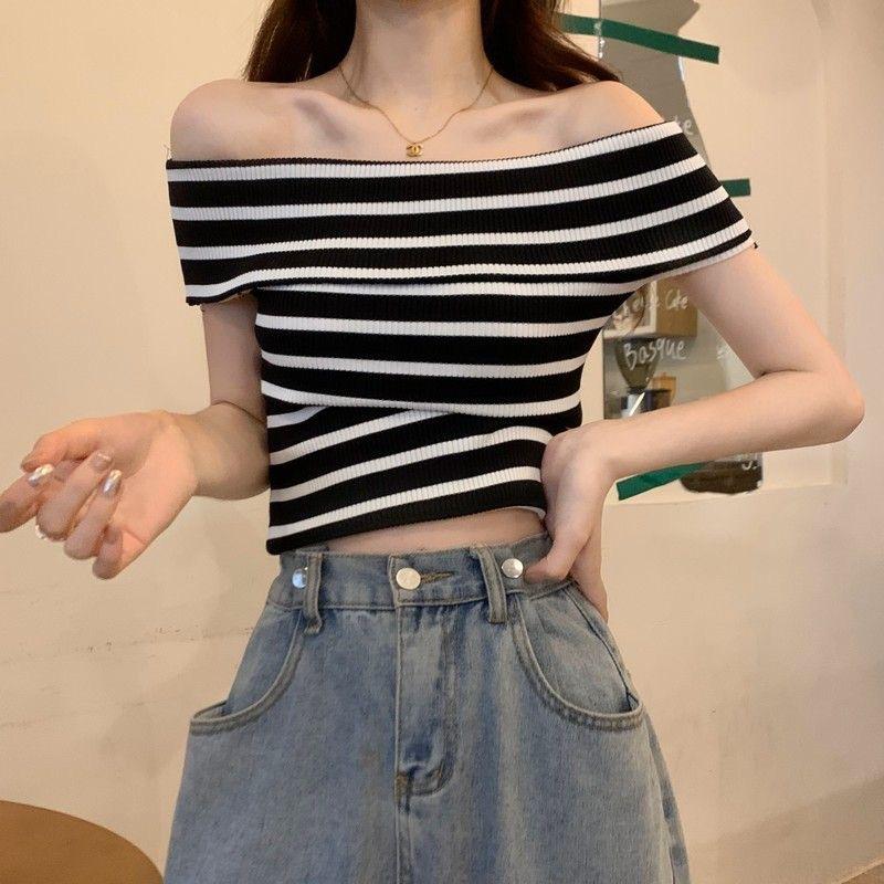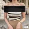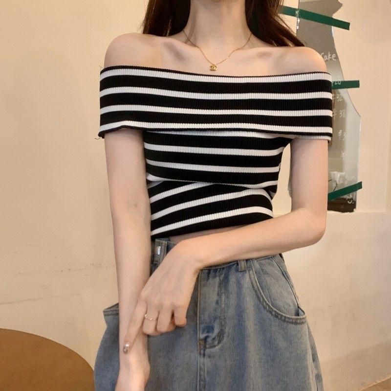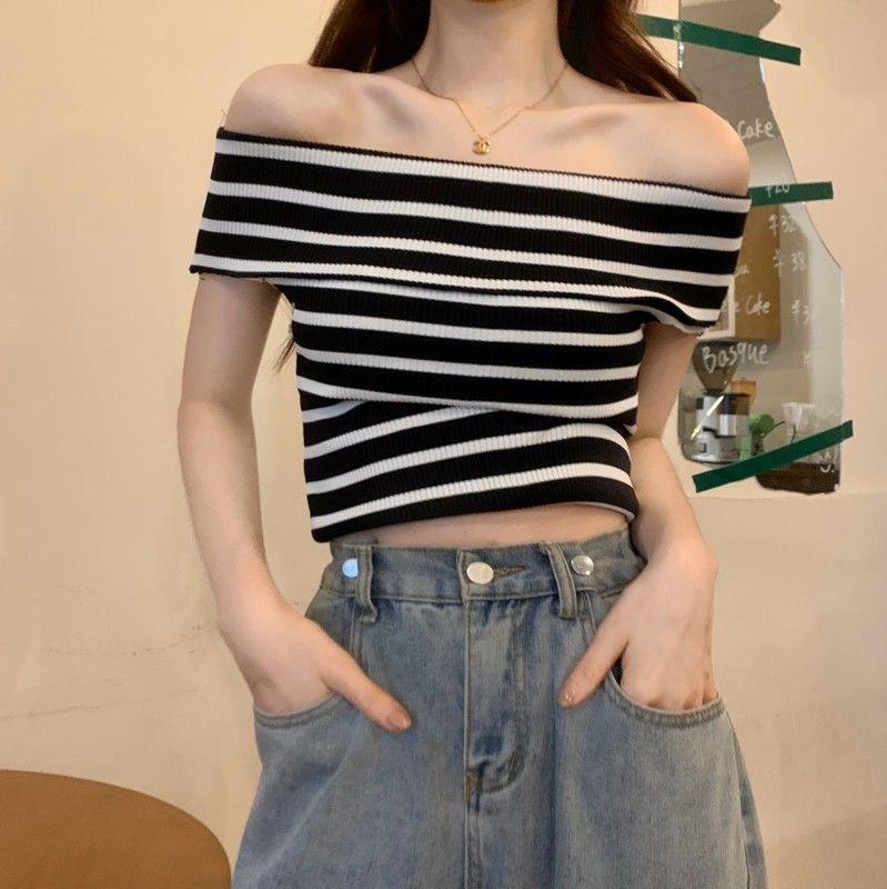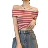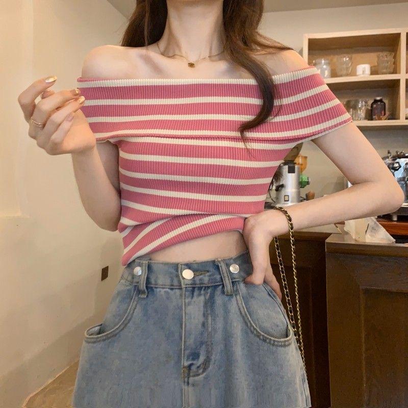 Playera tejida de rayas con hombros descubiertos, corte ajustado y adelgazante para mujer Verano 2024 Nuevo diseño nicho con sentido de la moda top corto