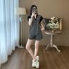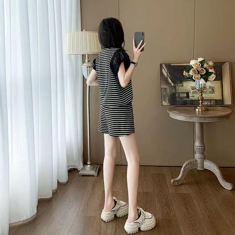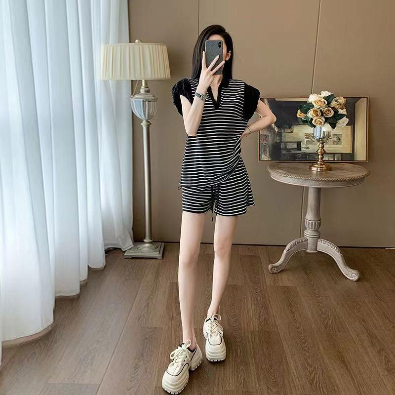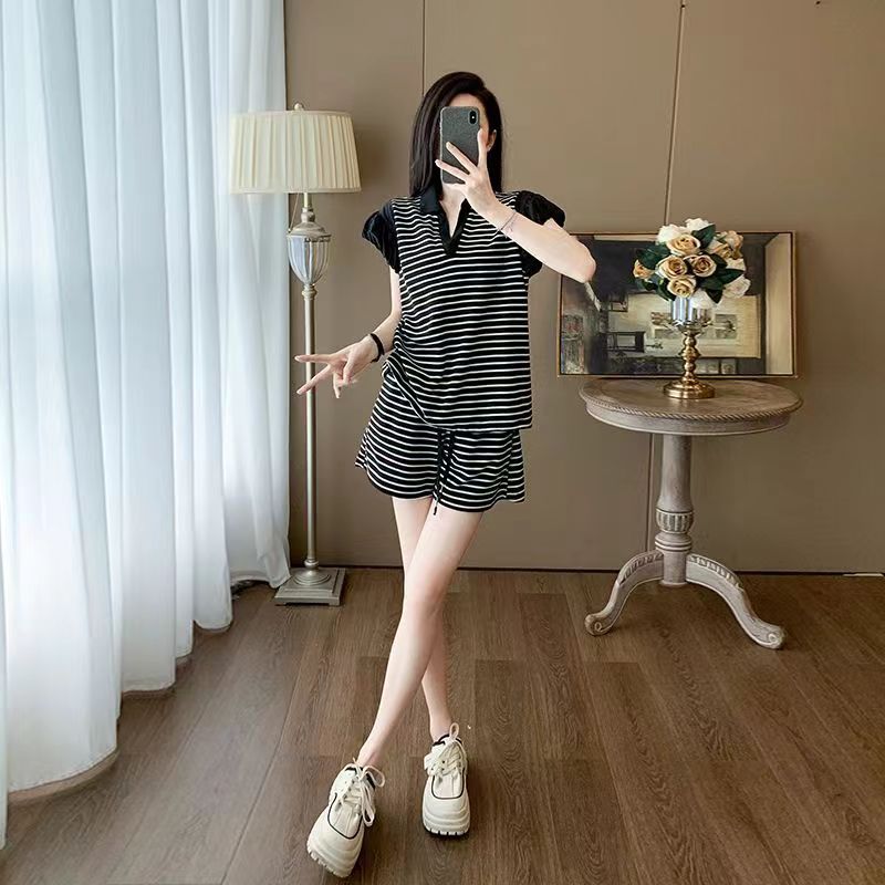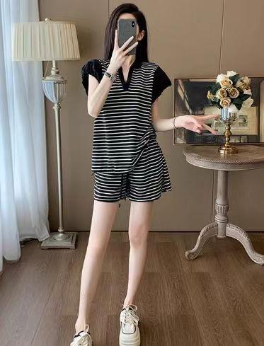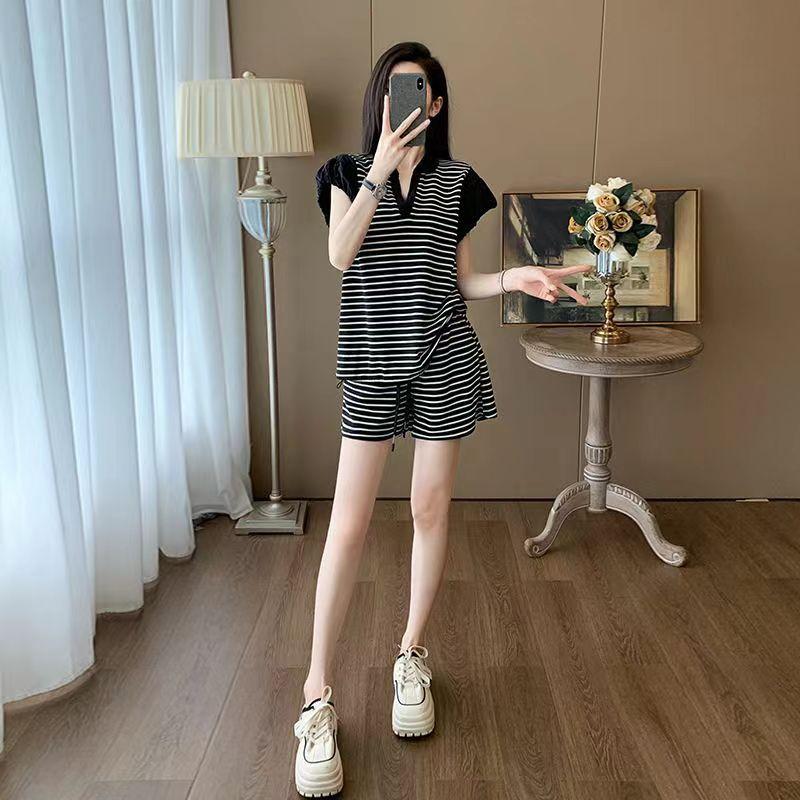 Traje corto de manga corta a rayas blancas y negras Moda para mujer Estilo occidental Moderno Elegante Verano Casual Deportivo Conjunto de dos piezas Adelgazante