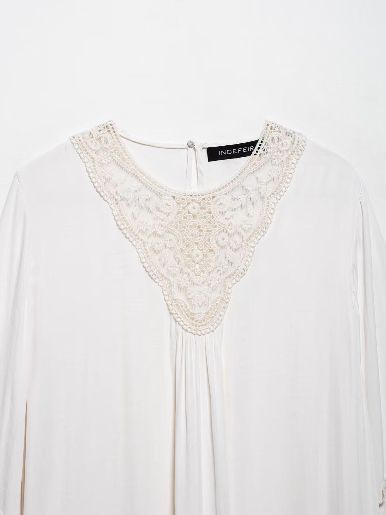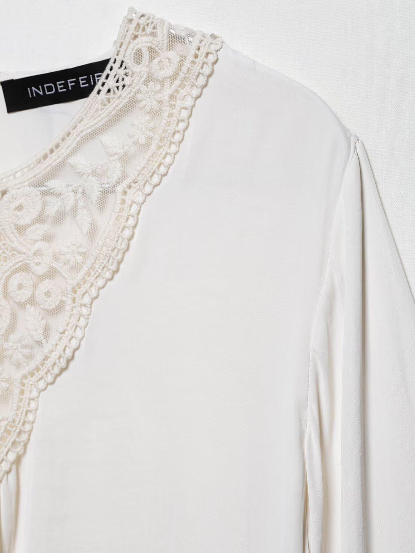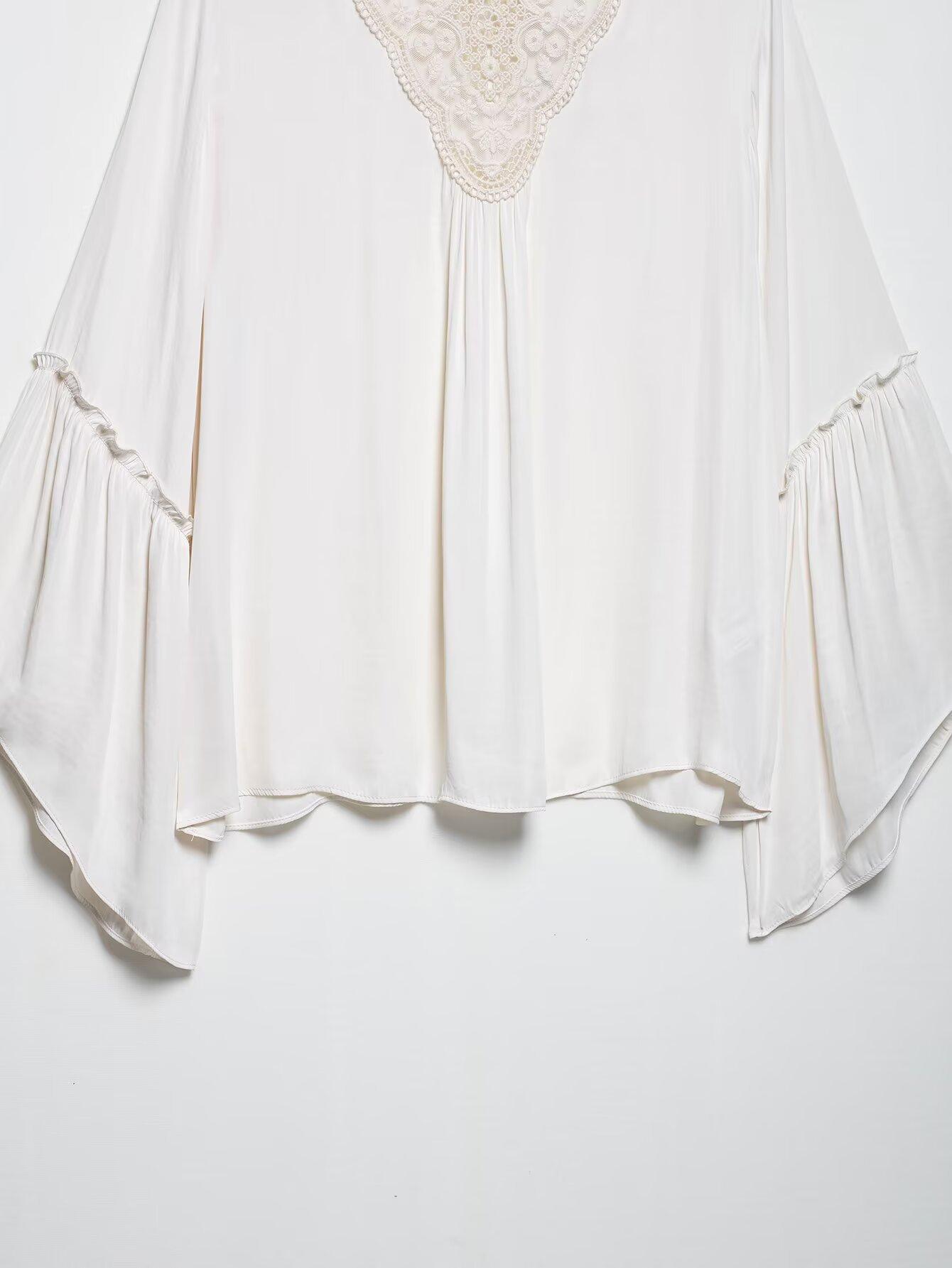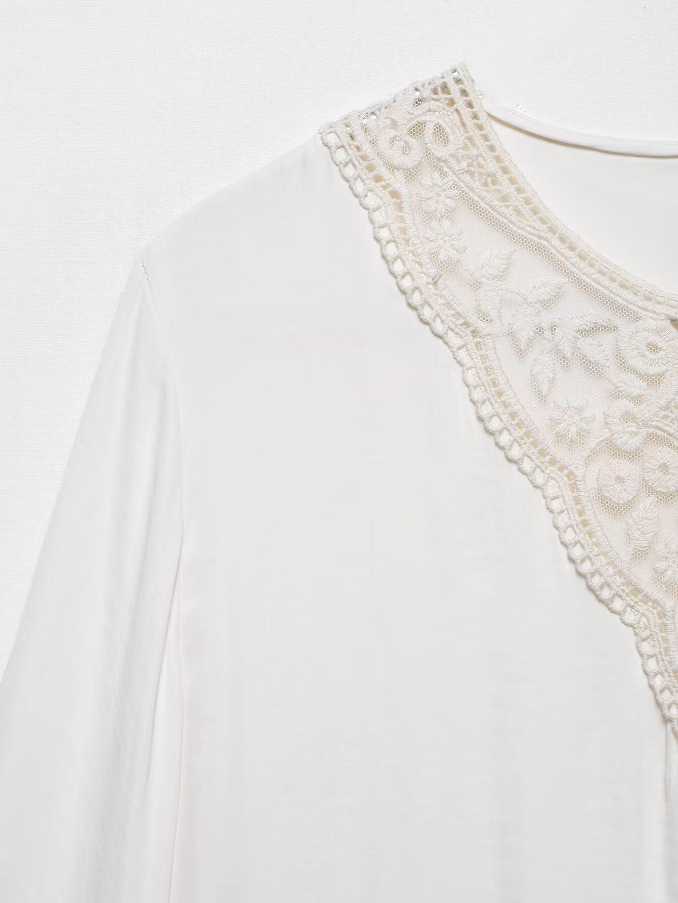Ropa de Mujer de Exportación Transfronteriza Primavera y Verano 2025 Estilo Europeo y Americano Cuello en V Encaje Empalmado Camisa Plisada Drapeada para Mujer D6248520