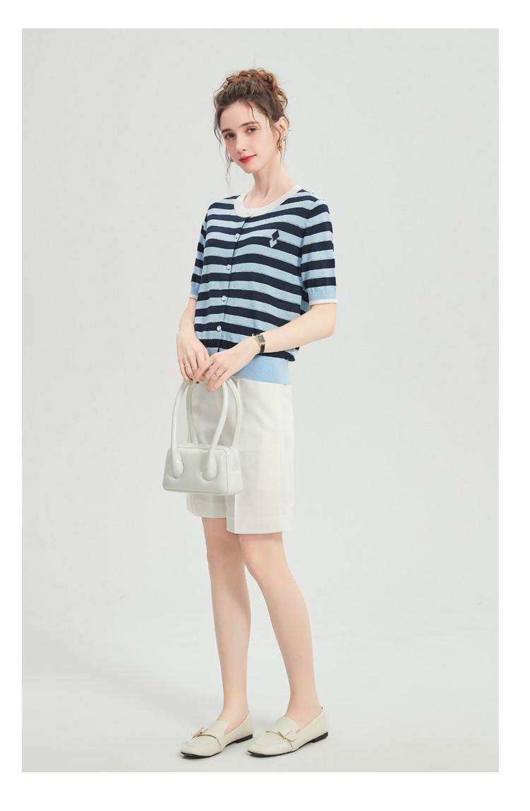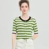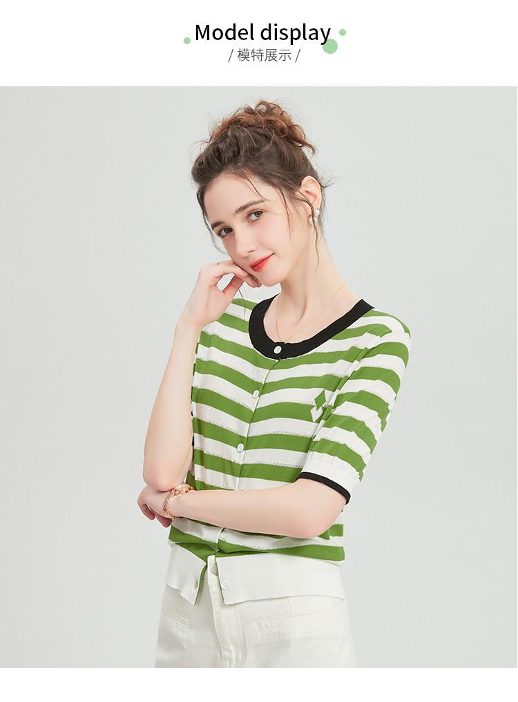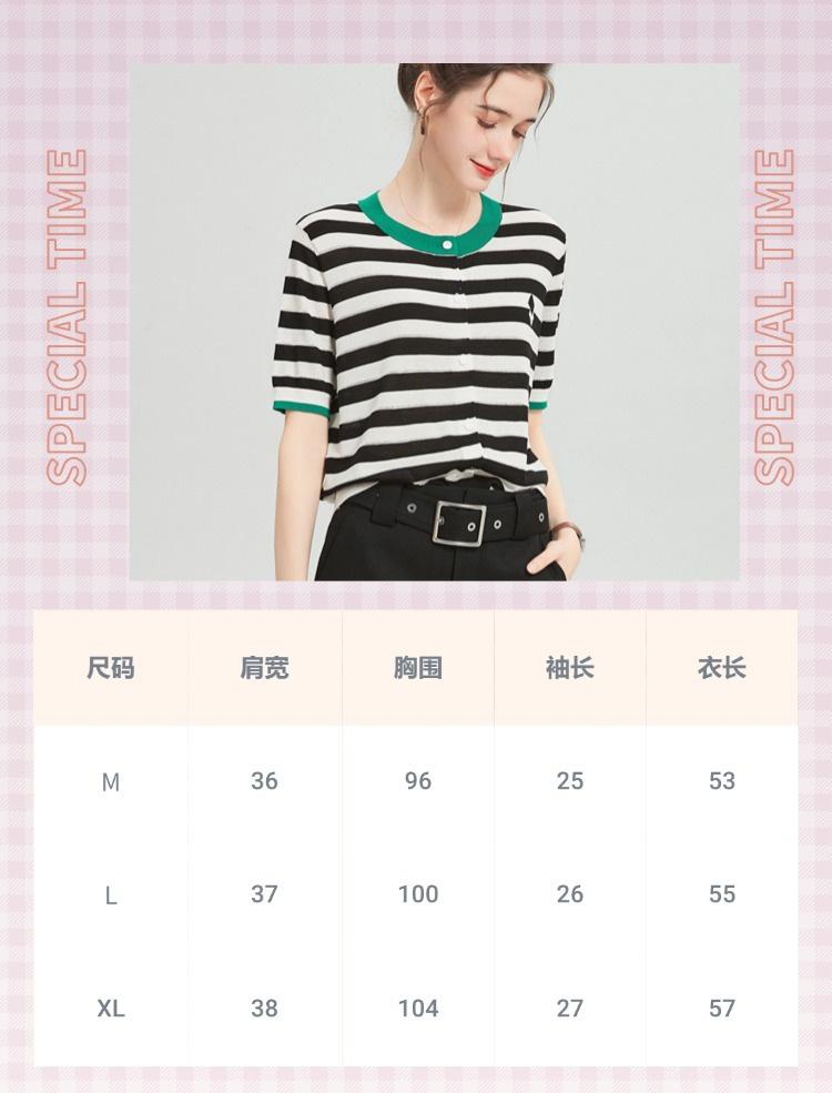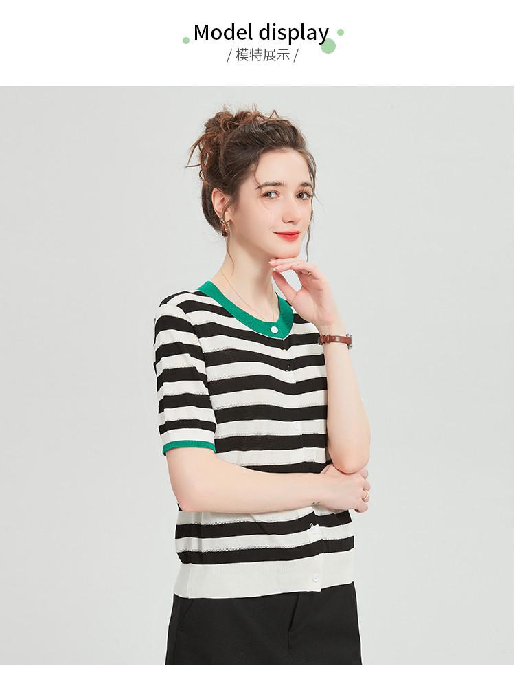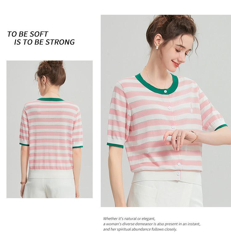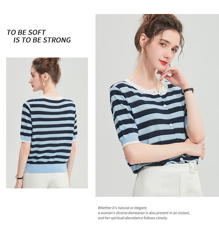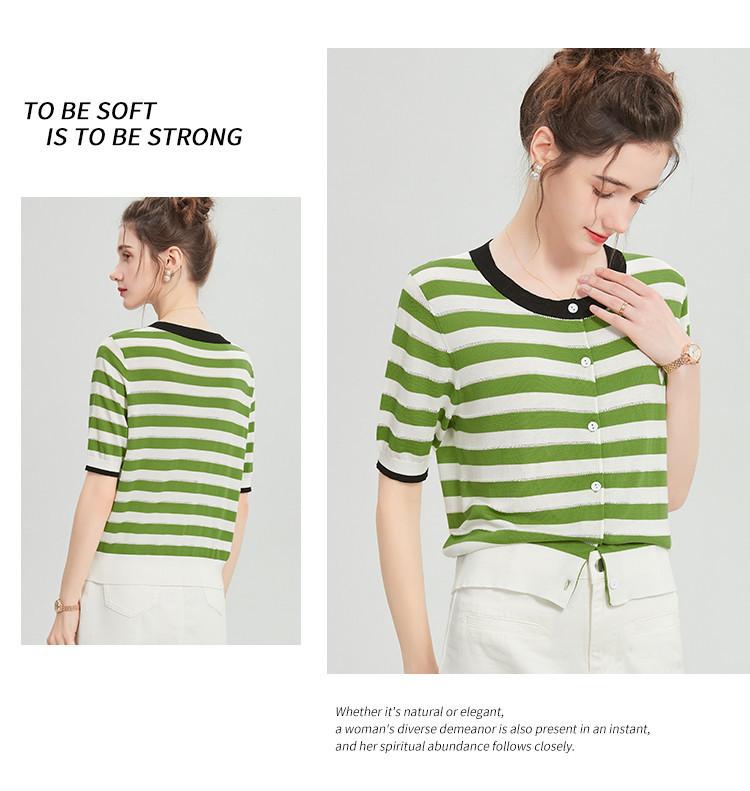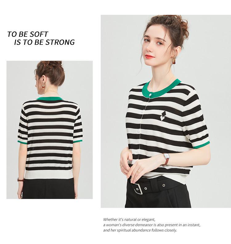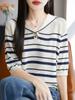 Camiseta de Punto a Rayas de Lyocell Tencel Francés Reductora de Edad para Mujer, Cárdigan de Media Manga 25 Nuevo Top de Verano