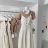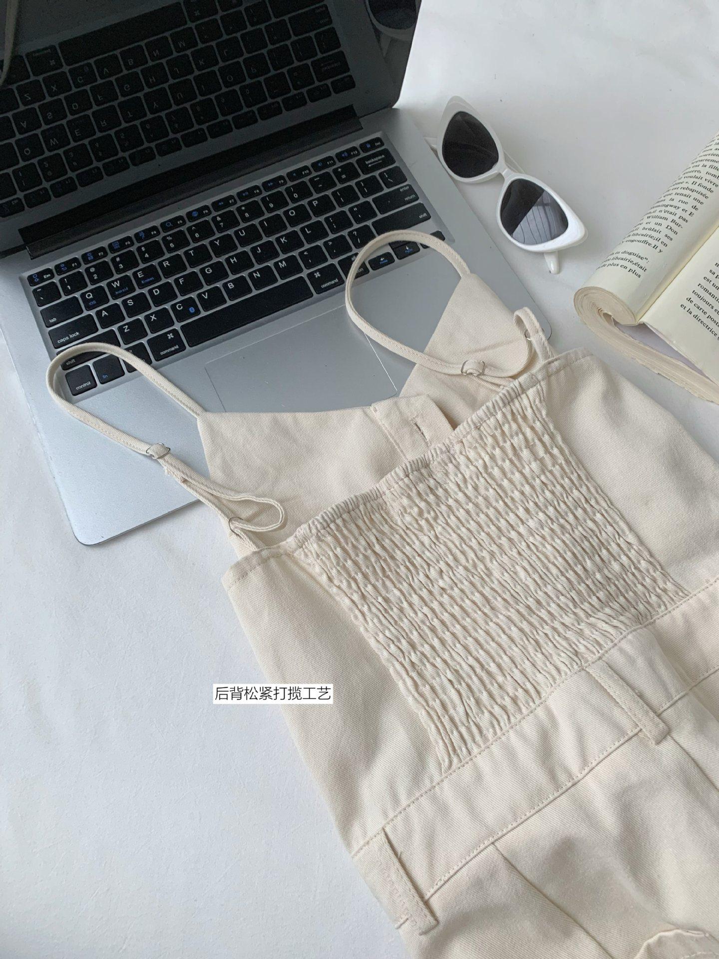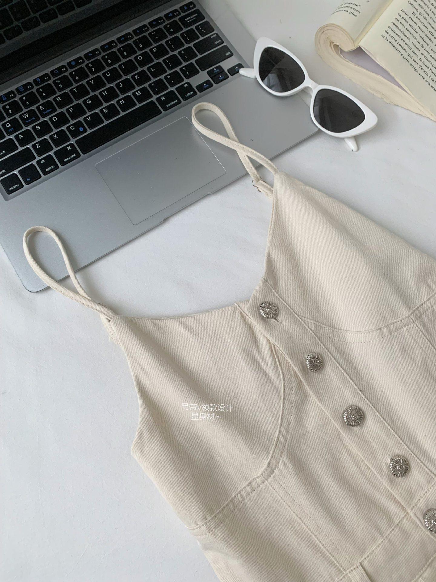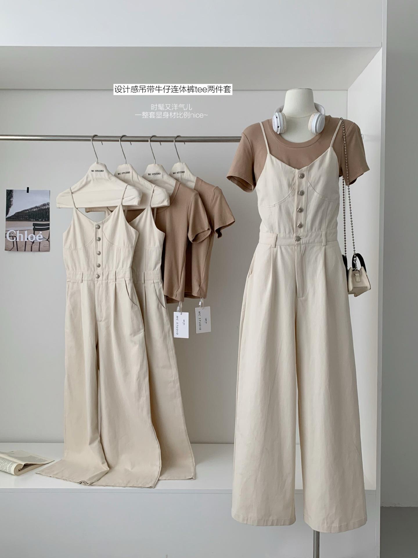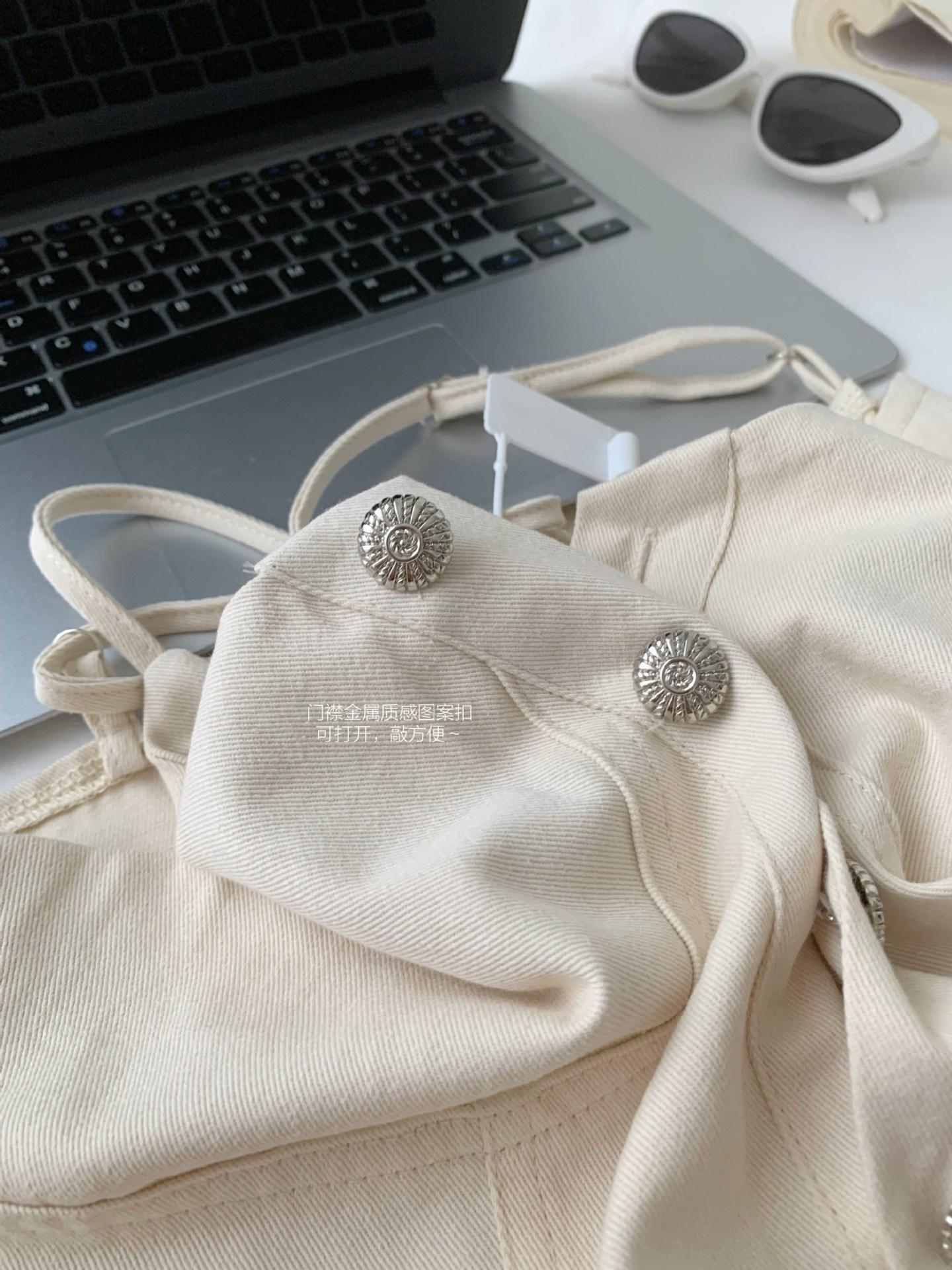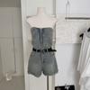 Mono de mezclilla vintage con tirantes dorados, cuello en U y manga corta