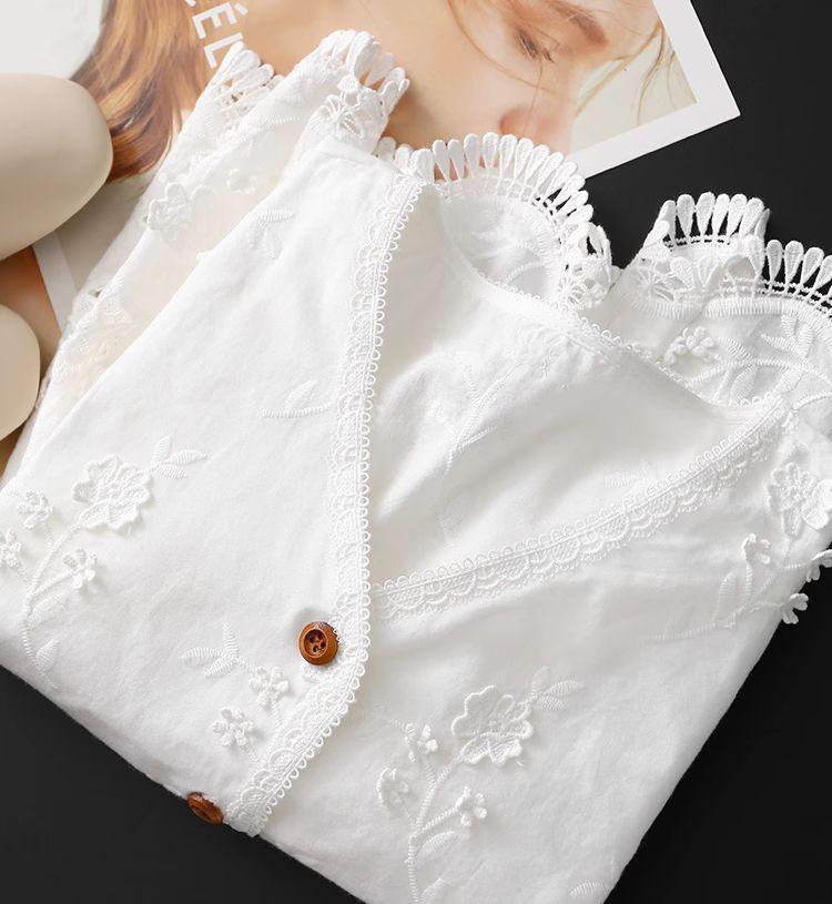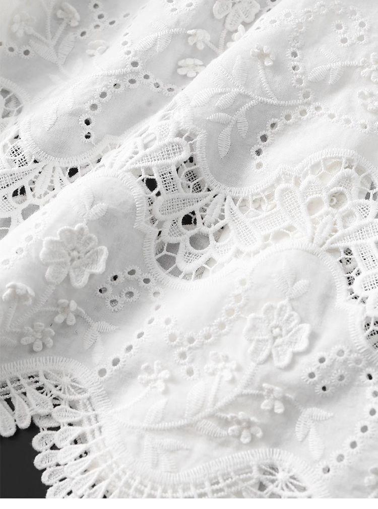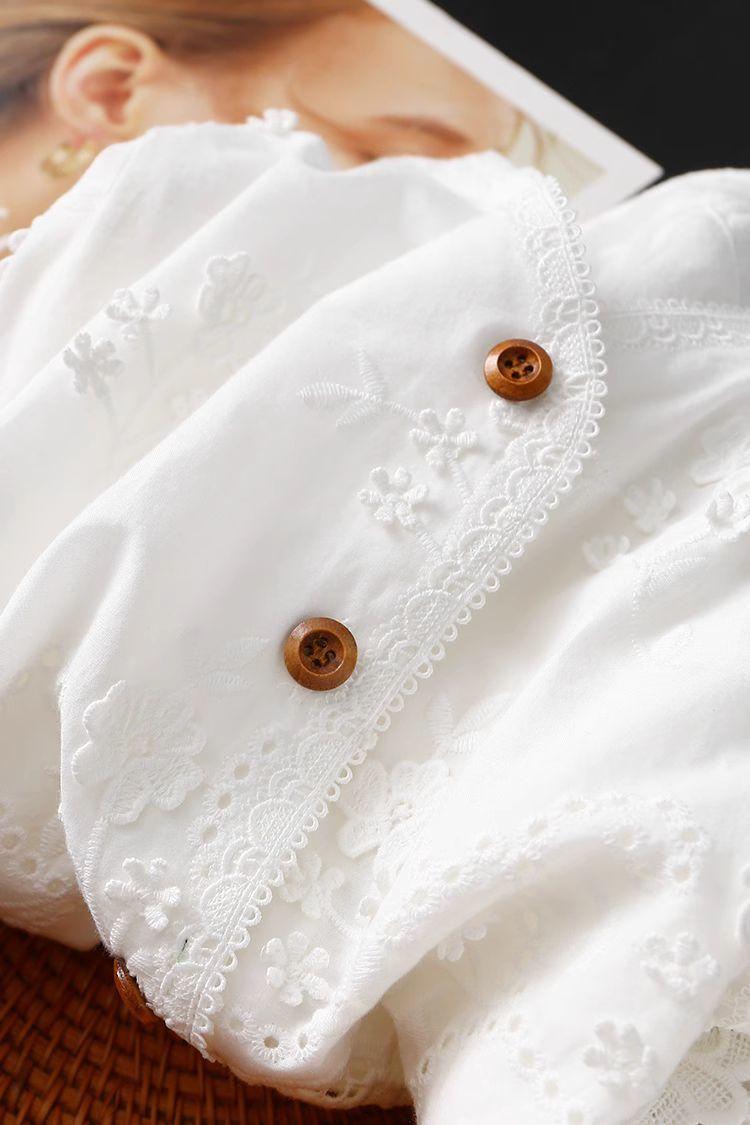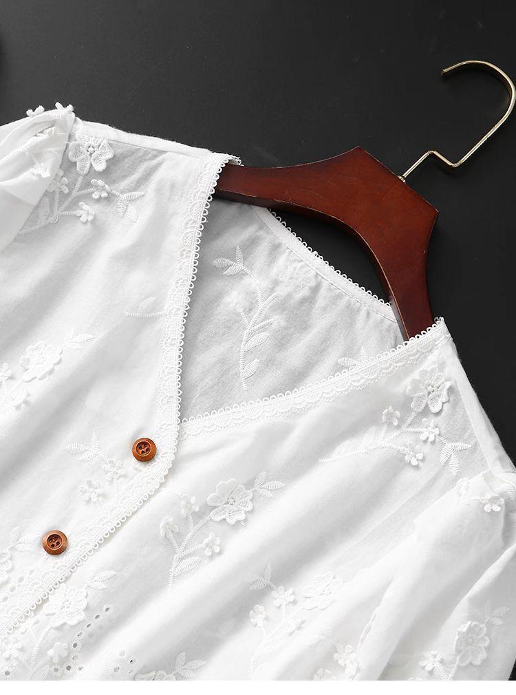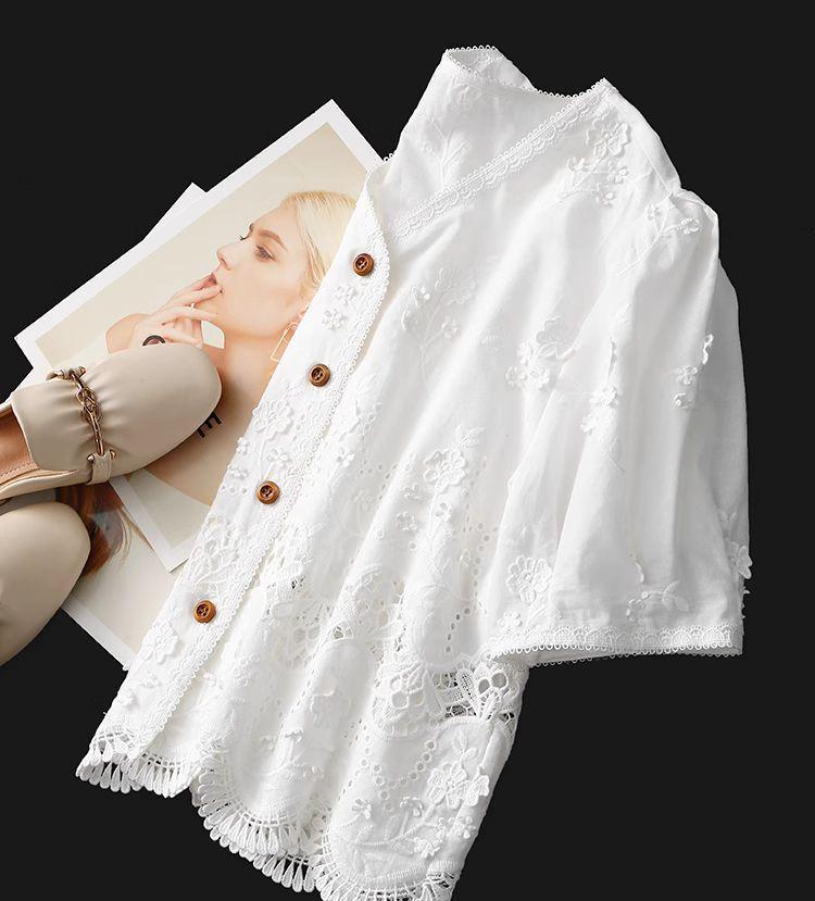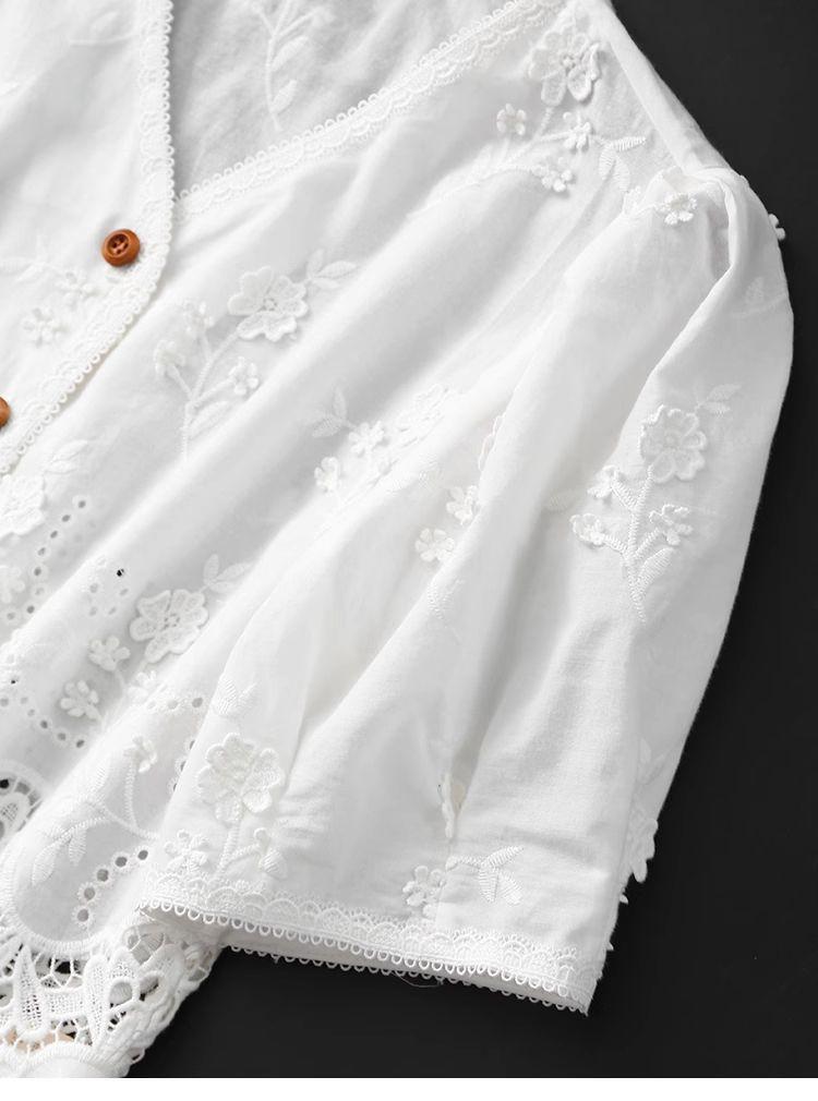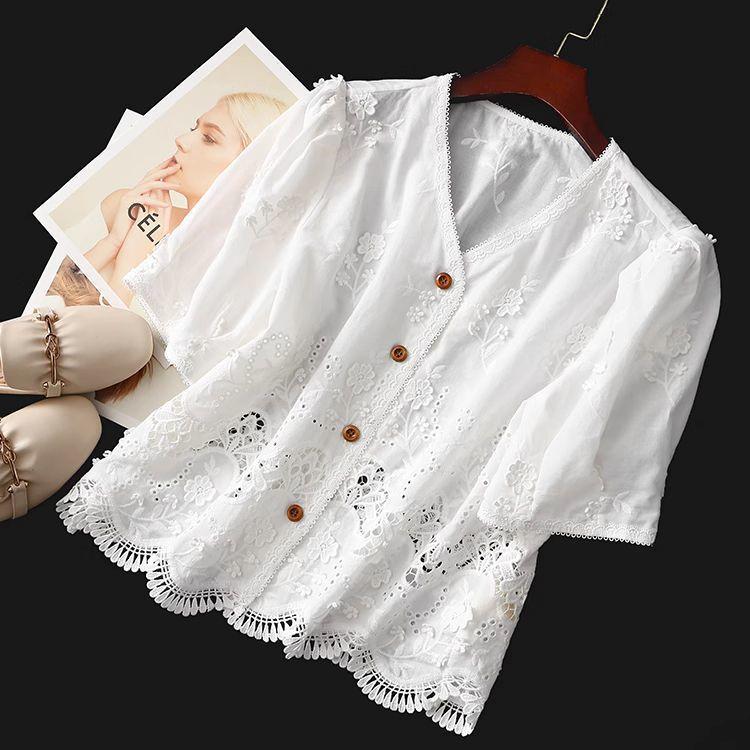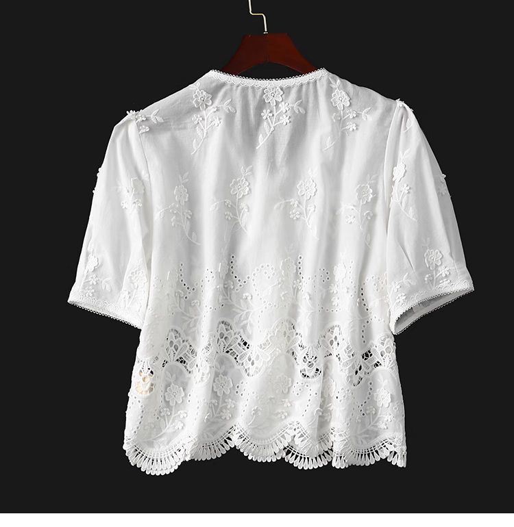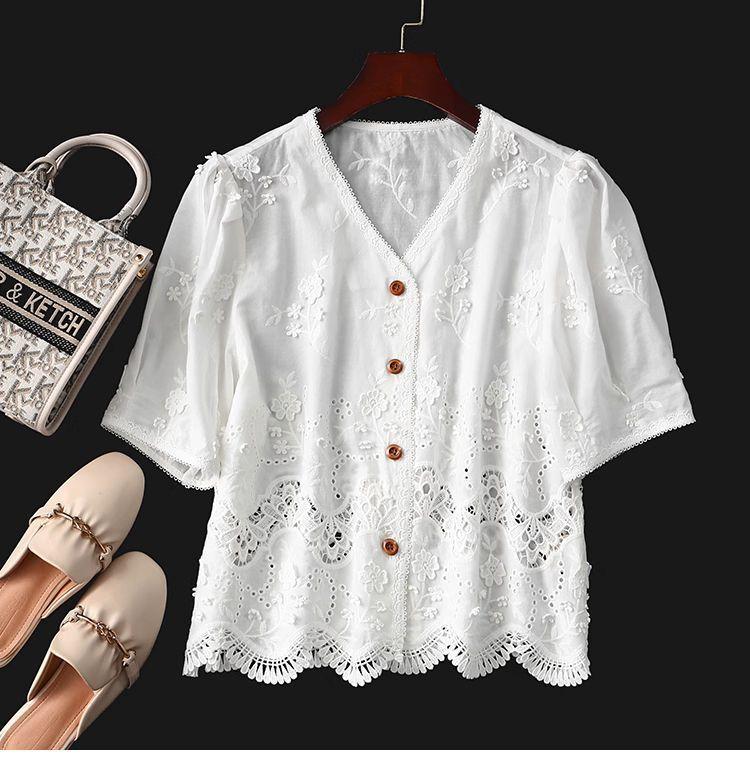 Camiseta de manga corta de algodón puro con cuello en V, estilo francés, de lujo, resistente, tridimensional, con estampado floral de crochet, calado, temperamento suave