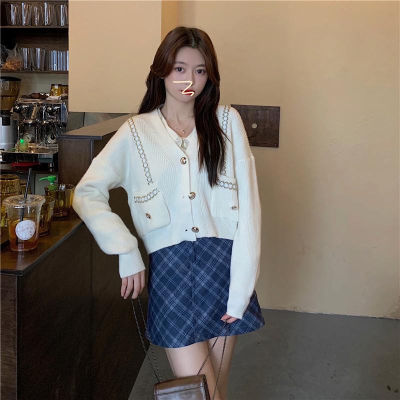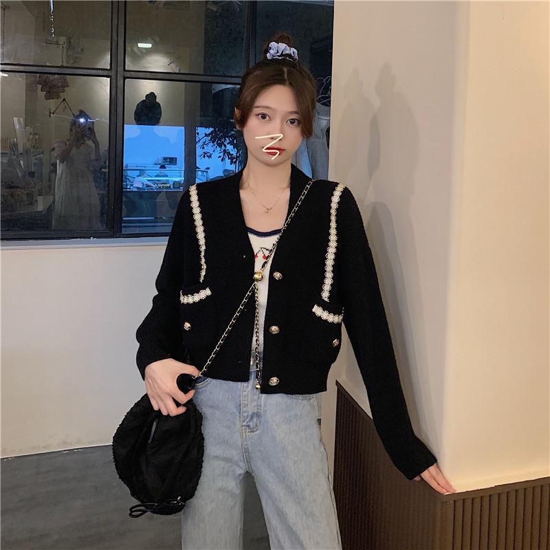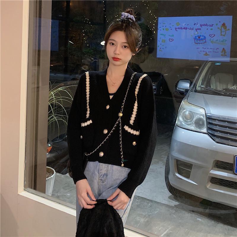 Abrigo estilo Chanel Suéter corto con cuello en V Diseño de nicho para mujer Manga larga Estilo holgazán Primavera y otoño Cárdigan de punto Top