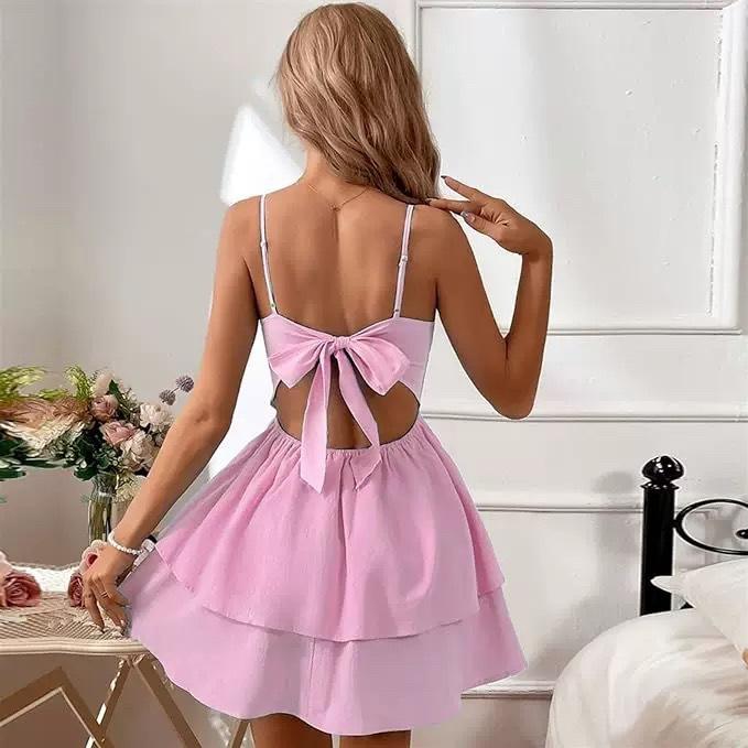 2025 Primavera y Verano Transfronterizo Europeo y Americano Estilo Caliente Amazon Falda Corta con Espalda Descubierta y Tirantes de Lazo Vestido Sexy de Tirantes