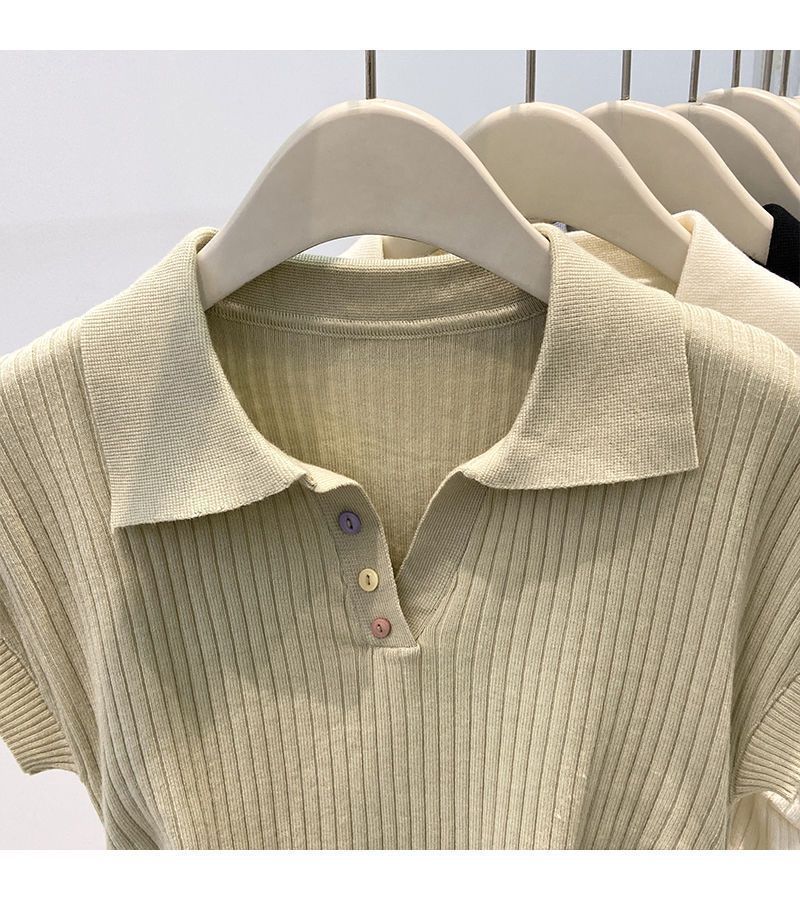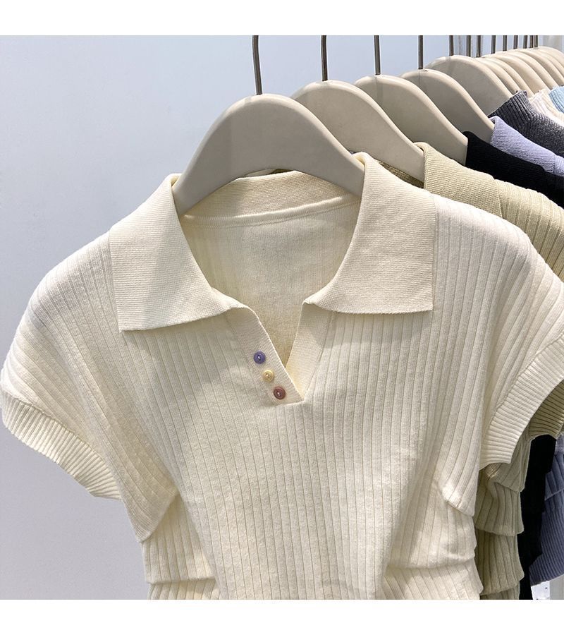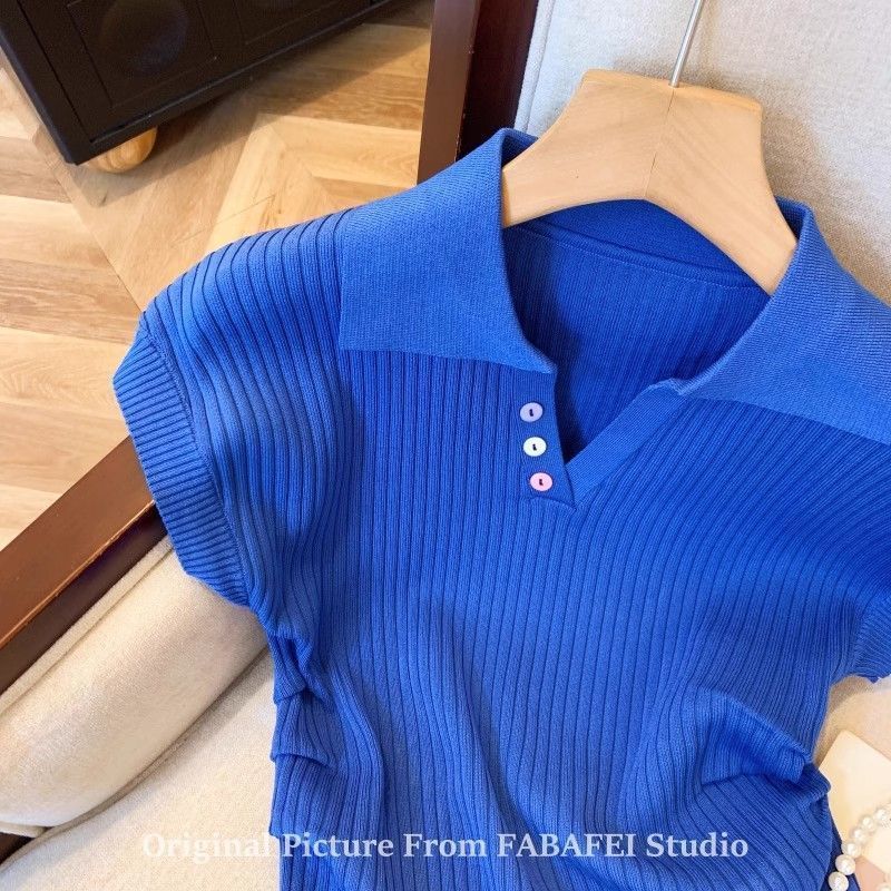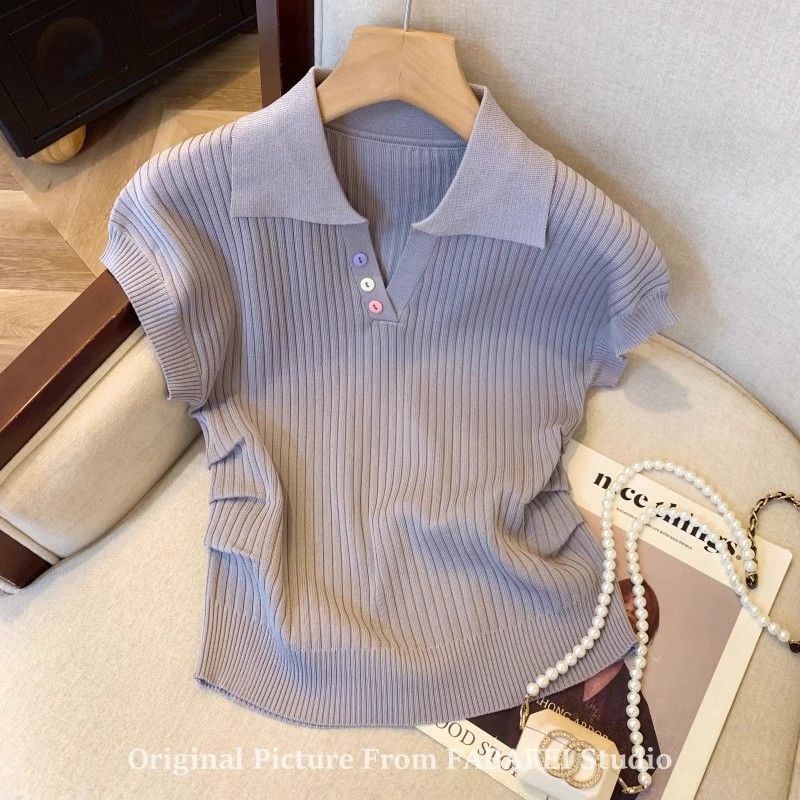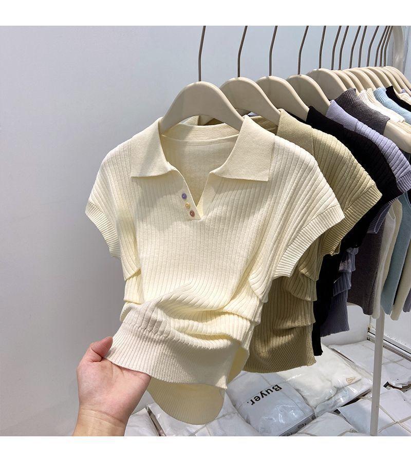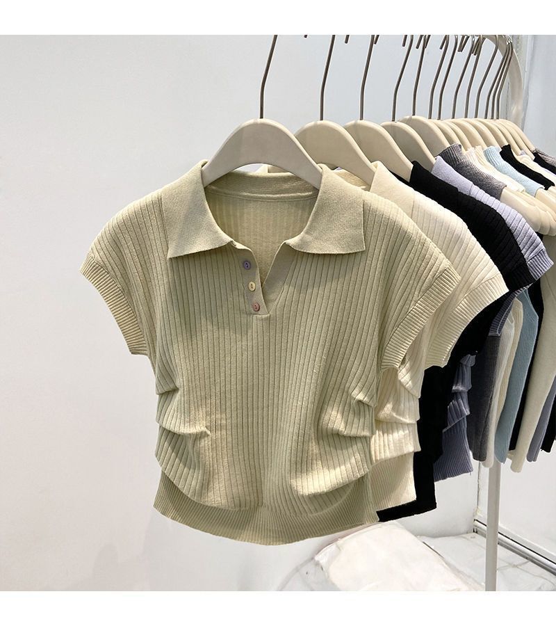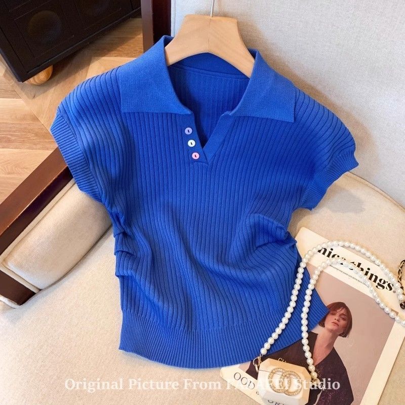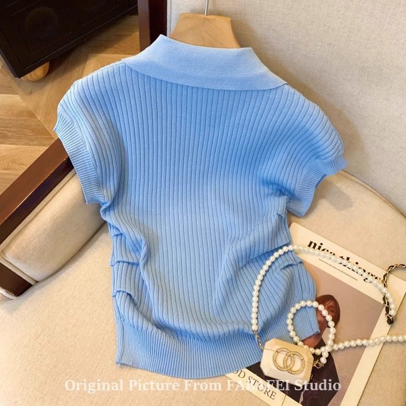 Nuevo Tejido de Punto de Manga Corta con Cuello Polo Delgado para Mujer, Diseño de Verano, Aspecto Novedoso Plisado Adelgazante y Top Elegante
