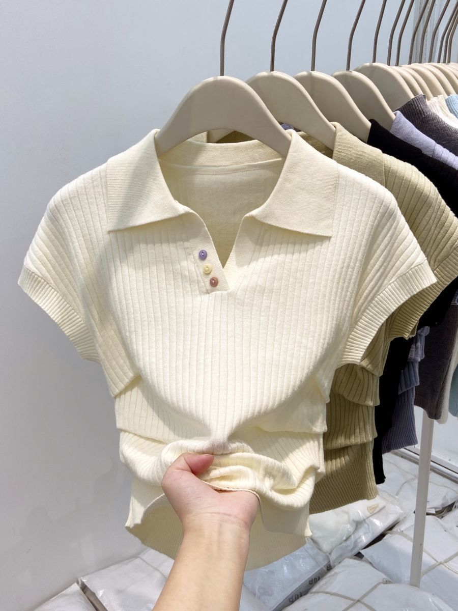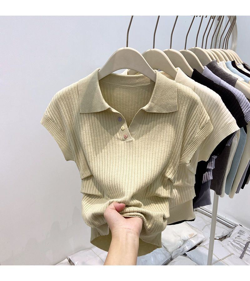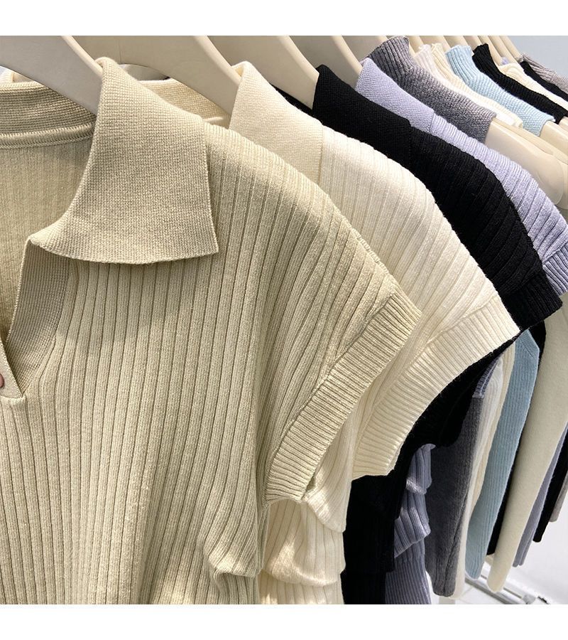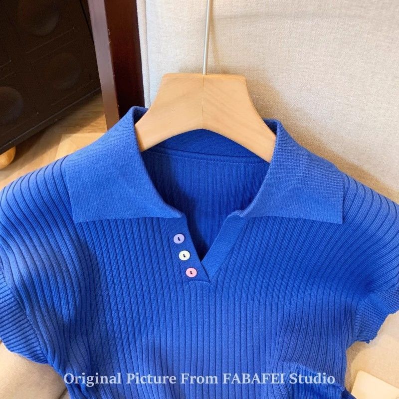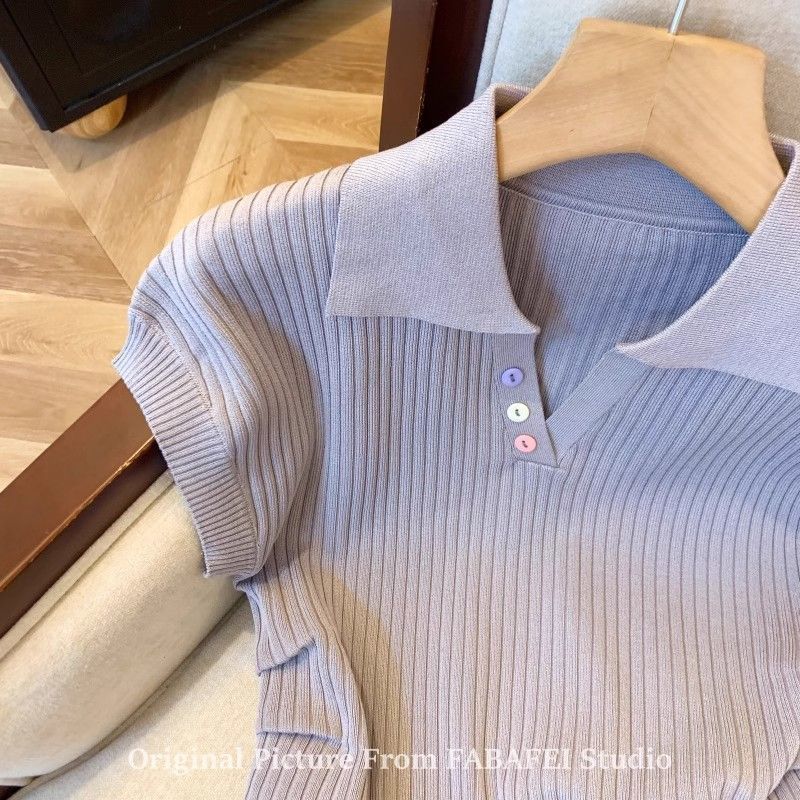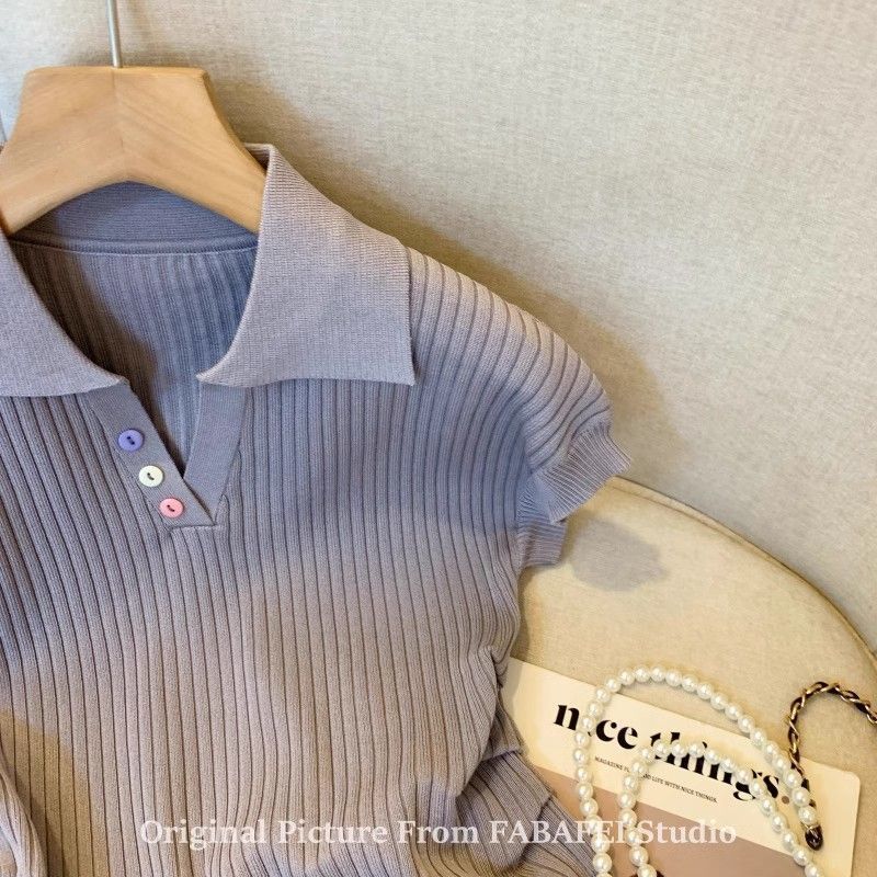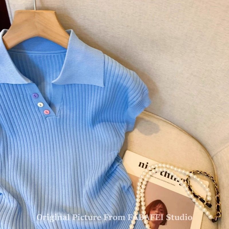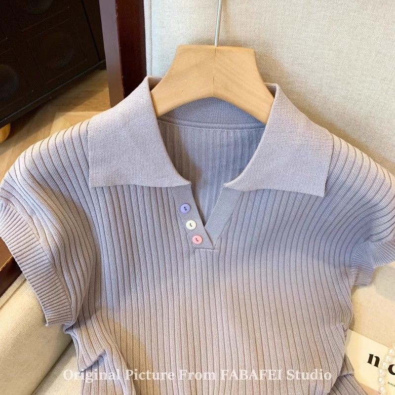 Nuevo Tejido de Punto de Manga Corta con Cuello Polo Delgado para Mujer, Diseño de Verano, Aspecto Novedoso Plisado Adelgazante y Top Elegante