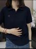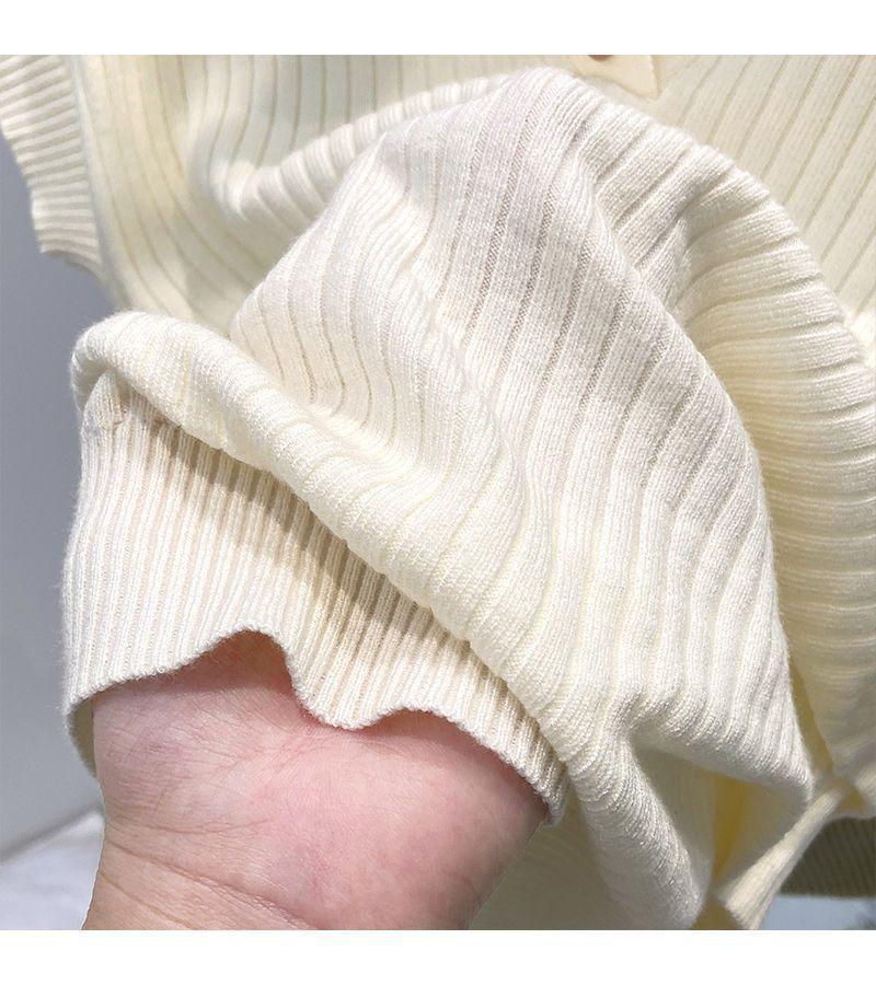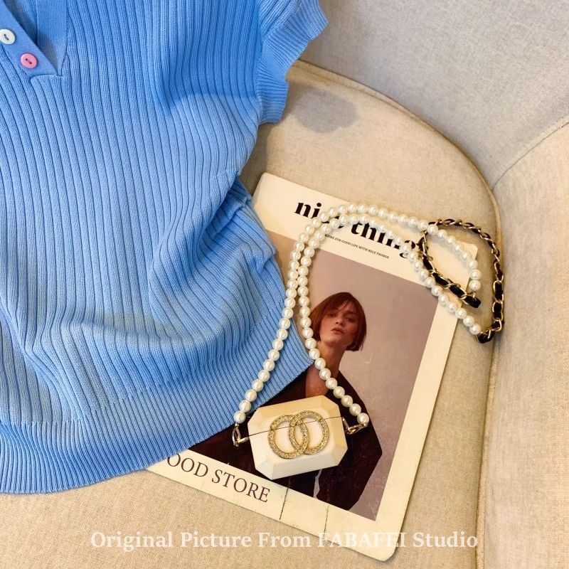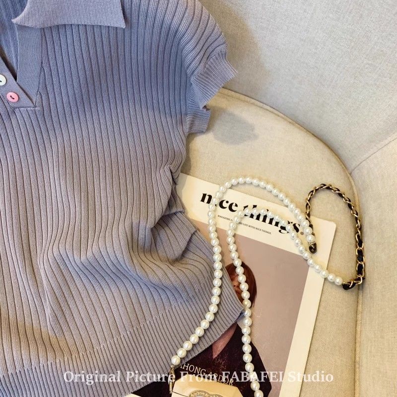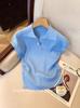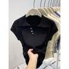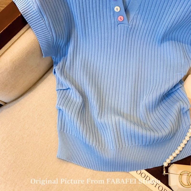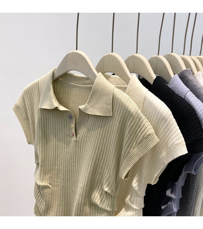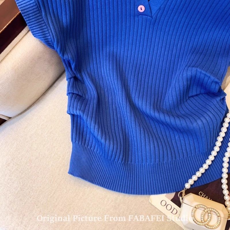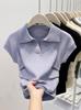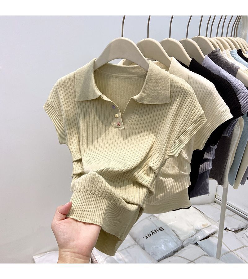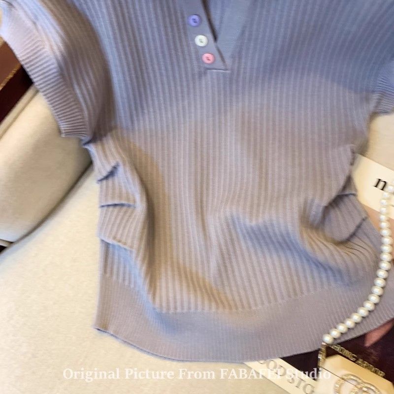 Nuevo Tejido de Punto de Manga Corta con Cuello Polo Delgado para Mujer, Diseño de Verano, Aspecto Novedoso Plisado Adelgazante y Top Elegante