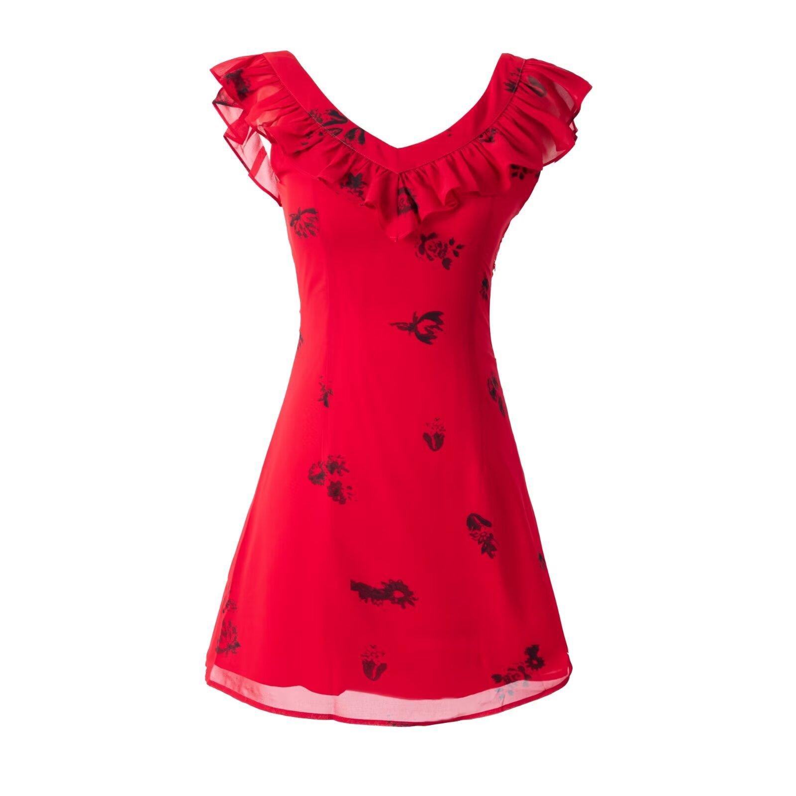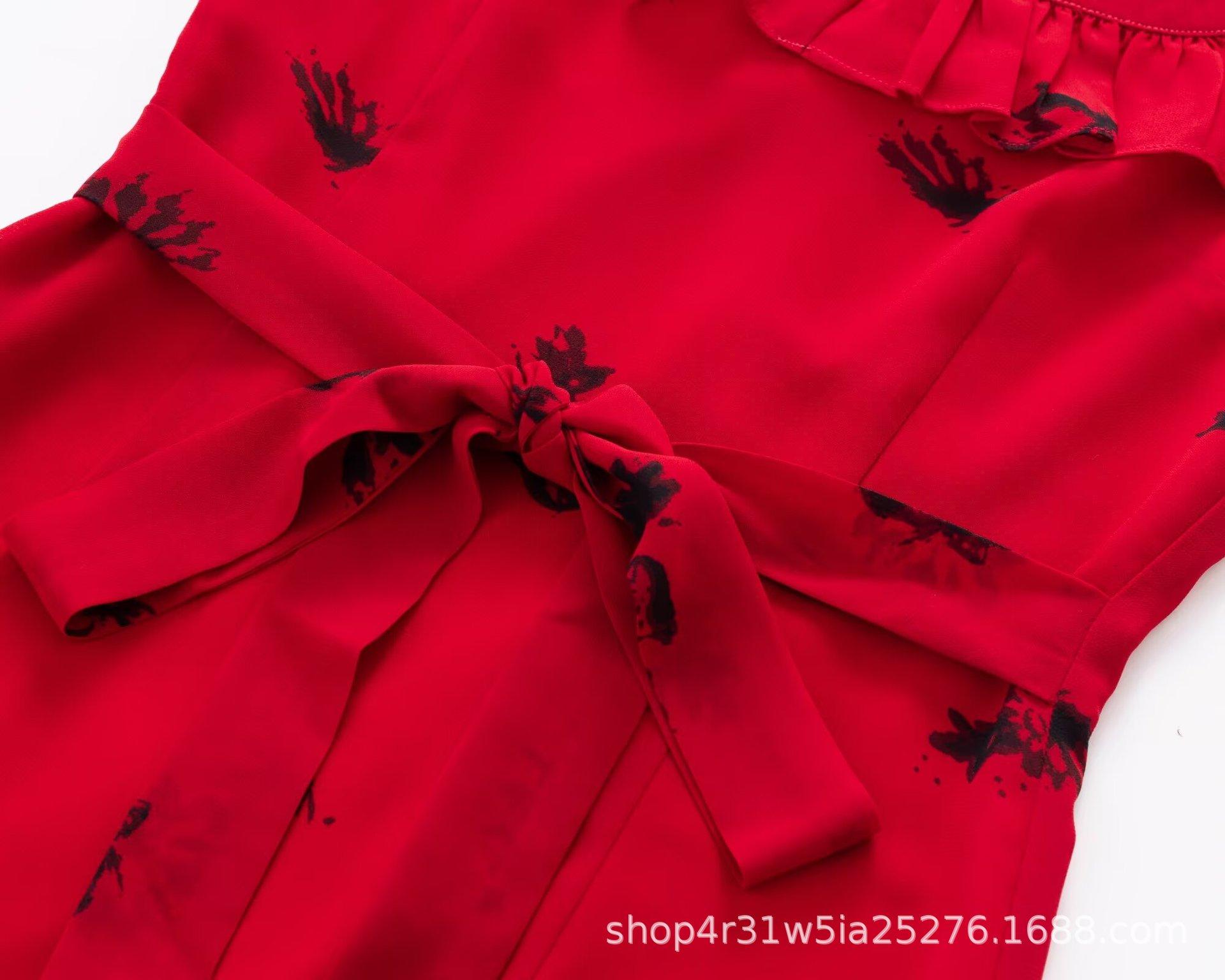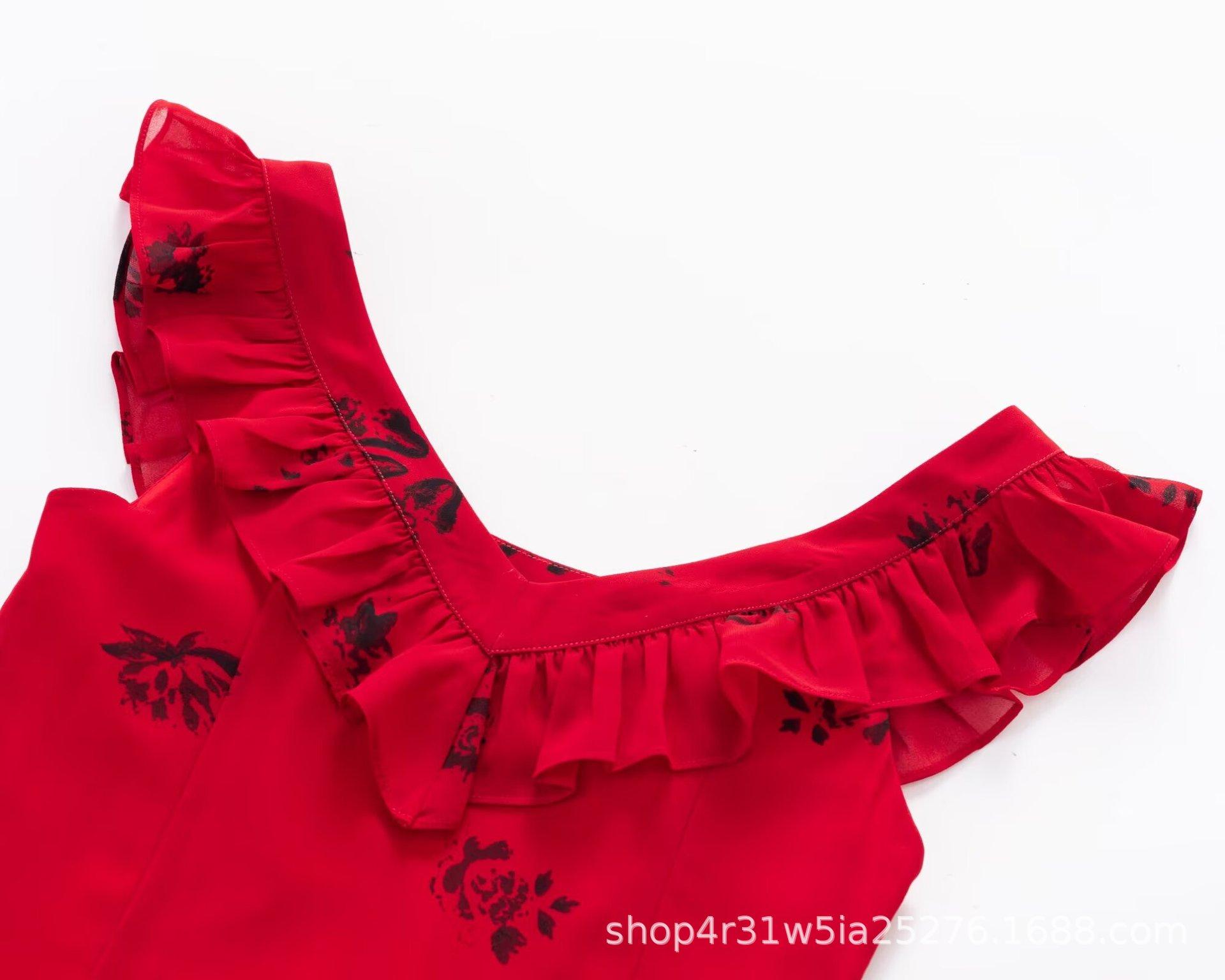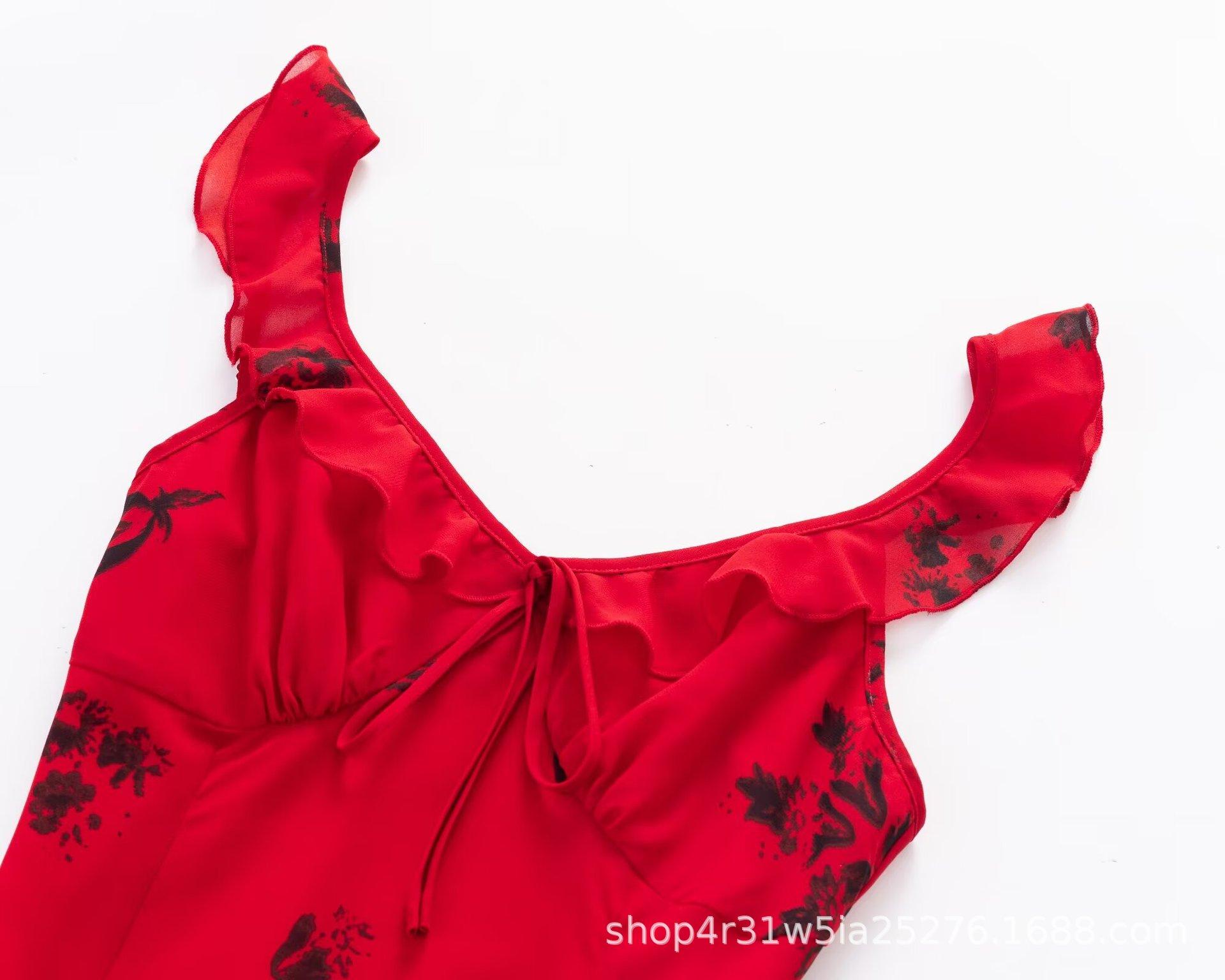 2025 Principios de Primavera Nuevo Vestido Francés Dulce Sexy Cintura Adelgazante Look Corto con Volantes Estampado