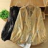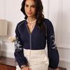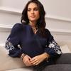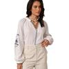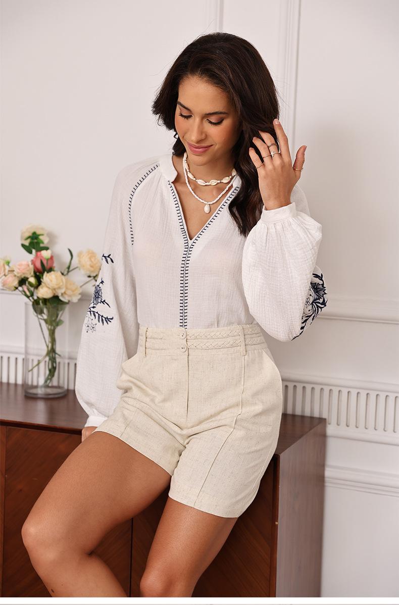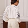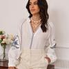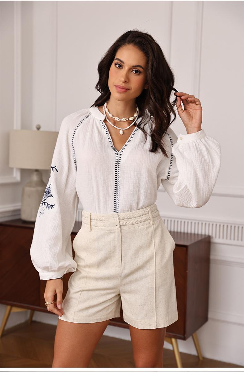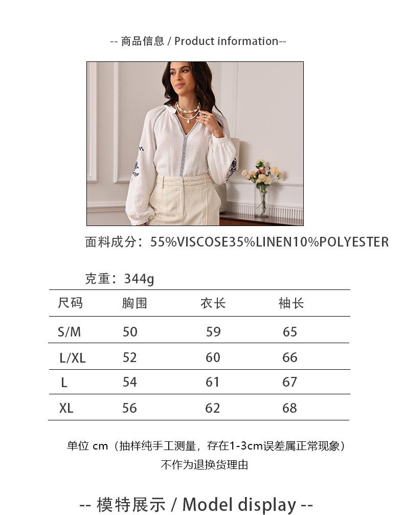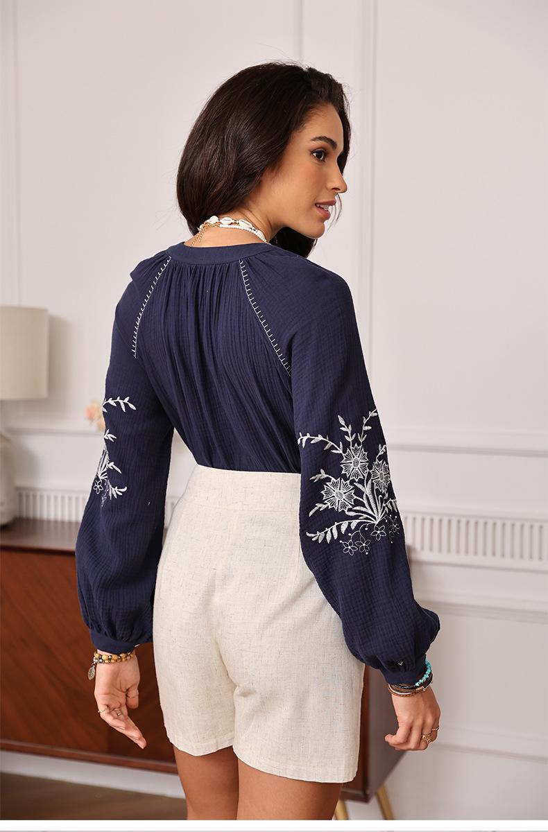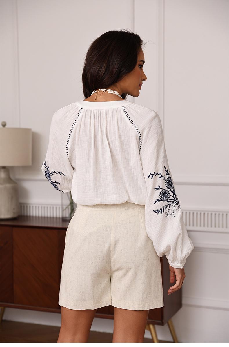 Nicho Francés 25 Verano Nuevo Camisa Bordada Floral para Mujer de Manga Larga con Cuello en V Lino Retro Camisa de Mujer Transfronteriza
