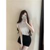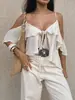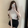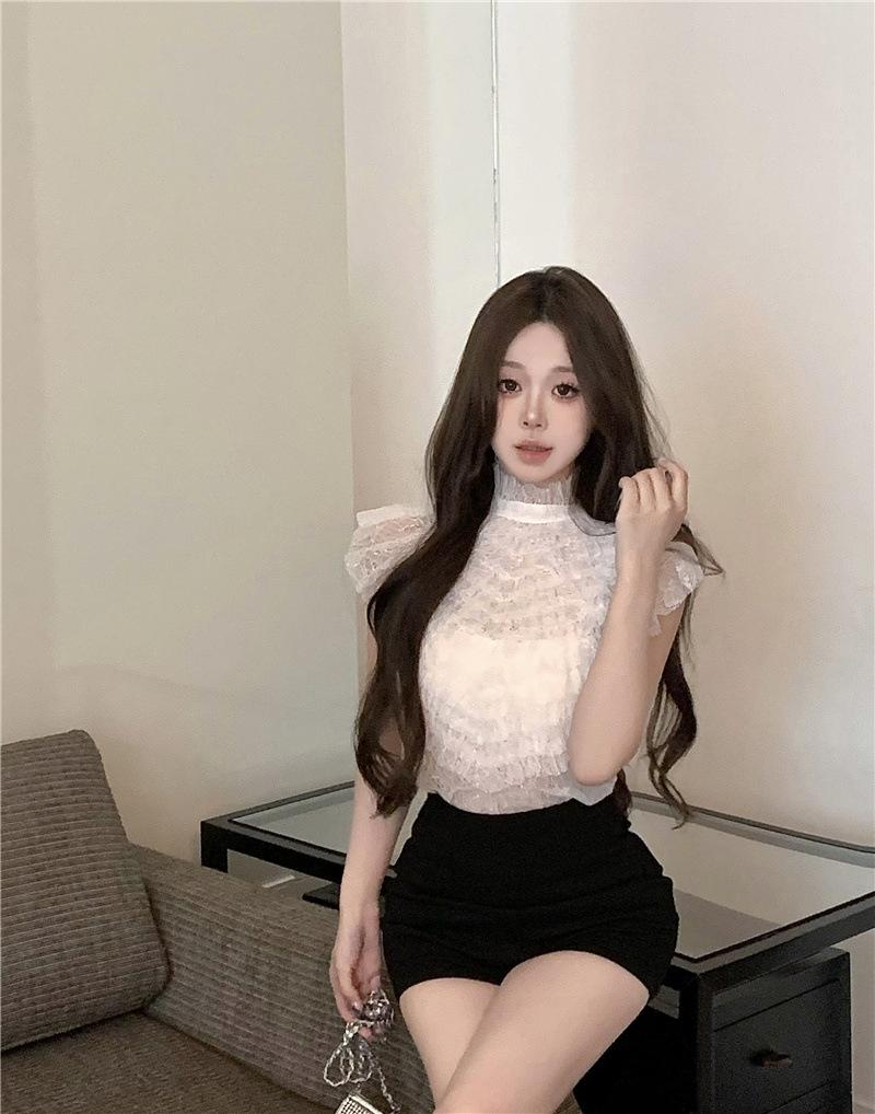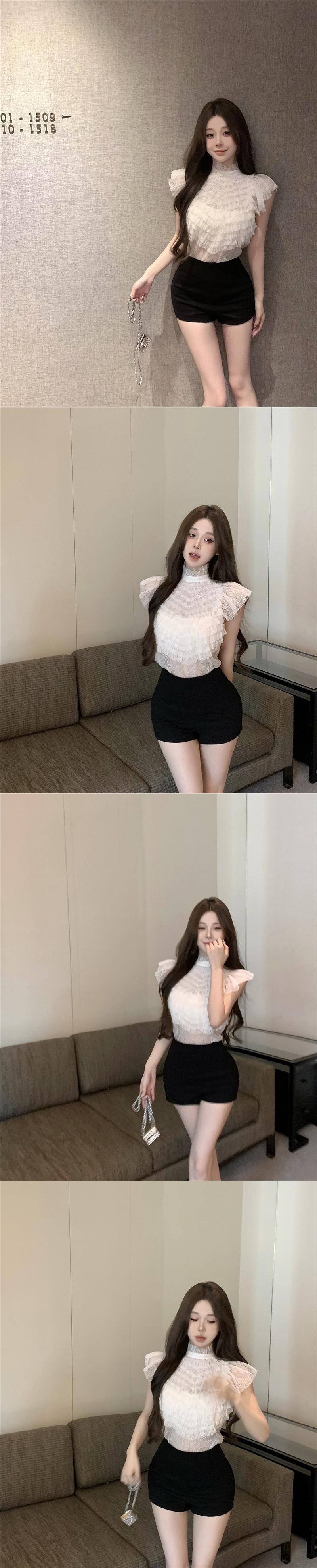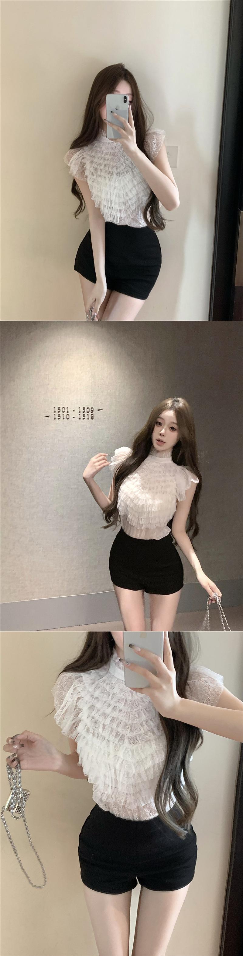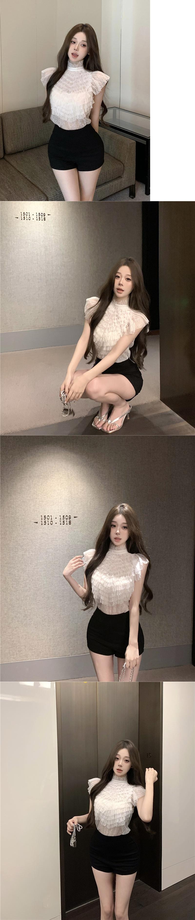 Blusa Elegante de Encaje de Malla Estilo Francés para Mujer, Verano Blanco Cuello Medio Alto Diseño Interior con Top de Mangas Aleteantes Únicas