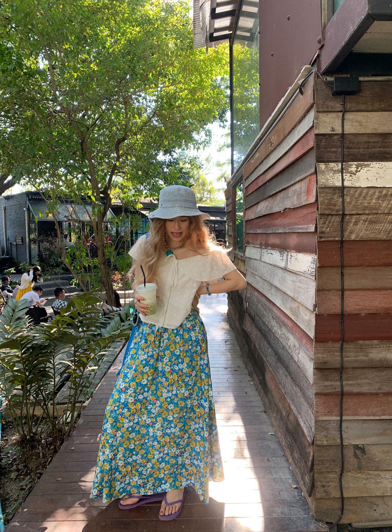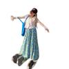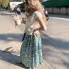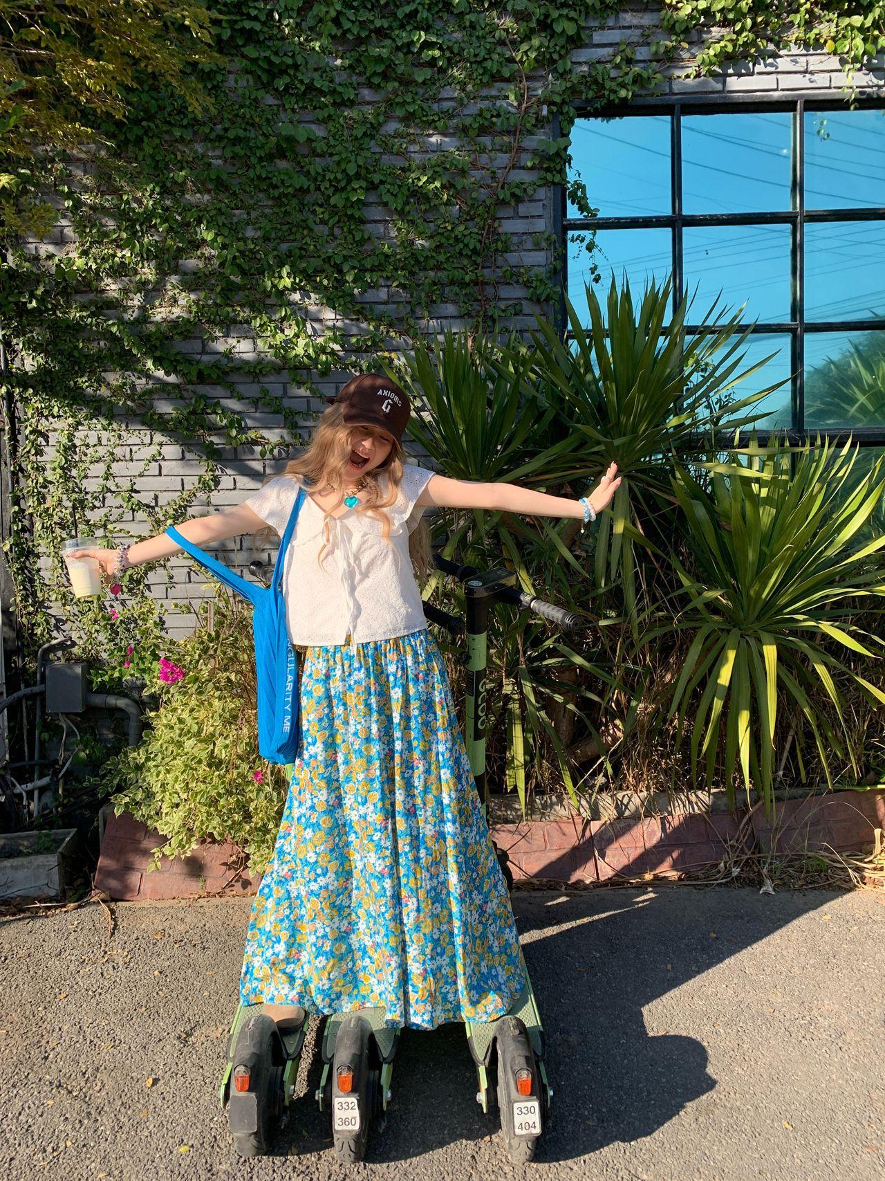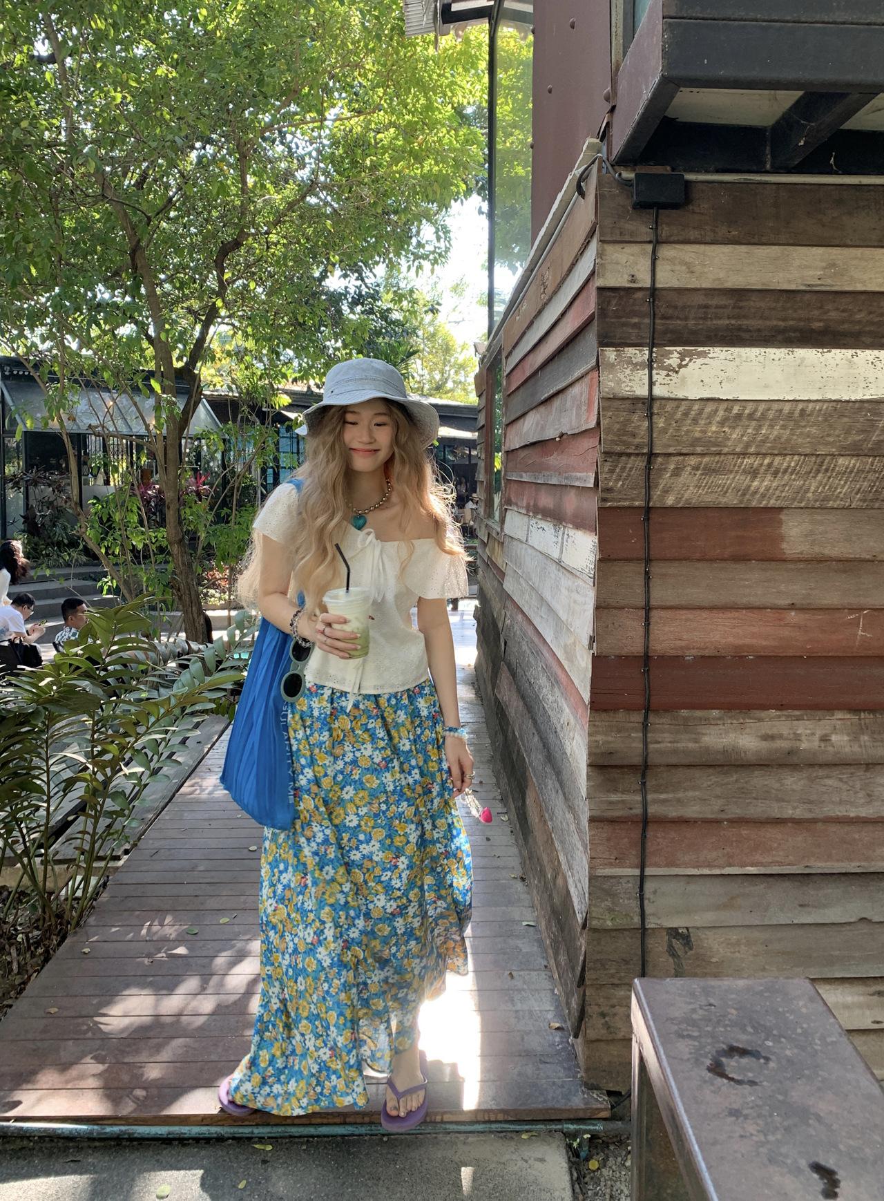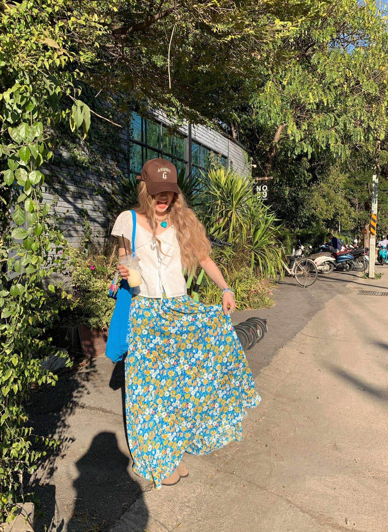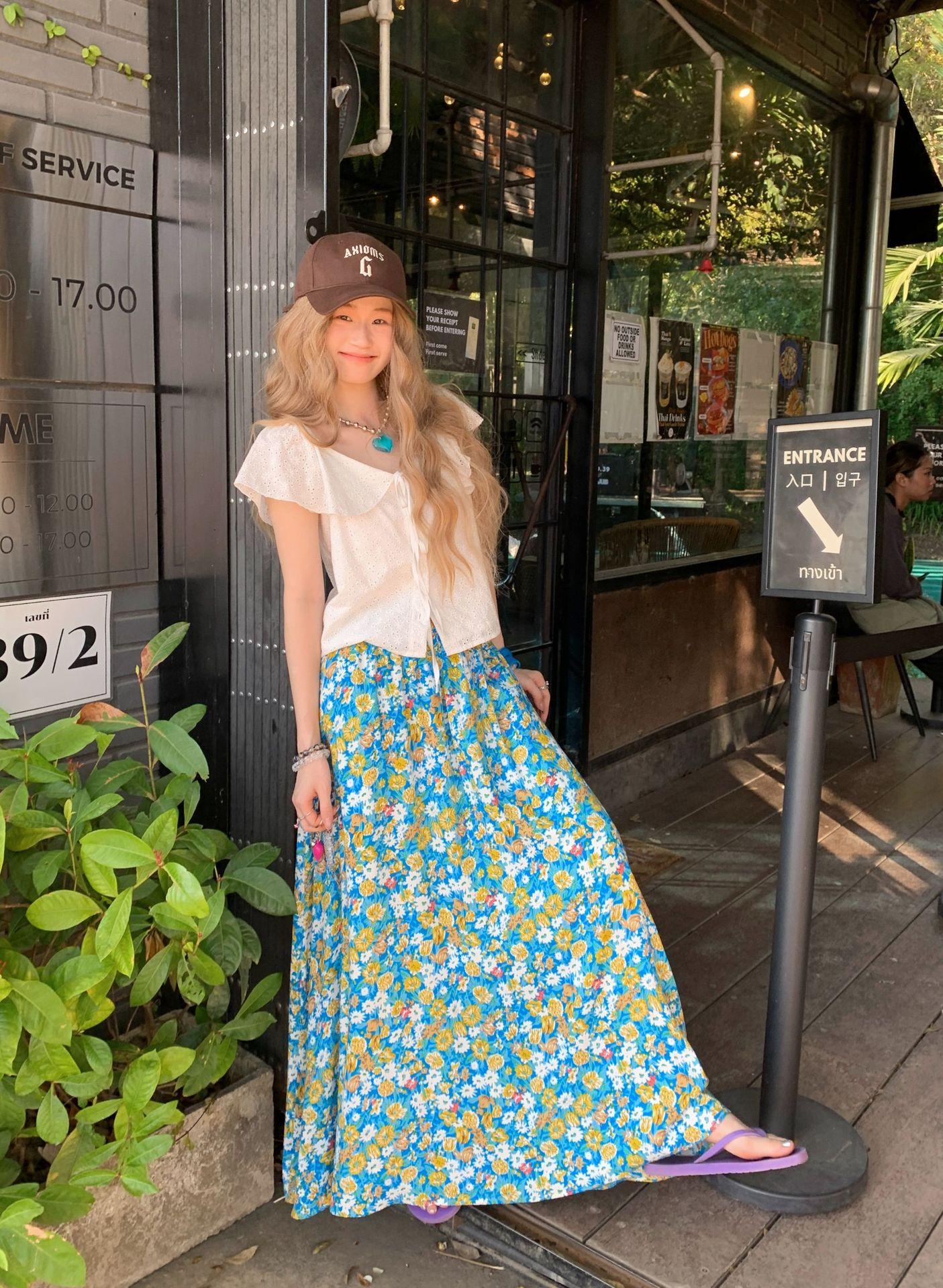 Talla Grande Dulce y Fresca Blusa Blanca de Manga Corta + Falda Grande Floral Estilo Pastoral Falda Larga Floral