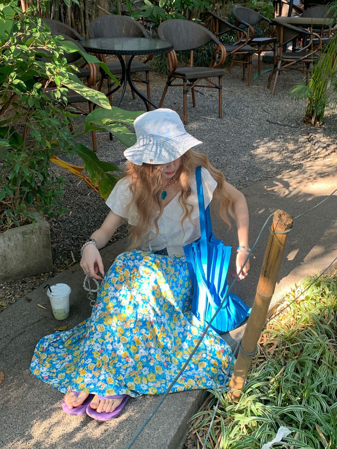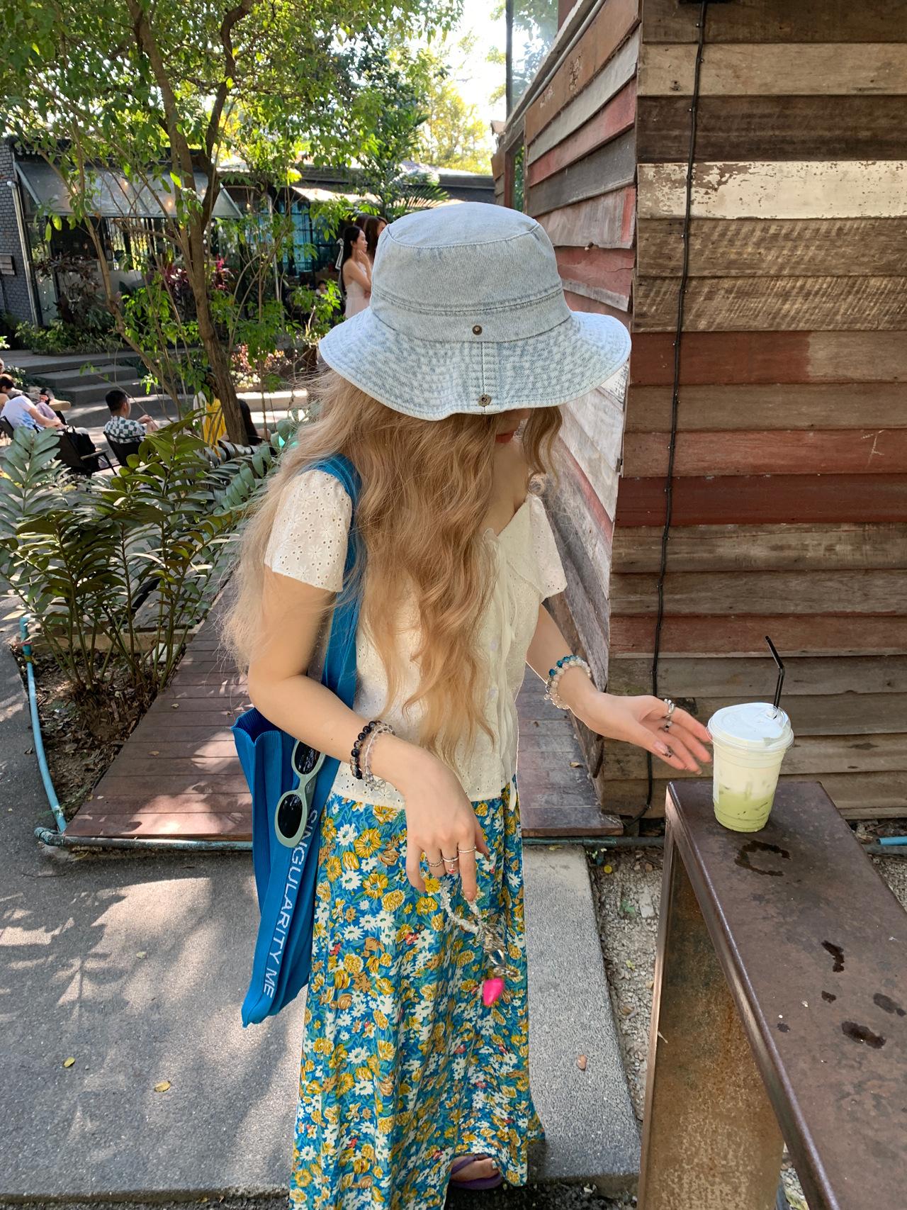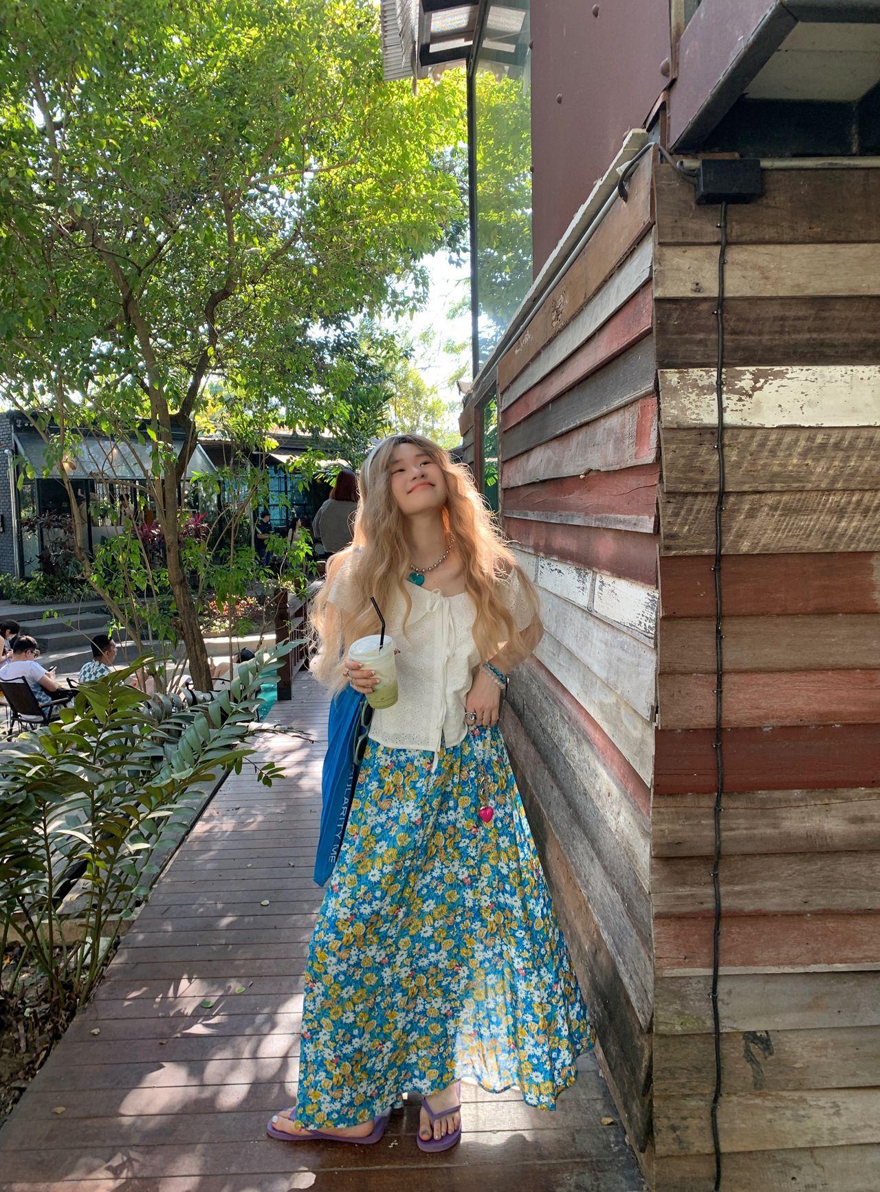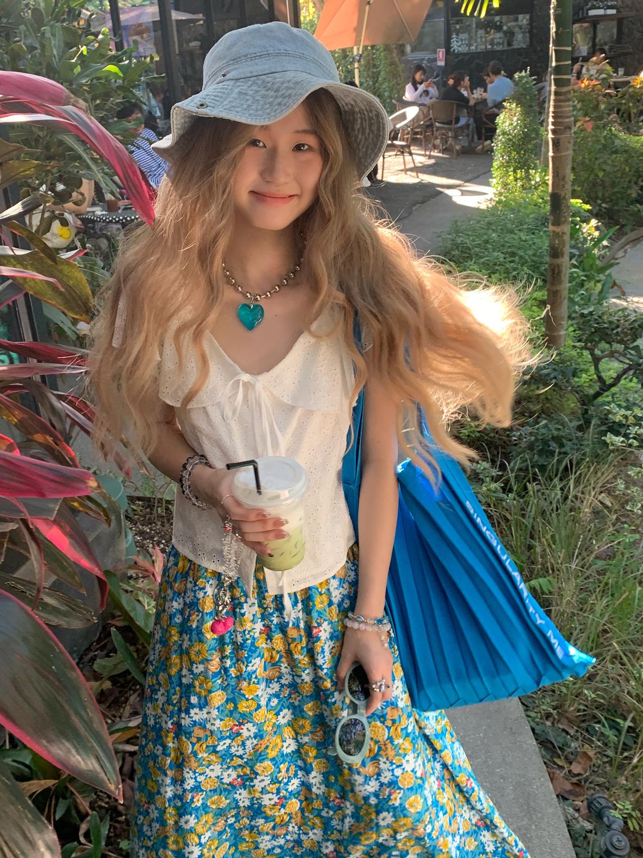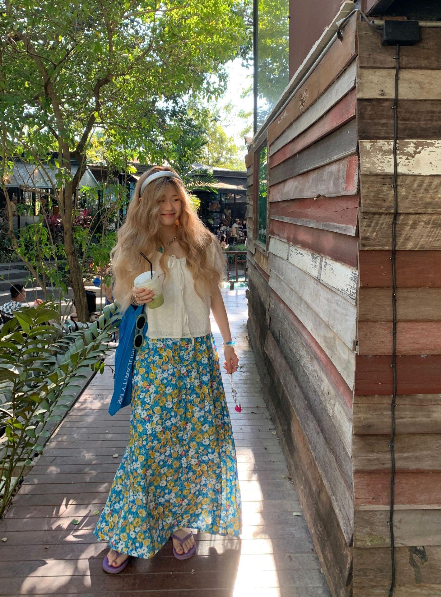 Talla Grande Dulce y Fresca Blusa Blanca de Manga Corta + Falda Grande Floral Estilo Pastoral Falda Larga Floral